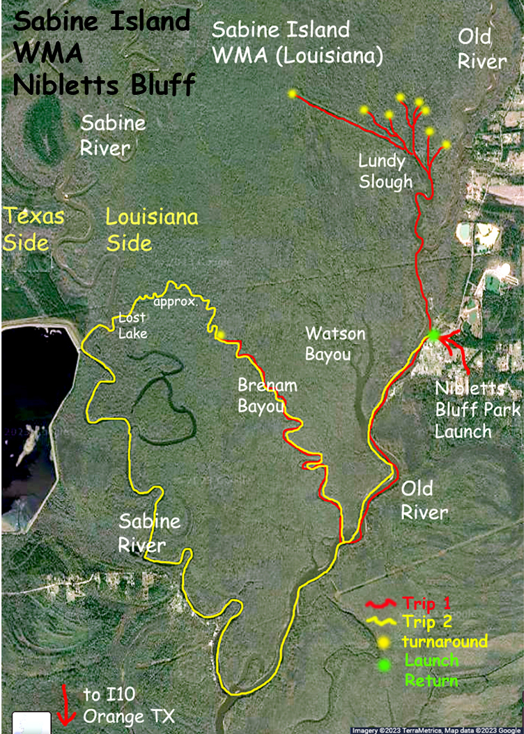 Sabine Island WMA is a large forested island on the Texas Louisiana border just north of Orange. It is bordered on the west side by the Sabine River and on the east side by the Old River. There is a lot of territory that can be paddled here, it’s pretty, it has alligators, and there are little channels, bayous, and sloughs all over the place. I have done several kayak trail routes here, and these are labeled A, B, C…etc. Sometimes this area a bit busy motorboat-wise but you can get free of that into the remote areas pretty quickly. The launch is at Nibletts Bluff Park in Louisiana; this puts you into the Old River about midway up the island. (Do not drive too fast in Nibletts Bluff Park or a serious young man will drop by to discuss it with you 🙄). It’s a bit unclear whether you need a Lousiana WMA permit to paddle the area but I generally go through the procedure. That includes the annual WMA access permit, available online, and for every individual trip a two part day pass which you return when the trip is over. The day trip part can be done by paper permit or phone app. It’s kind of official overkill but that’s the way. Anyway, the Sabine WMA area is worth it, there is so much here to explore.