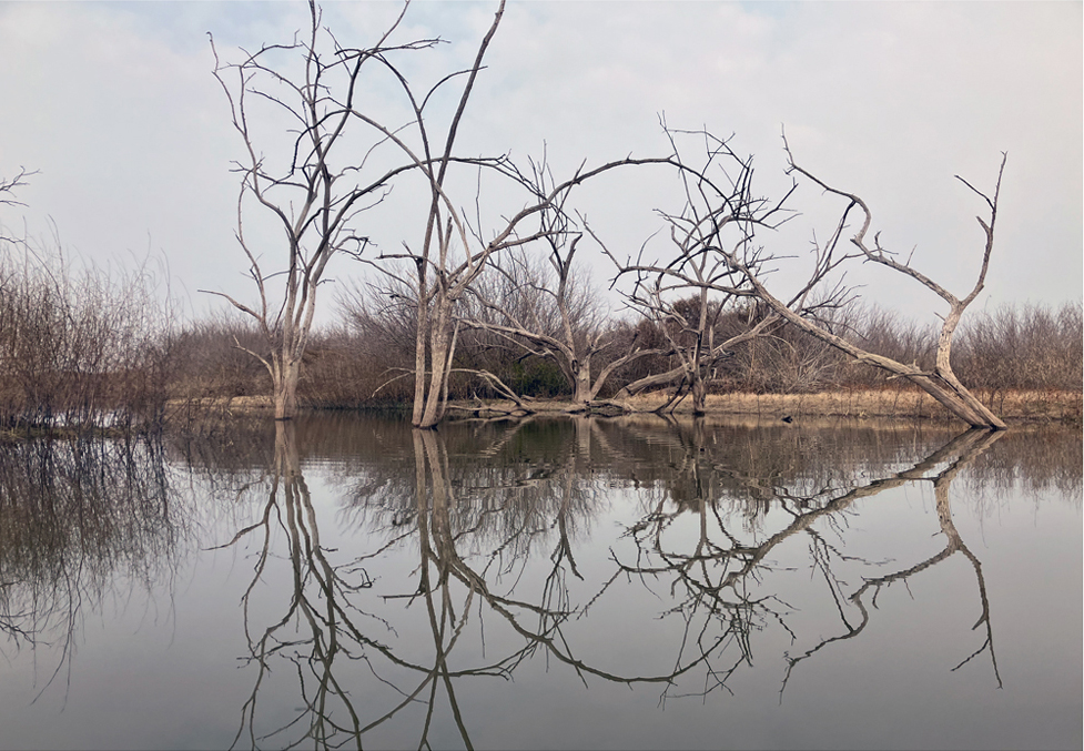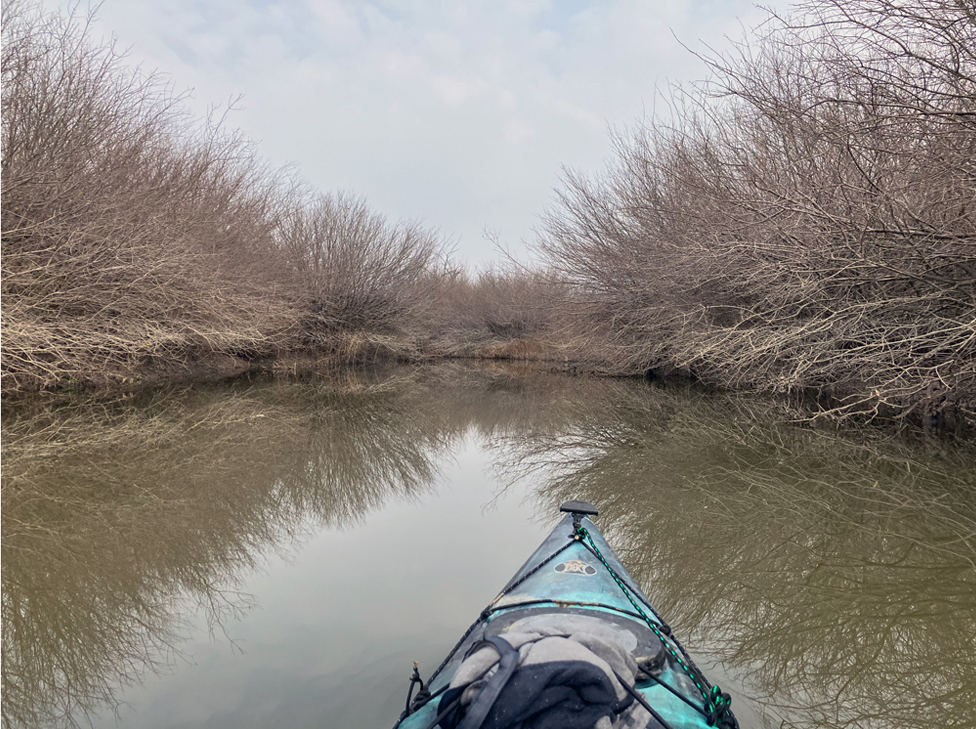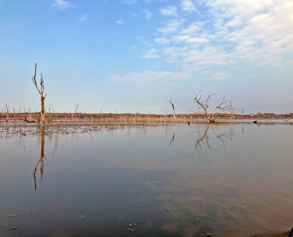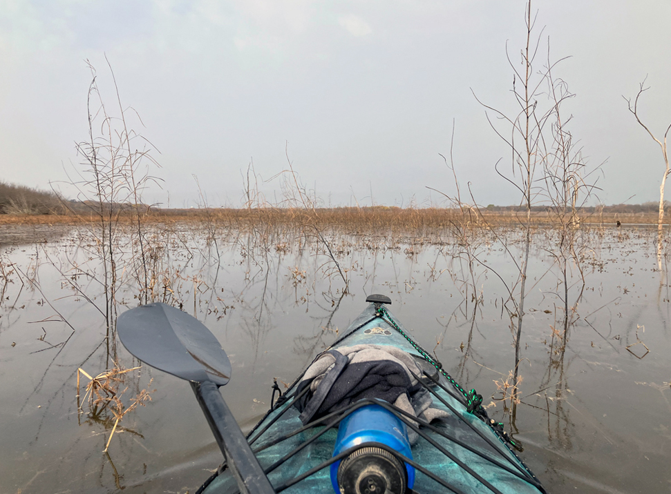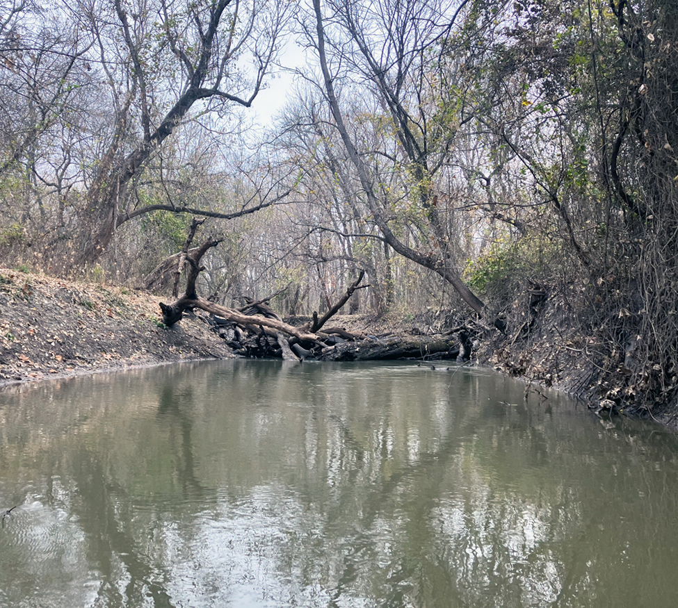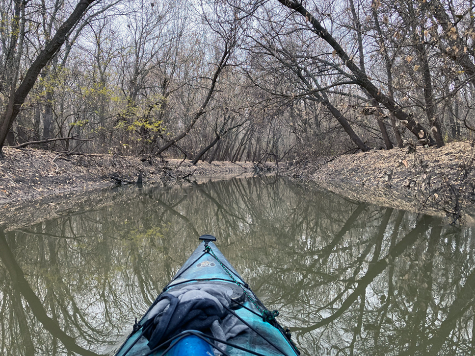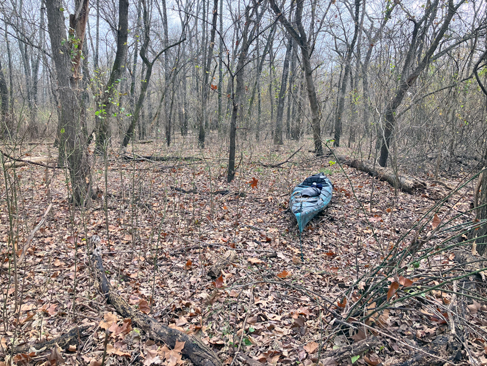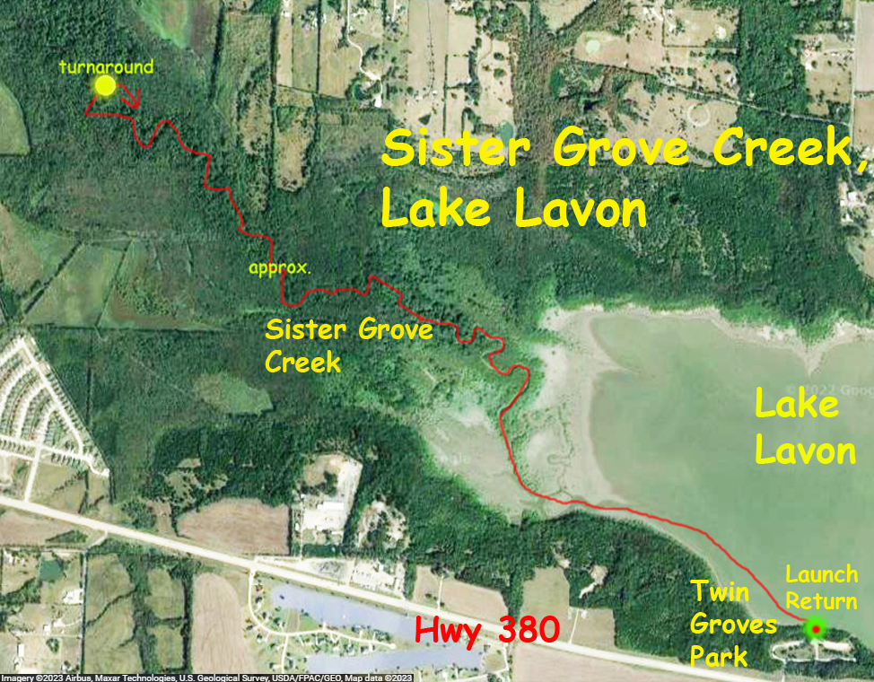 The north end of Lake Lavon, between McKinney and Farmersville, splits into a west side and an east side. On the east side, off of Highway 380, is Twin Groves Park. From the park it is possible to paddle into the two ‘Grove’ creeks, Sister Grove to the left, and Pilot Grove a bit further away to the right. Both creeks are pretty similar, muddy, isolated, and nestled in the forested area above the lake. Both are good paddles and an easy trip from DFW. The above map shows a route from Twin Groves Park into Sister Grove Creek. Really the only thing to decide is how far up to go, and that depends on how many log jams you care to deal with. This route didn’t go too far.