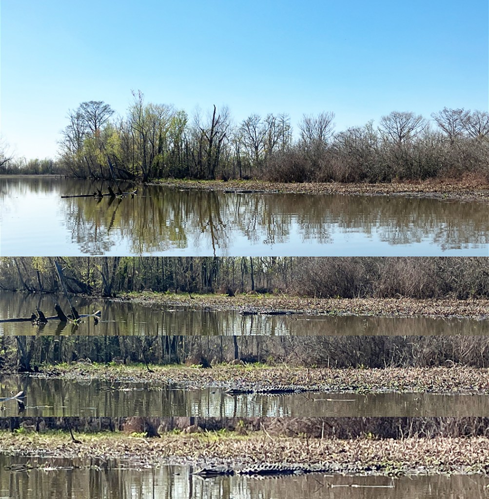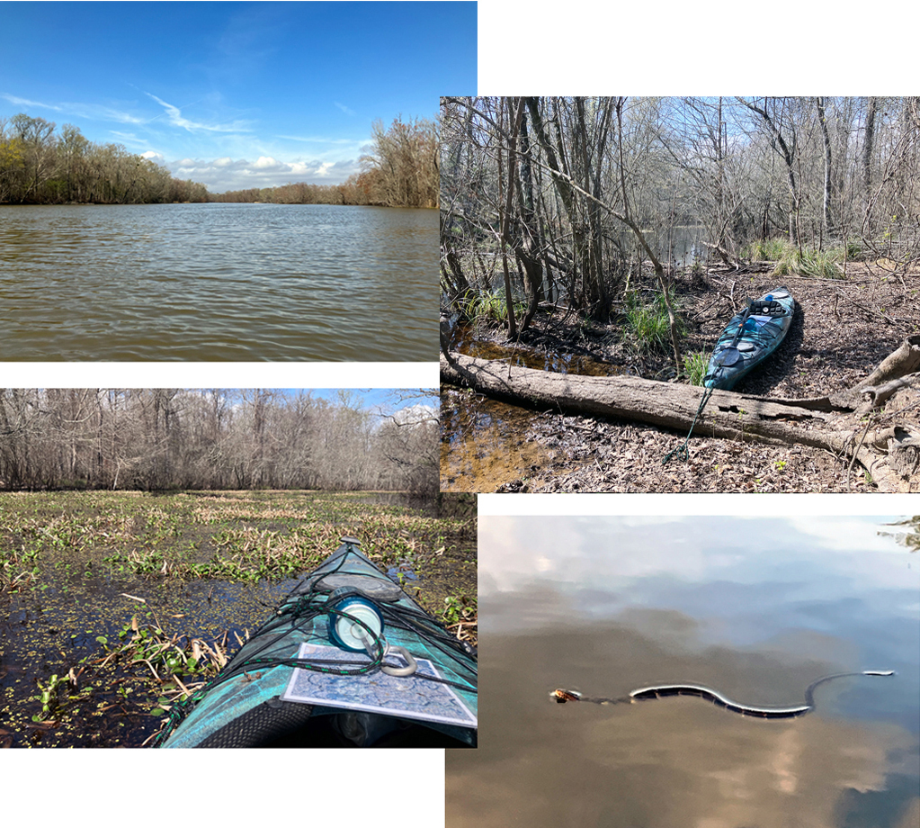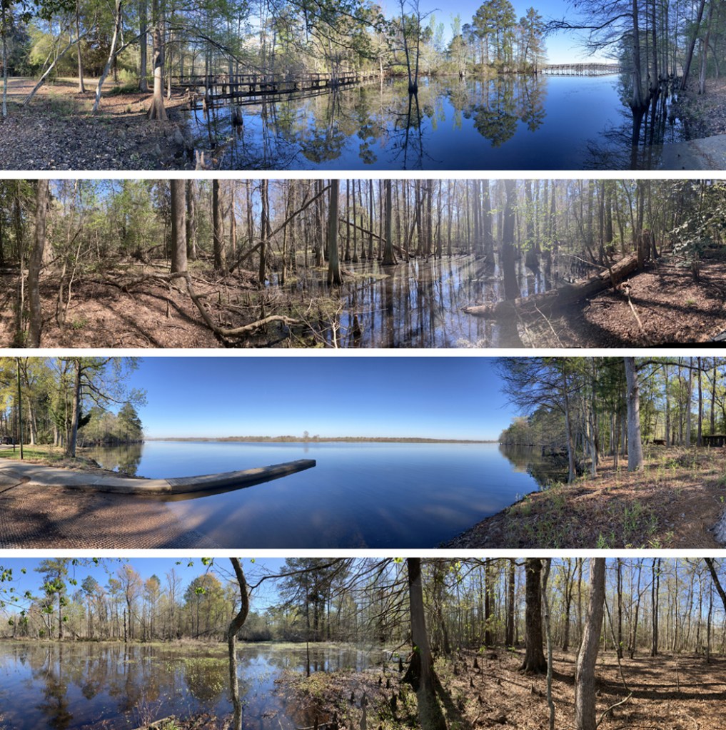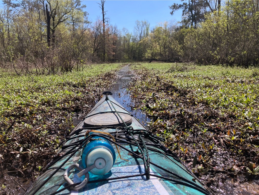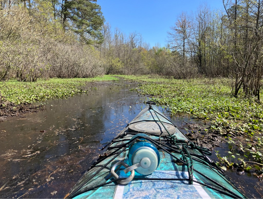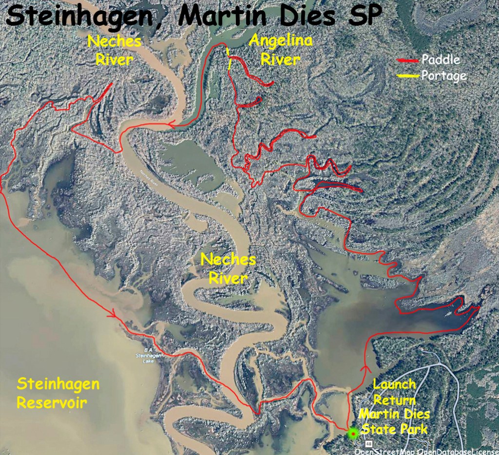 Steinhagen. This is another paddle route up into the Angelina and Neches River starting from the Martin Dies State Park boat launch. This route initially hugs the east shore of the lake before entering the forest. How close you can to the shore get depends on the level of salvinia, hydrilla etc. The route then works its way north and explores the tangle of channels on the east side of the Angelina river. This area is confusing and it takes time to sort out the intersecting channels. Some look like they could go further but they terminate, usually due to salvinia overgrowth, and you can only go so far. And there are alligators in the weeds! After a couple short portages, shown in yellow, I reached the Angelina River. The route then goes south and, rather than do a flatwater paddle on the river (called the Neches after the confluence) all the way back, it splits into a little known channel that winds down to the reservoir. In another trip I explore this area more thoroughly. After exiting the channel into Steinhagen Reservoir it’s pretty straightforward to paddle back to the park. This was an intricate and challenging paddle. Great! This area is one of my favorites.