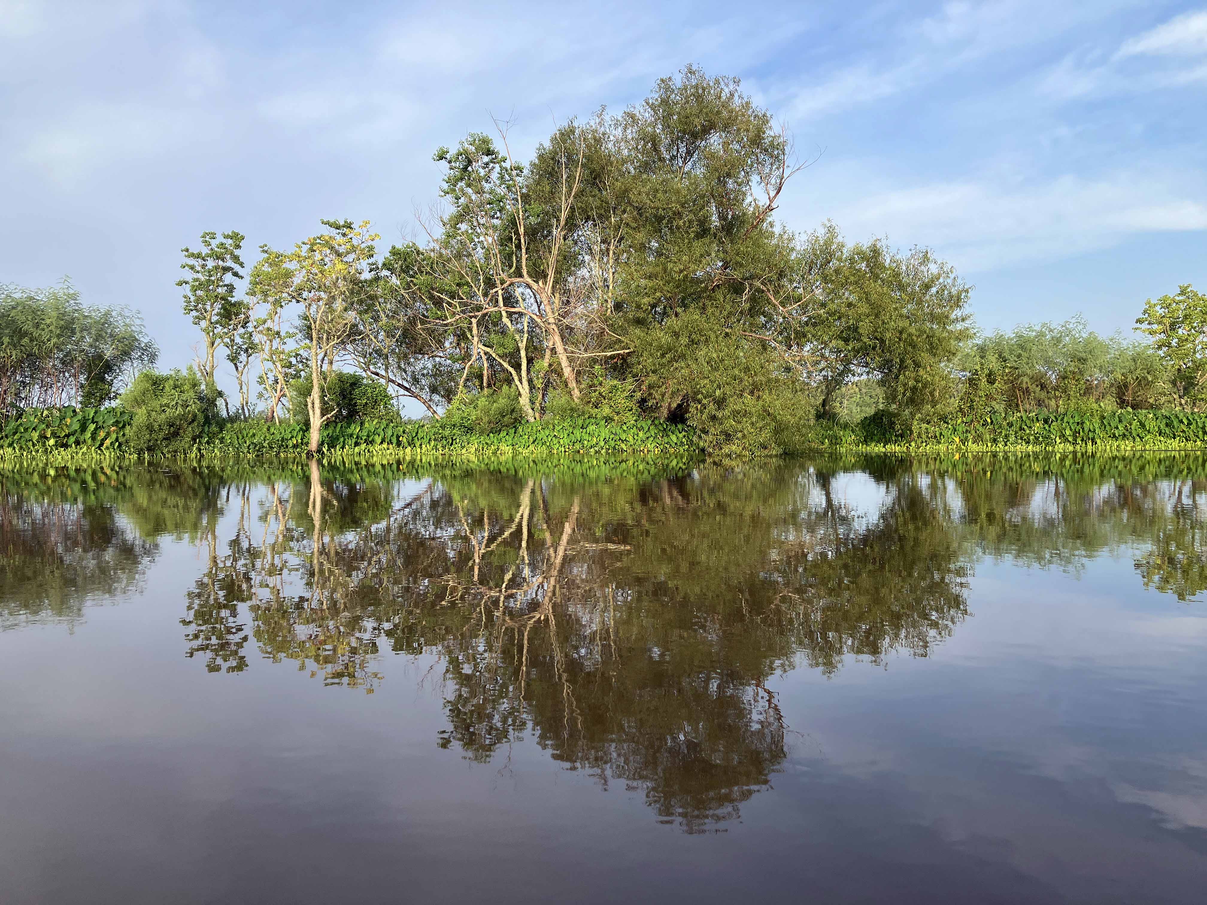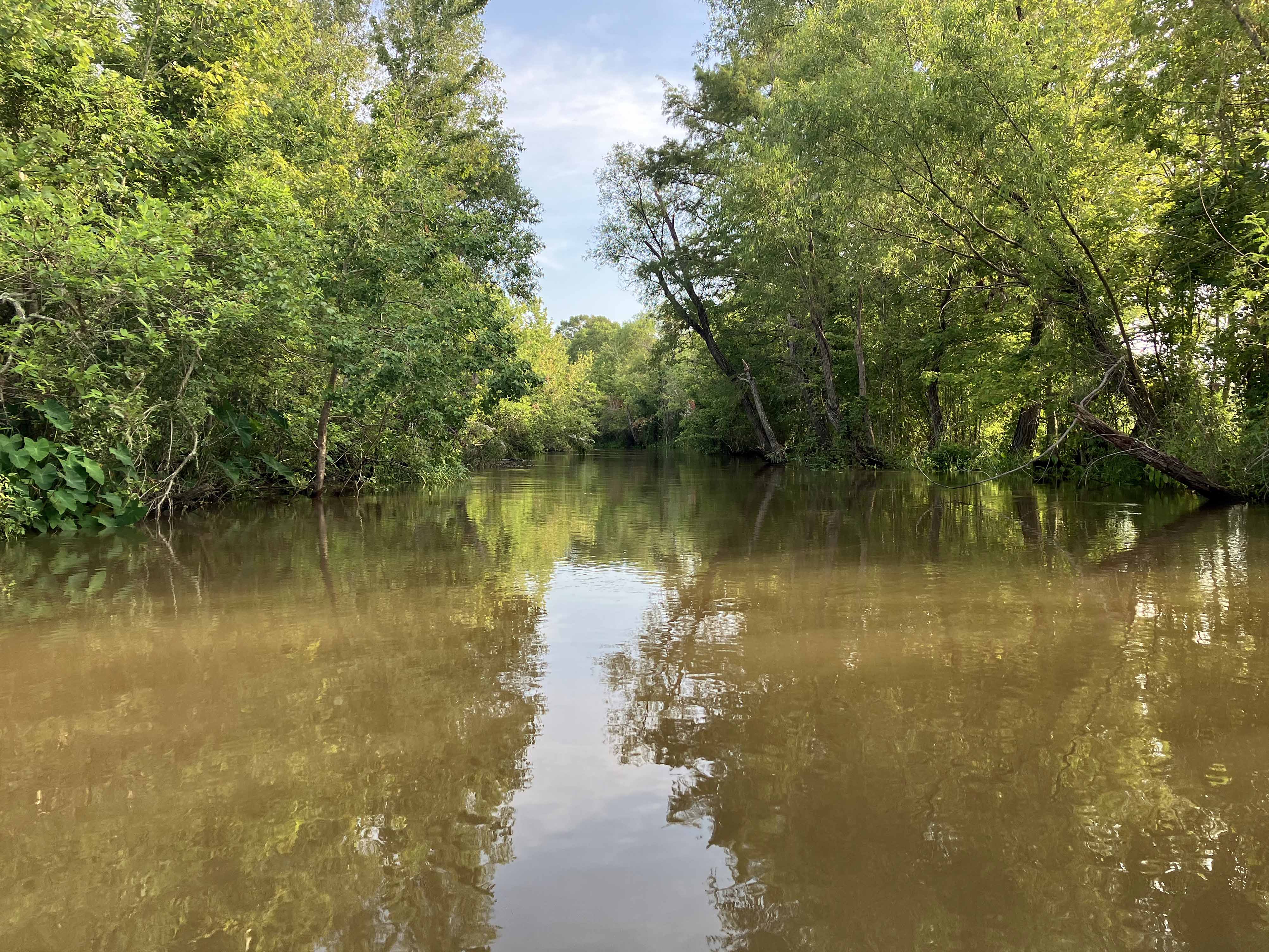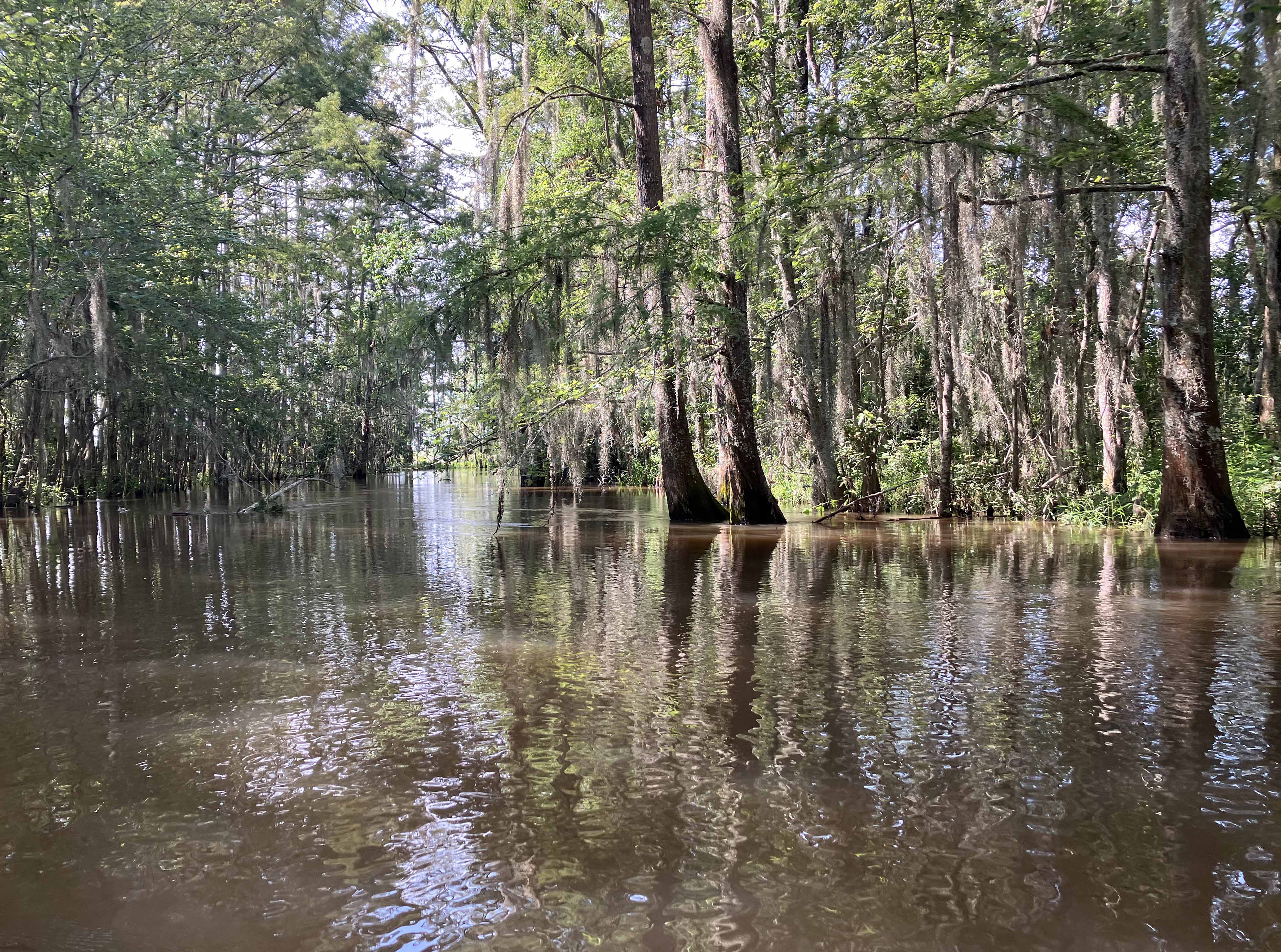 Kayak route at Steinhagen Reservoir, Martin Dies State Park. The reservoir was at full pool and the Neches was flowing pretty strong. This trip was mid summer after a wet windy spring and after Beryl. The channels within the swamp are usually pretty narrow but this time they held a lot of water and were flowing strongly. There were trees down in places, or tilted over, from strong winds earlier in the year, and the woods looked like they had flooded pretty good. It felt like the area needed a bit of a breather. In addition to checking out paddle paths in the swamp the route also went down to the lake, just to mix it up at bit. The arrows on the red route lines show the directions. There was almost no salvinia, surprisingly, but there was a lot of water hyacinth (even worse), and alligator weed. Cool weather for a summertime trip though, and some nice pictures.