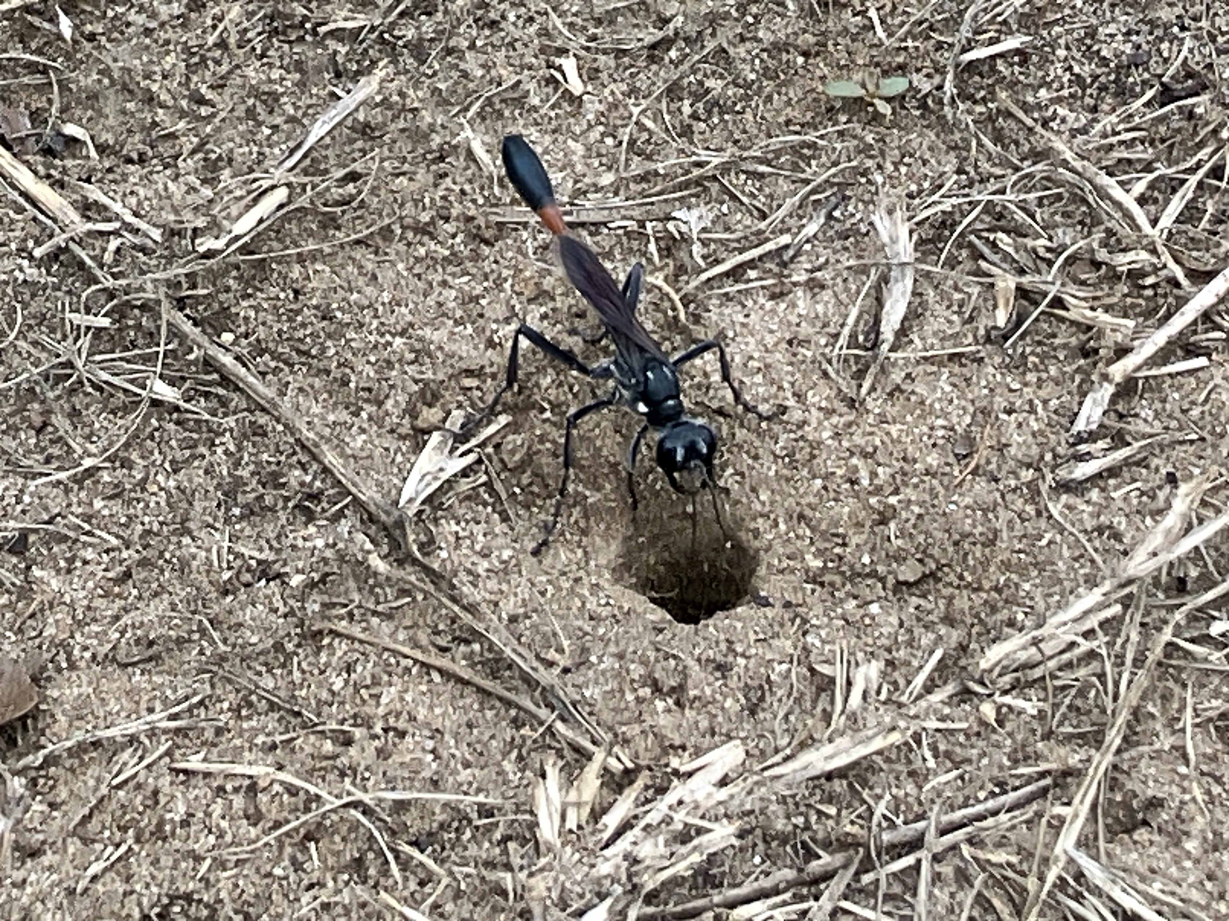 Above: Thread waisted wasp I think. It pulled a sedated? caterpillar down this hole, buried it alive, and then carefully eliminated all traces of the crime.
