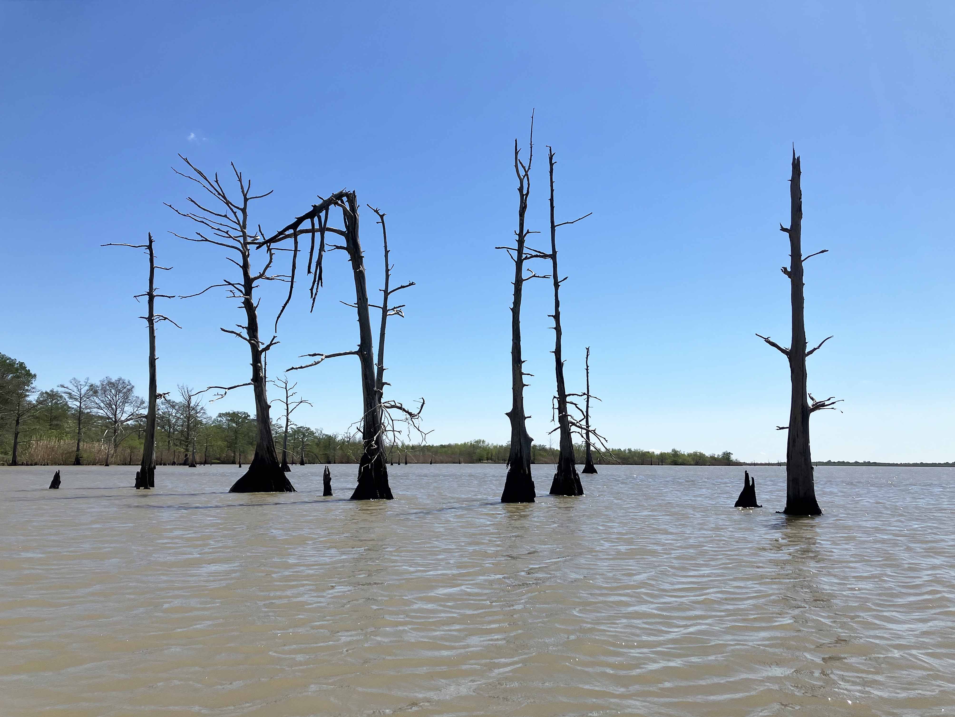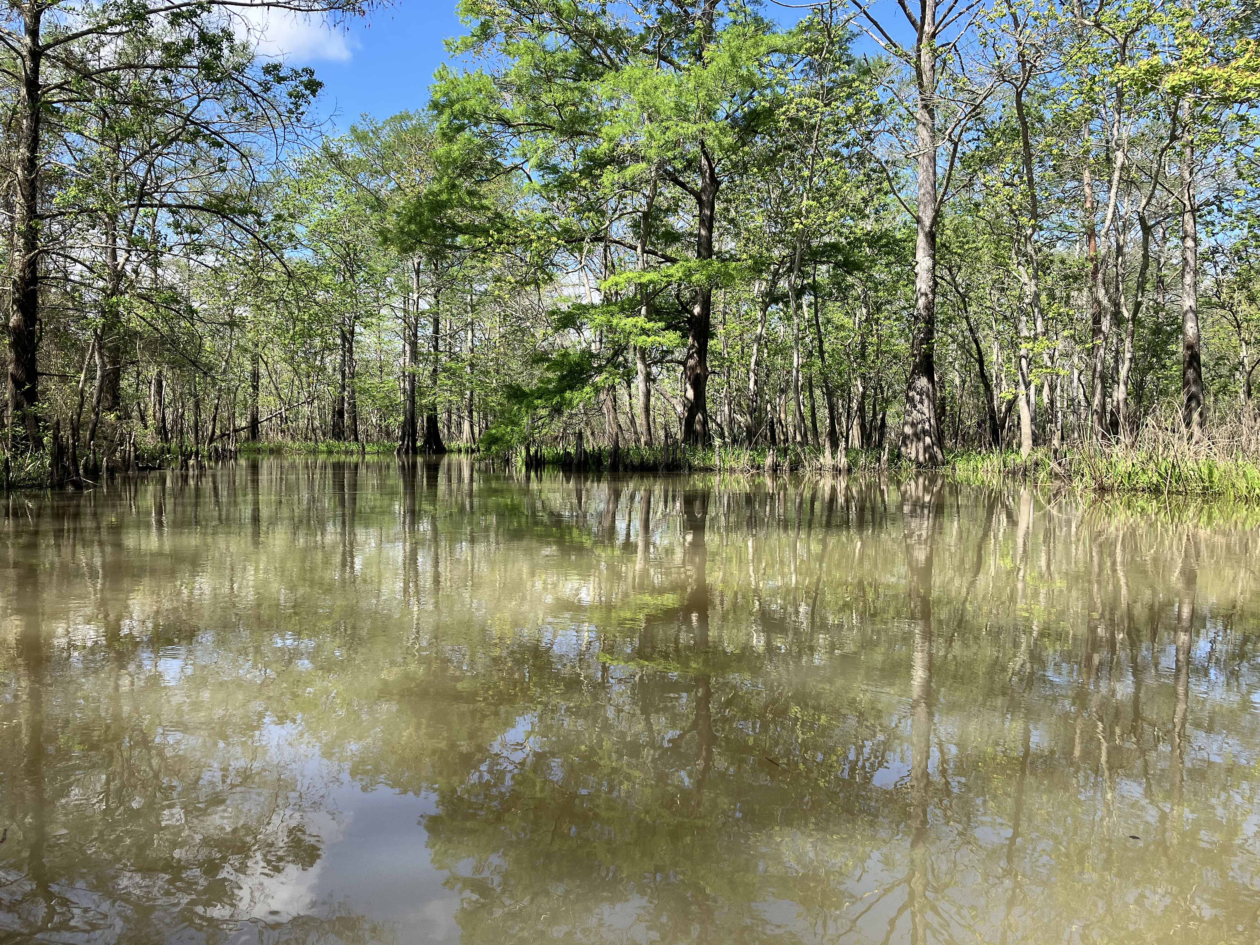 Kayak trip launching from Hugo Point Park near Cove on I-10, east of Houston, going up into the Lost River and Lost Lake areas. This trip is a kind of a general check things out paddle, see where it’s possible to go. It stays west of the John Wiggins Bayou that was explored in another trip. The route includes a nice tight channel on the north end that connected Lost River to Lost Lake, and explores a rather odd, enclosed, geometric structure east of Lost Lake that may have once had something to do with oil or gas but I don’t know. The trail finally tracks back along Lost River to the launch. The water for this trip was high and many side channels were available open for paddling. Surprisingly, water levels the next day had dropped dramatically. I am not quite sure how the water level in this area is determined and how it relates to flow control on the nearby Trinity but there may be some (inverse) logic to it. Alligators are everywhere here and I saw some really tiny ones (with large parent). Lots of possibilities for exploration here, the place is great.