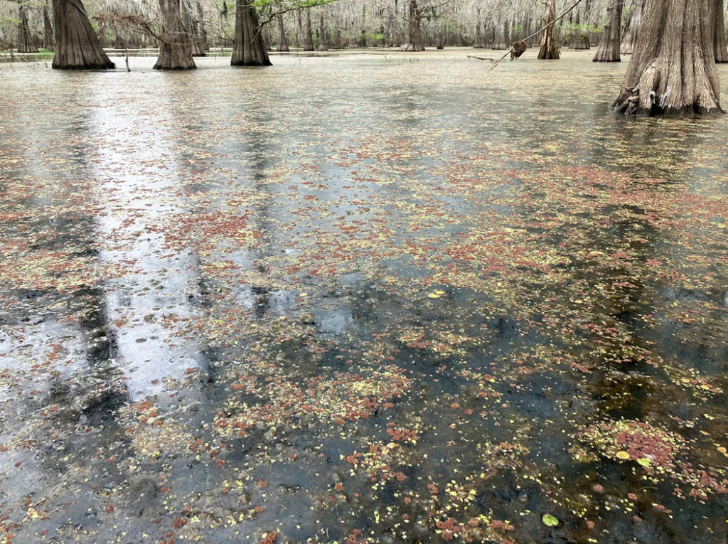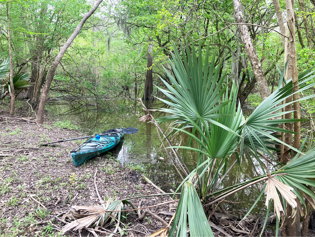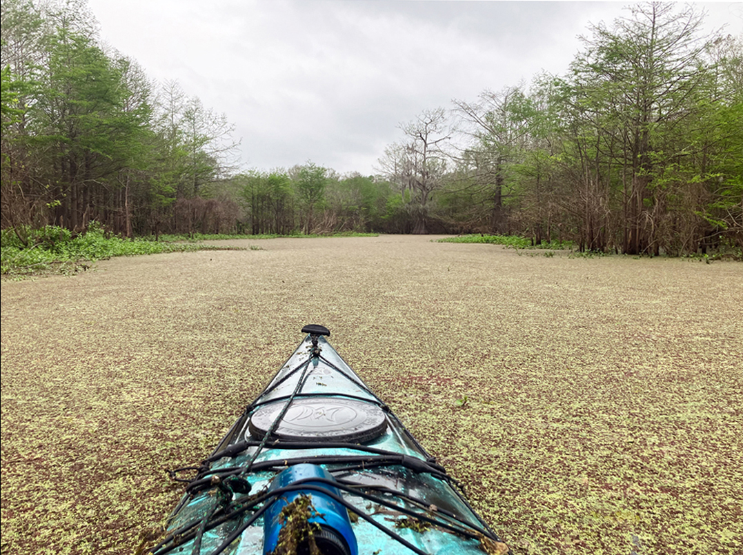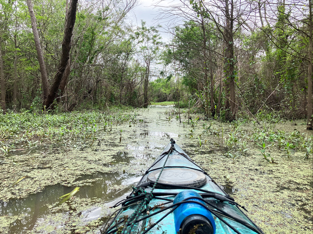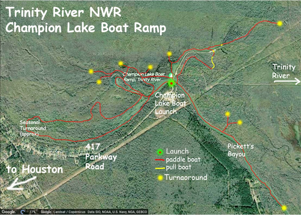 The Trinity River National Wildlife Refuge Champion Lake Unit is located at the end of 417 Parkway Road and is geographically just north of the Trinity River Bottom/Trinity Bay area east of Houston. There are two boat launches, one to the north into Champion Lake and the other to the south launching into Pickett’s Bayou. The paddle routes in the map above are a kind of catch-all try everything exploration the first time I was there. The lake is filled with trees and bushes and so from the map its not even clear that it is a lake at all. The routes are kind of ‘make it up as you go’ and depend in part on what areas are covered with aquatic vegetation. Because of nesting birds the west side of the refuge is only open part of the year, and there are signs indicating that. There is a numbering system for hunting spot assignments; following the signs can serve as a channel guide. I tried exploring here and there and so there a lot of yellow dot turnarounds. In another trip from this location I go south into Pickett’s Bayou.