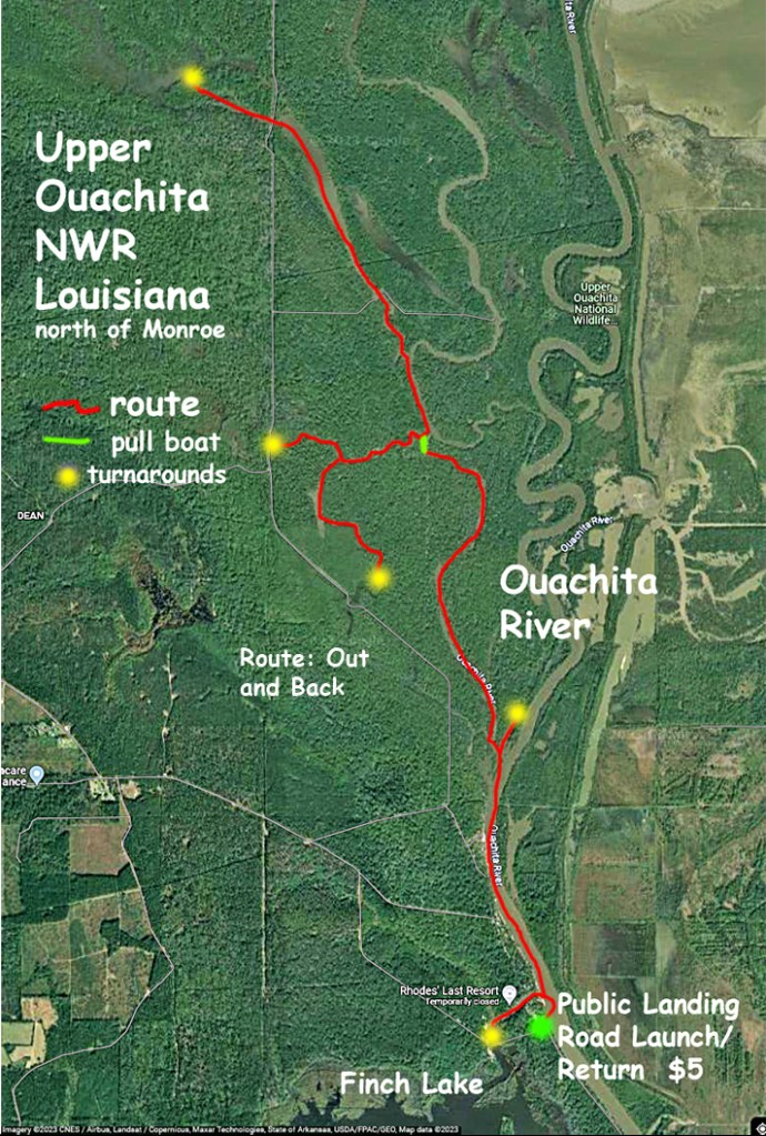 The Upper Ouachita NWR is incredible. I have done multiple trips here (labeled A, B, C…etc.) and it has it all–interesting and varied paddle routes, great scenery, the big Ouachita River, and numerous pools, sloughs, branches to explore. The NWR is a large tract of land in north central Louisiana. It’s just south of the Felsenthal NWR in Arkansas, so that these two tremendous paddle areas are right next to one another. The Upper Ouachita area is very isolated and not a good place to run into trouble.