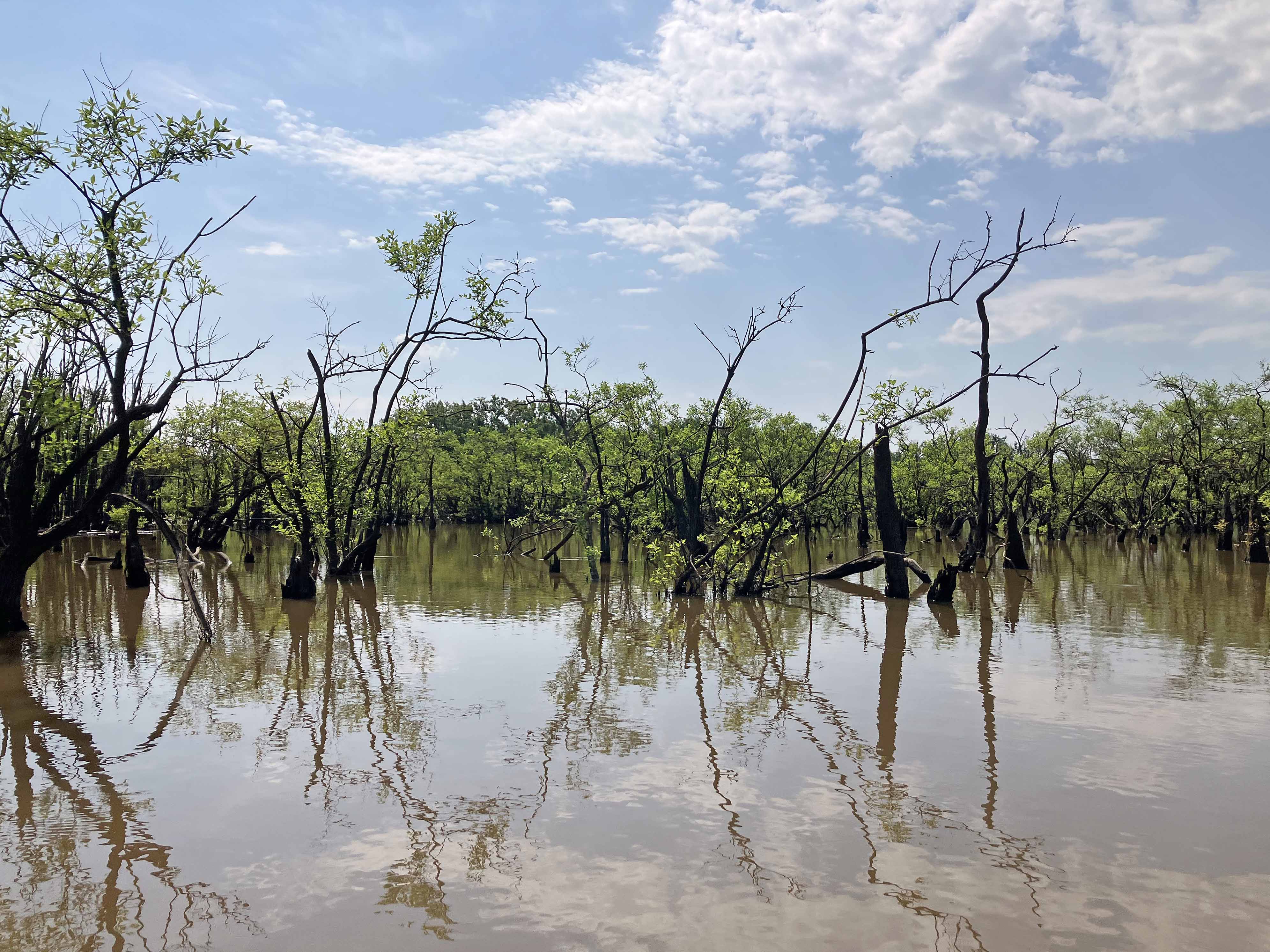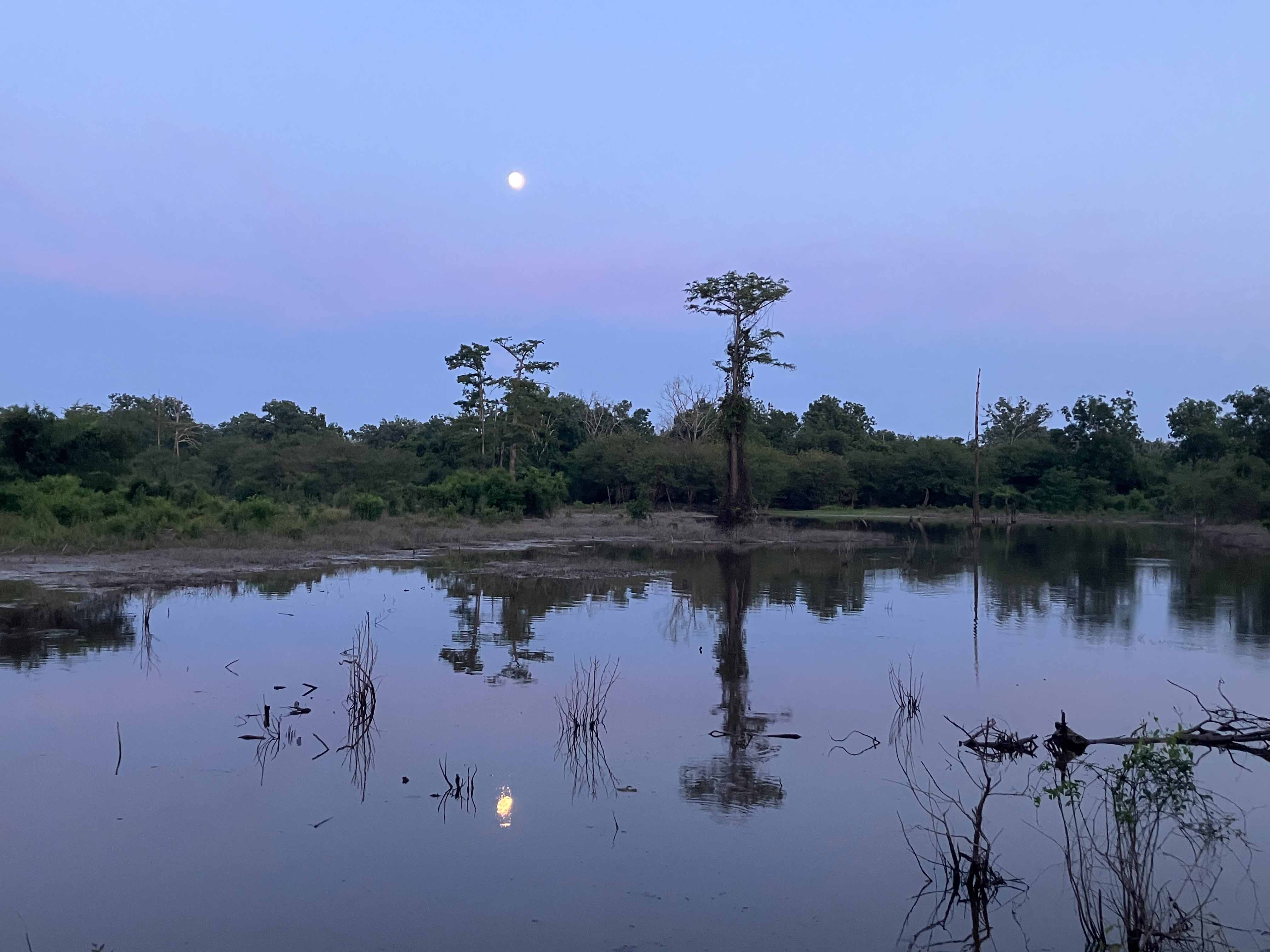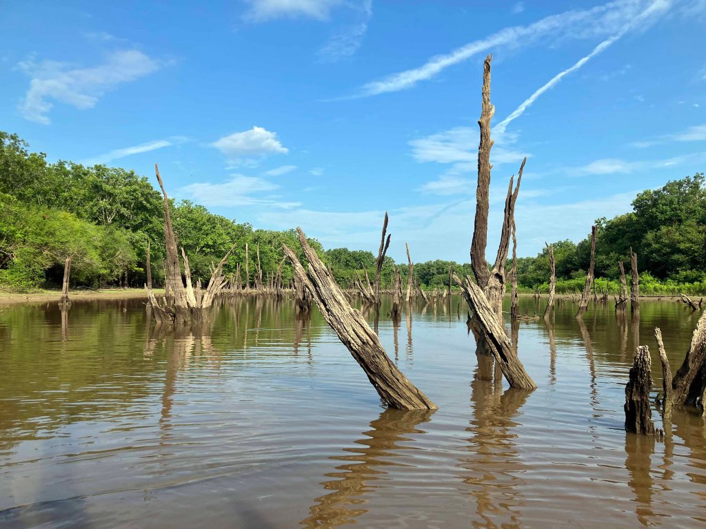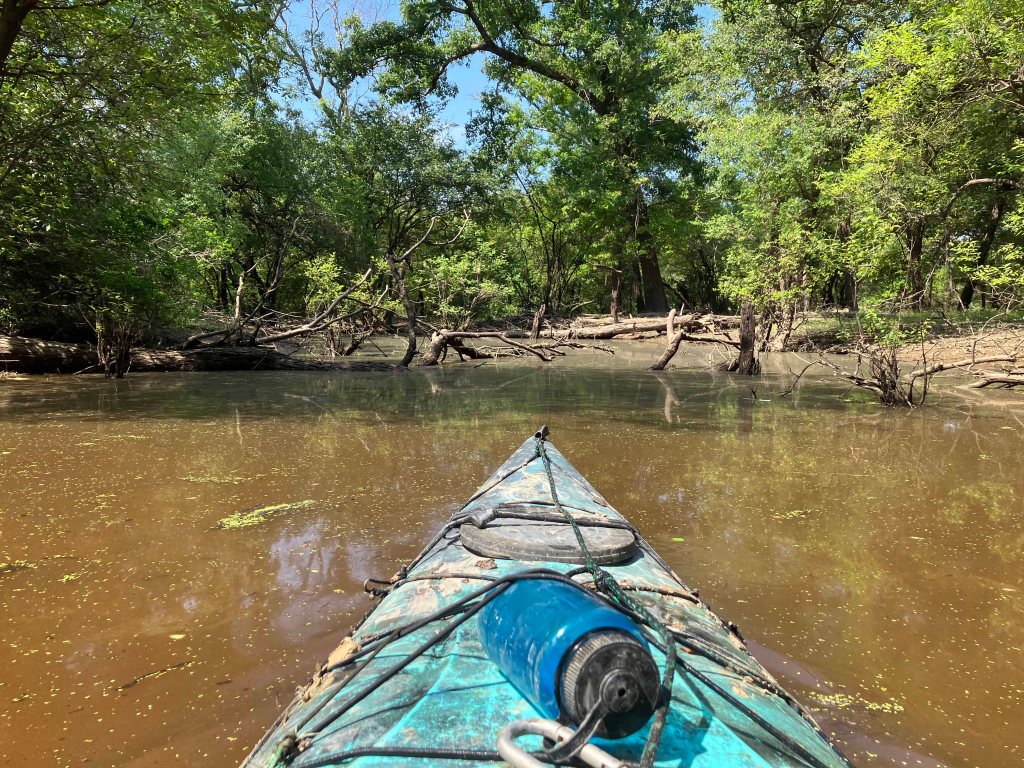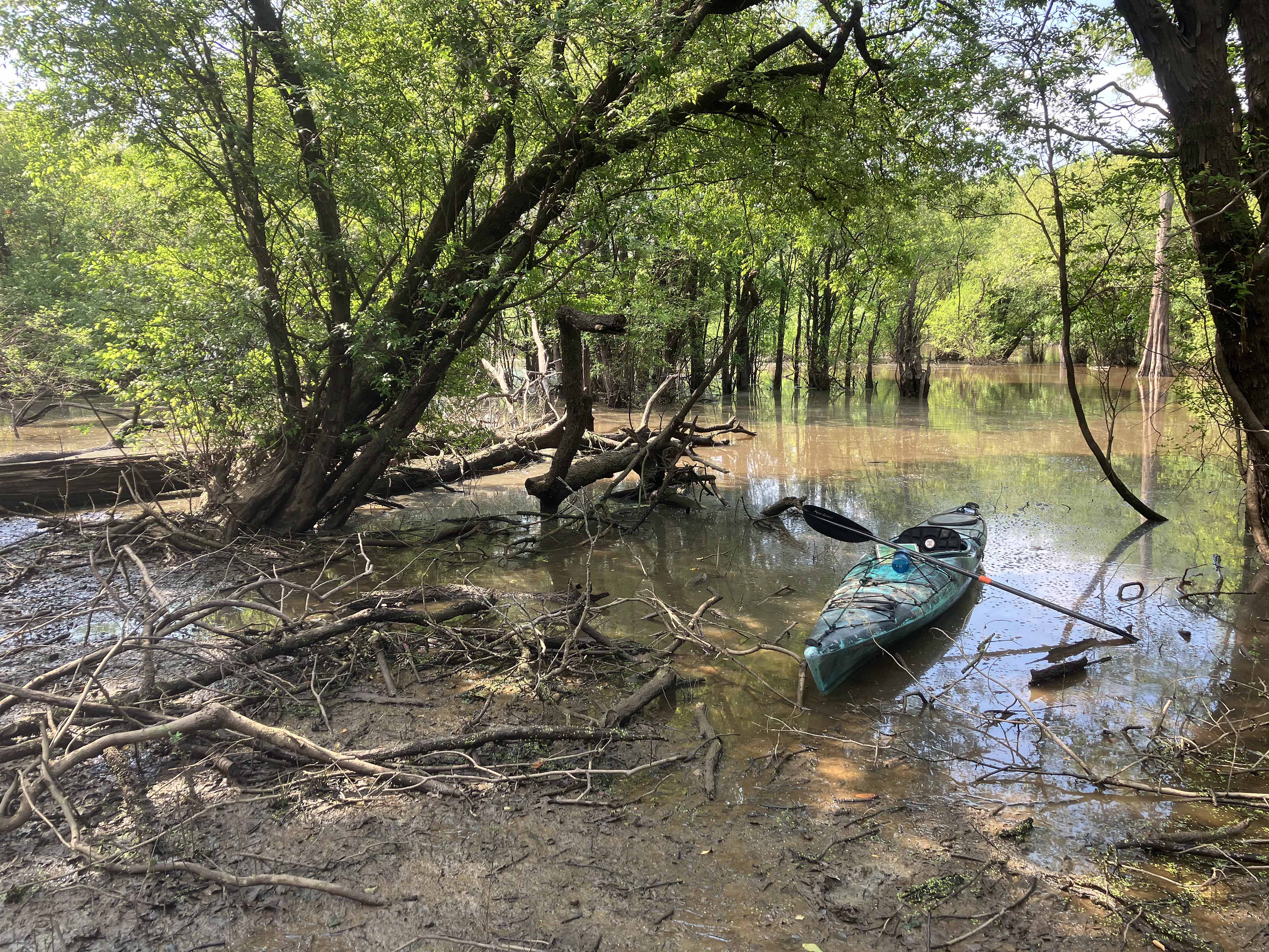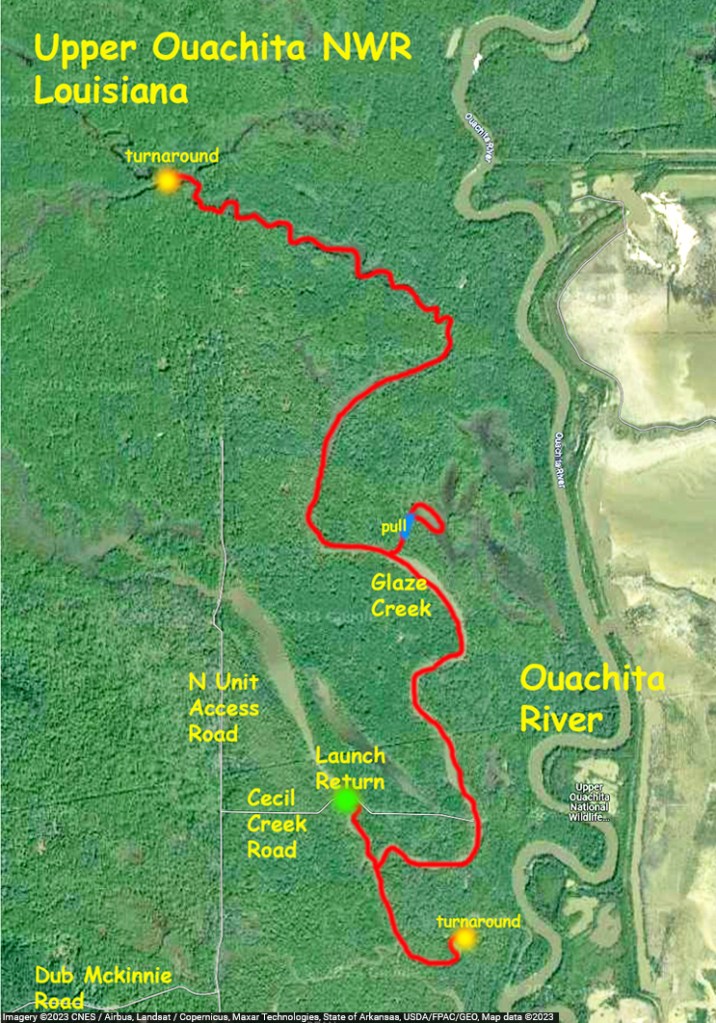 This paddle route in the Upper Ouachita NWR launches at a spot along Cecil Creek Road, which branches off of N Unit Access Road. The purpose of launching here was to avoid the up and back on the Ouachita that you have to do if you launch at Alabama Landing. Note that access to this point when the water is high isn’t possible, the roads are submerged. From the put-in the route goes up into Glaze Creek to a cross or intersection of channels shown on the map. It looks like you could go further but a lot of the trip even to the point of the intersection was already in just a few inches of water and involved a lot of mud chop paddling. Maybe another day.