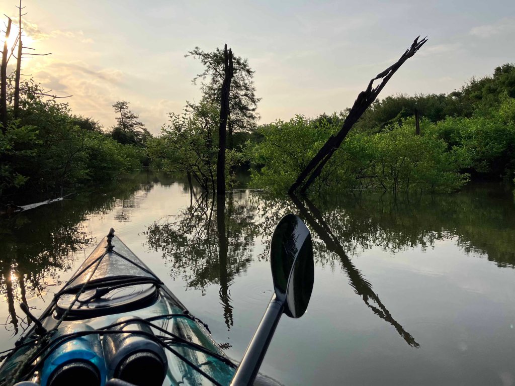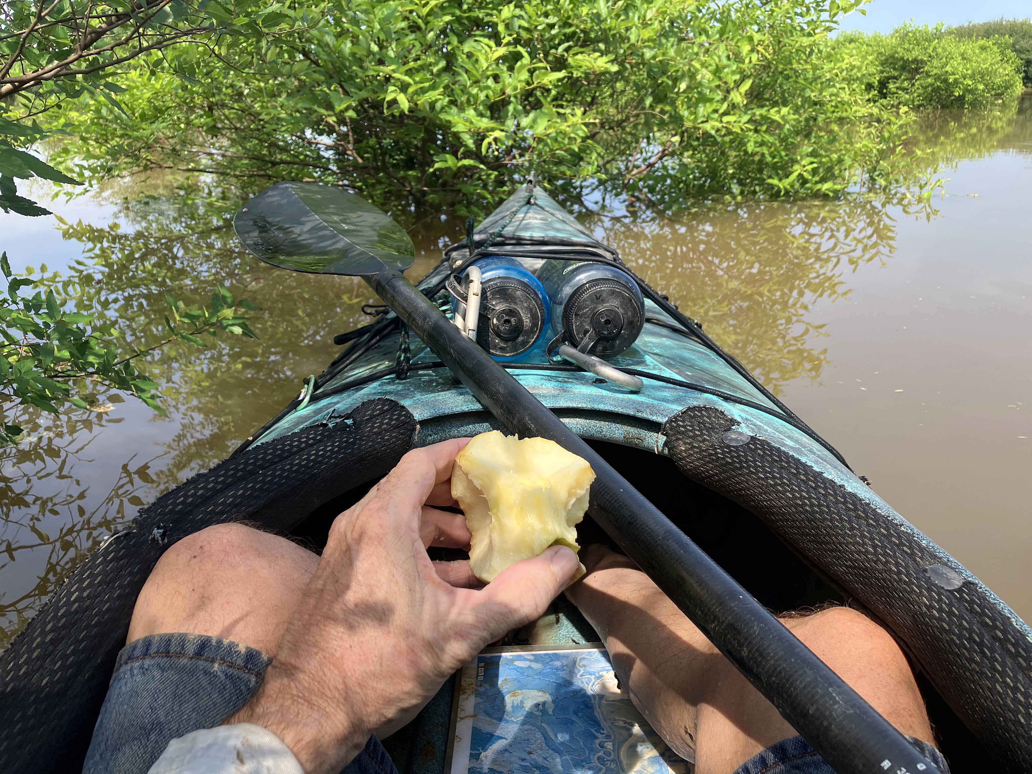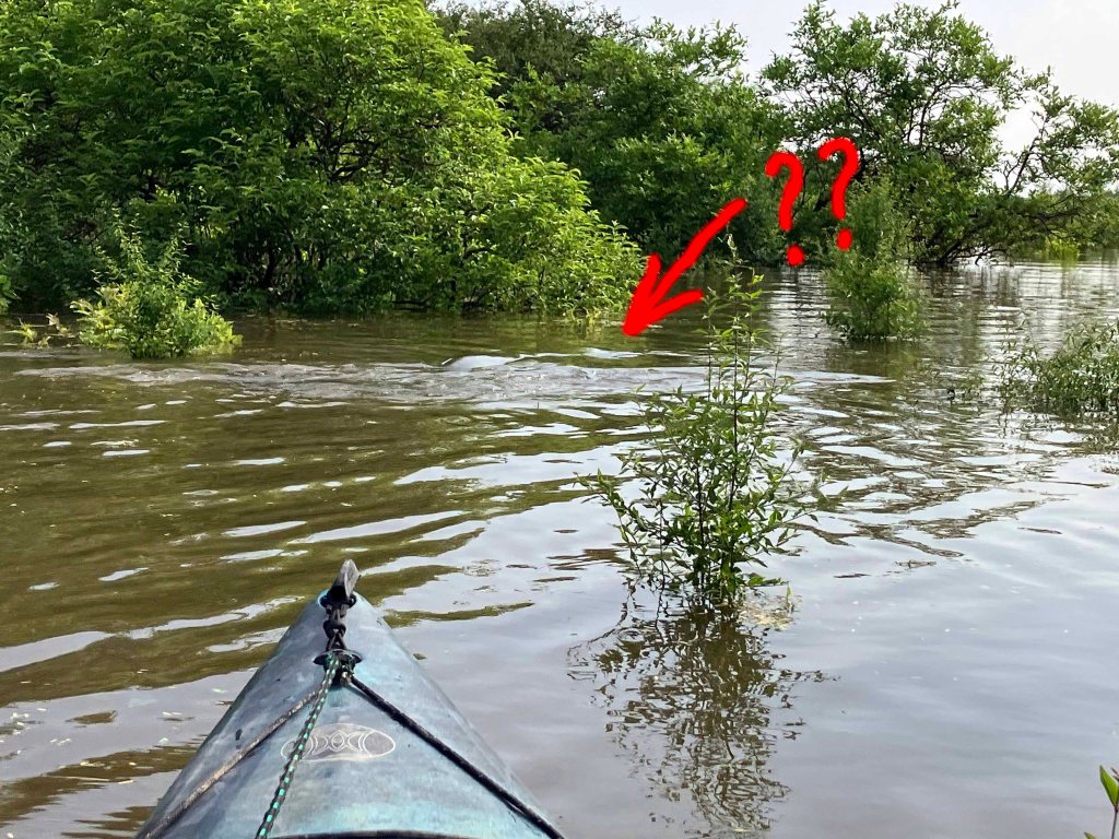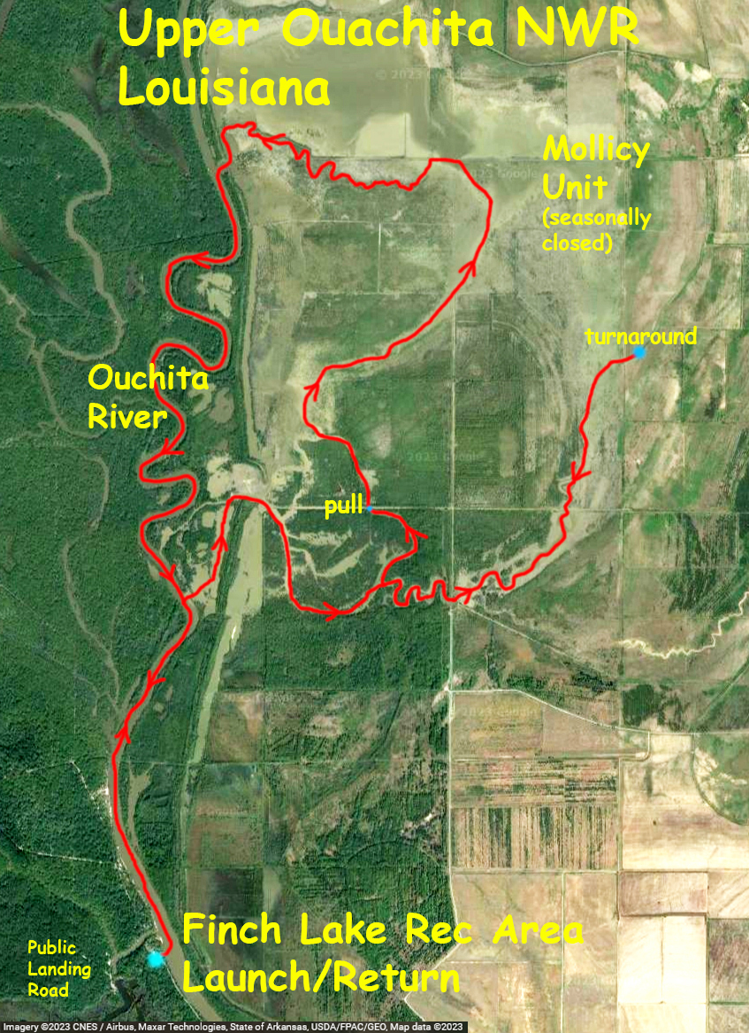 Kayak paddle map starting at the Finch Lake Rec Area and going north on the Ouachita River, then east. Higher water at the Upper Ouachita NWR during this trip allowed for exploration of the refuge east side and the Mollicy Unit. As a result, this paddle route is able go all over the place, way up some back channels, up into Mollicy Bayou, and back west along the twisty Deep Slough. Didn’t see any bears but I hope to some time. But check out the alligator gar in the pictures below. Amazing.