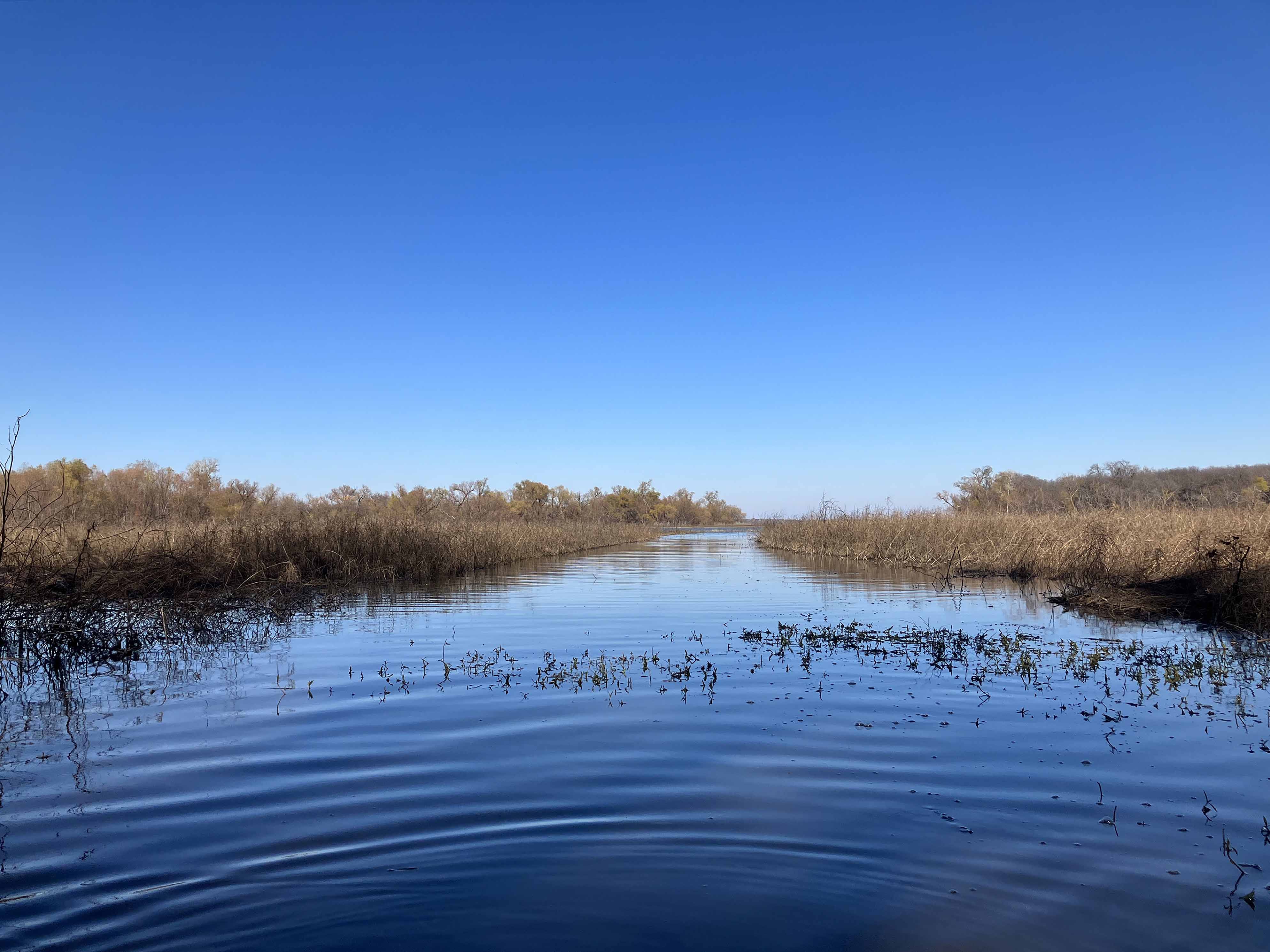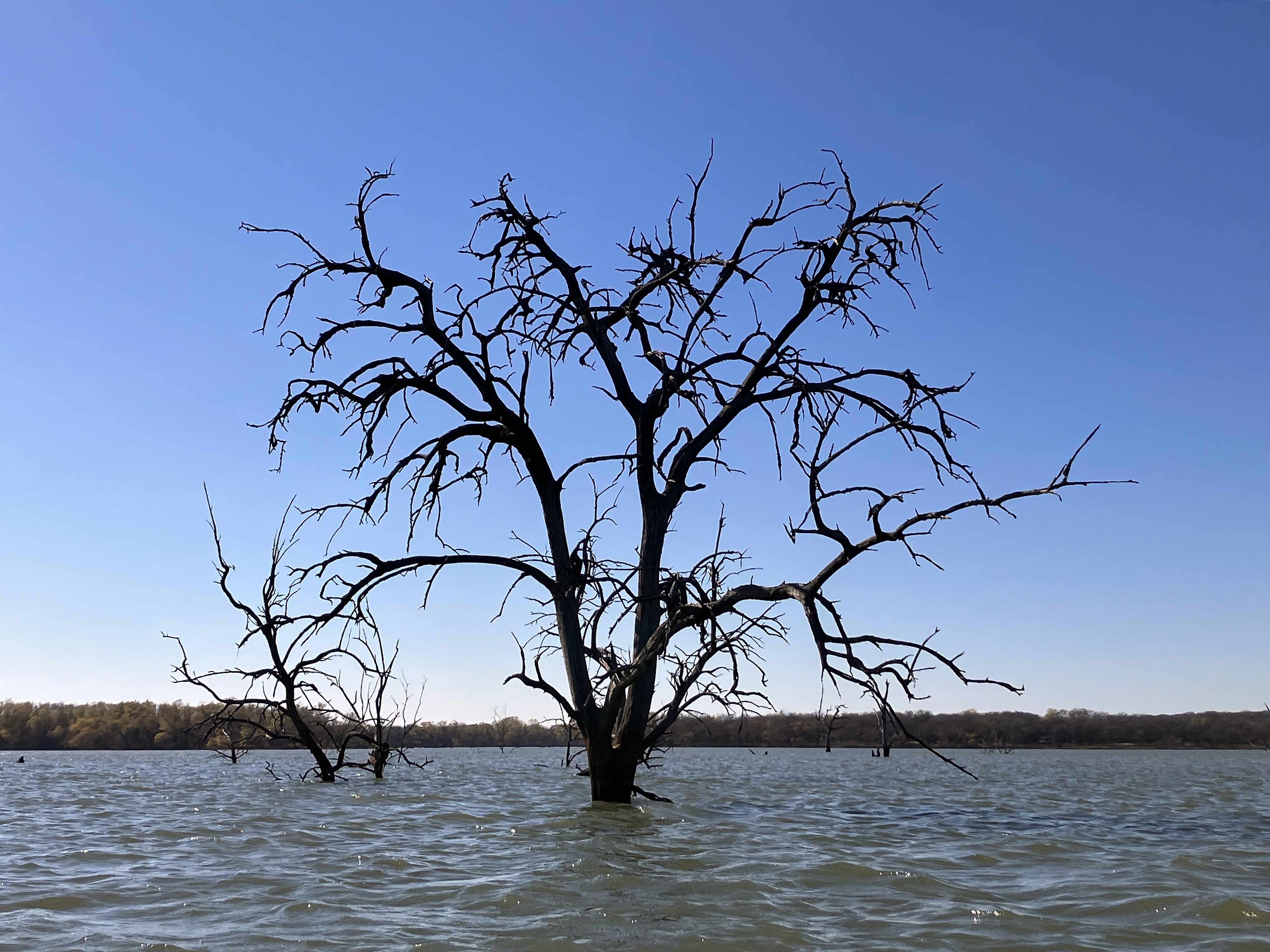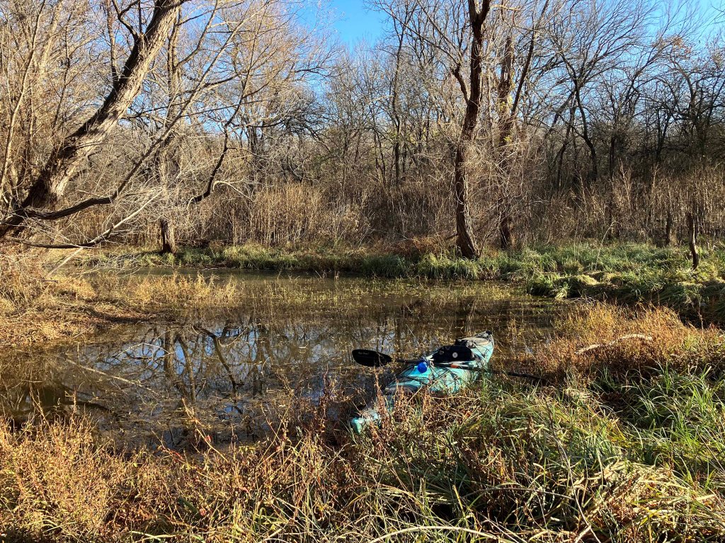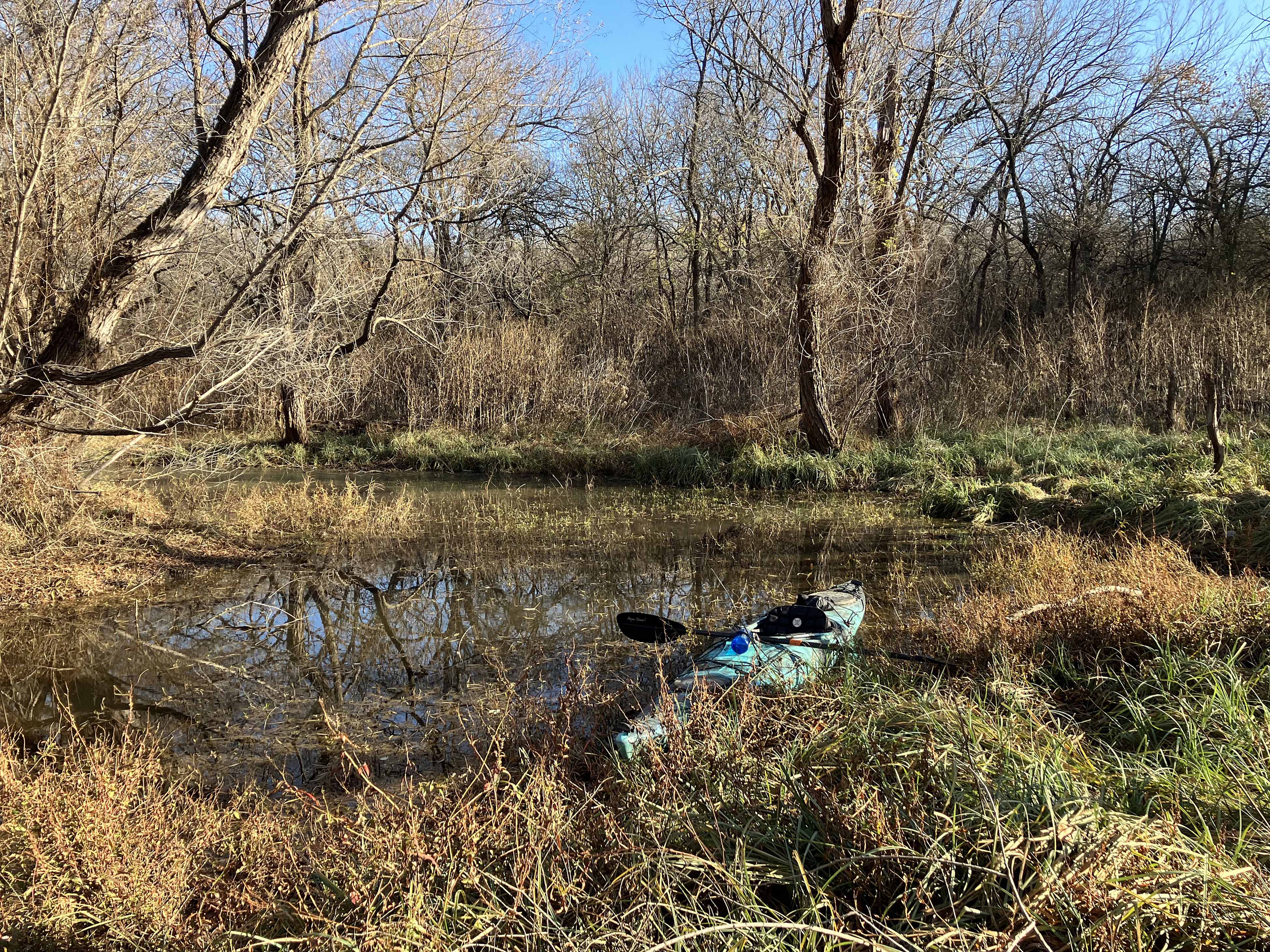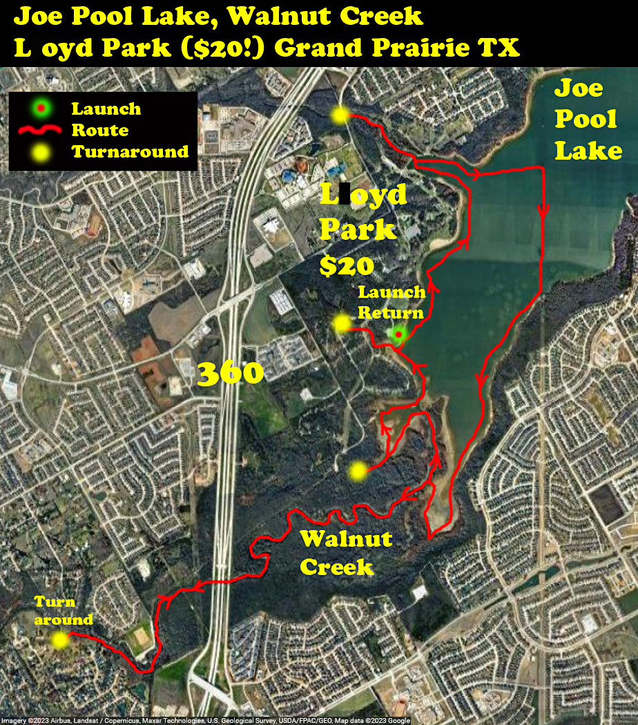 This trip launches on Joe Pool Lake at Loyd Park in Grand Prairie, goes north and east to some huge power lines that cross the lake, then south/southwest to explore the shoreline, then up and back Walnut Creek. I think there is a pretty similar trail listed on the TPWD website. Loyd Park charges $20 bucks which, given 10 minutes unloading the boat and 10 minutes loading the boat, works out to a dollar a minute. The southern shore of the lake has some small inlets to explore which feel remote and are really quite pretty. Walnut Creek itself winds back and forth to the west and is wide and easy to paddle. Once you go under the 360 bridge the creek starts to narrow and that’s where I turned around for the return to the launch site.
