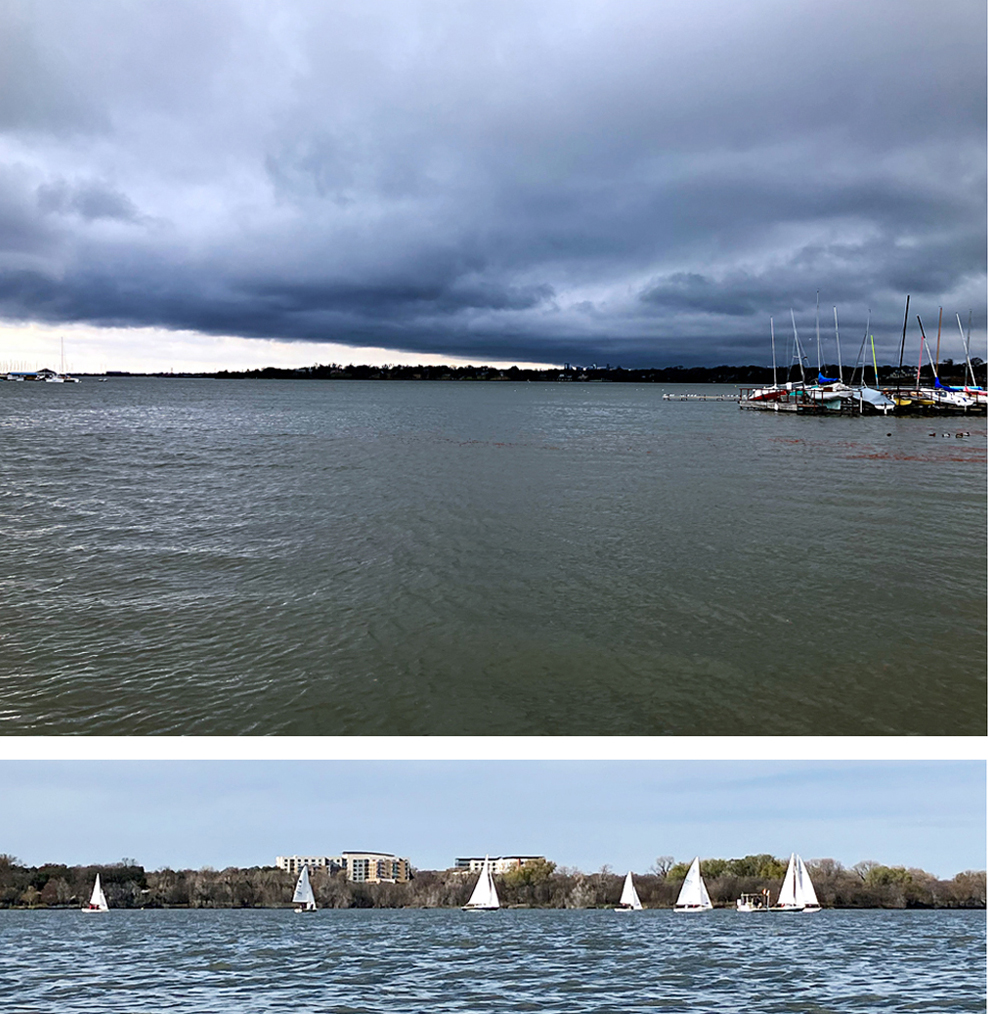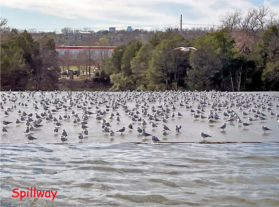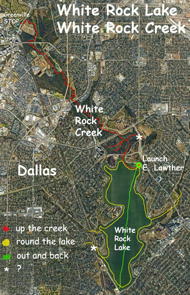 A popular place in the Dallas area for kayaking sailing fishing biking dogwalking running etc. Several boat launches are located around the lake; the one above is at the north end. There are many paddle route options, hang around the launch, go out and back to the spillway (about five miles round trip), go around the perimeter of the lake, (about 7-ish miles), go up Dixon branch on the east side, and go up White Rock Creek. For the creek, the stretch to Loop 12 Northwest Highway is always open, the stretch to Skillman is typically fine, and the stretch to Greenville Ave is ok if the water is up a bit and if you don’t mind a logjam or two. Before the Skillman crossing there is a railroad track and sometimes the DART trains come flying by. A couple tunnels are located here and there. There is, unfortunately, lots of trash in the creek, an amazing number of shopping carts, and the water is very green, but there are usually lots of birds and turtles and once in a while a beaver or even an otter.