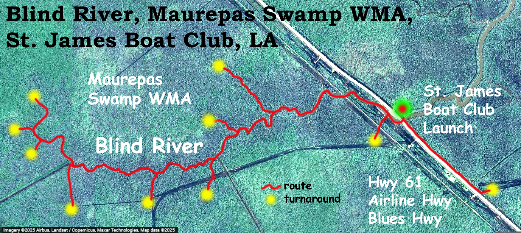 Kayak route paddle map leaving from the St. James Boat Club launch into Blind River. The club is just off of Highway 61, aka Blues Hwy, aka Airline Hwy. This was the second trip I have done from this launch, and it goes west under the Highway 61 bridge to explore Blind River and any sloughs and channels that enter in. This area, the Maurepas Swamp WMA, is one of the better spots swamp paddles in the New Orleans area, I think. There are large cypress left over from logging which are wonderful to see, the side channels get into the swamp pretty well, and there are lots of alligators. This trip I also saw a bunch of otters digging for shells and snails in the silt. On an earlier trip here the Airline Canal gage was about 0.9; for this trip the gage was at about 0.0. This is a bit low and so the shoreline was muddy and progress into the swamp tended to stall in silt and low water. And at some point the boat high centers on logging debris every few feet. Another foot on the gage and the range of paddle exploration would increase tremendously. But either way this is a great place to paddle.