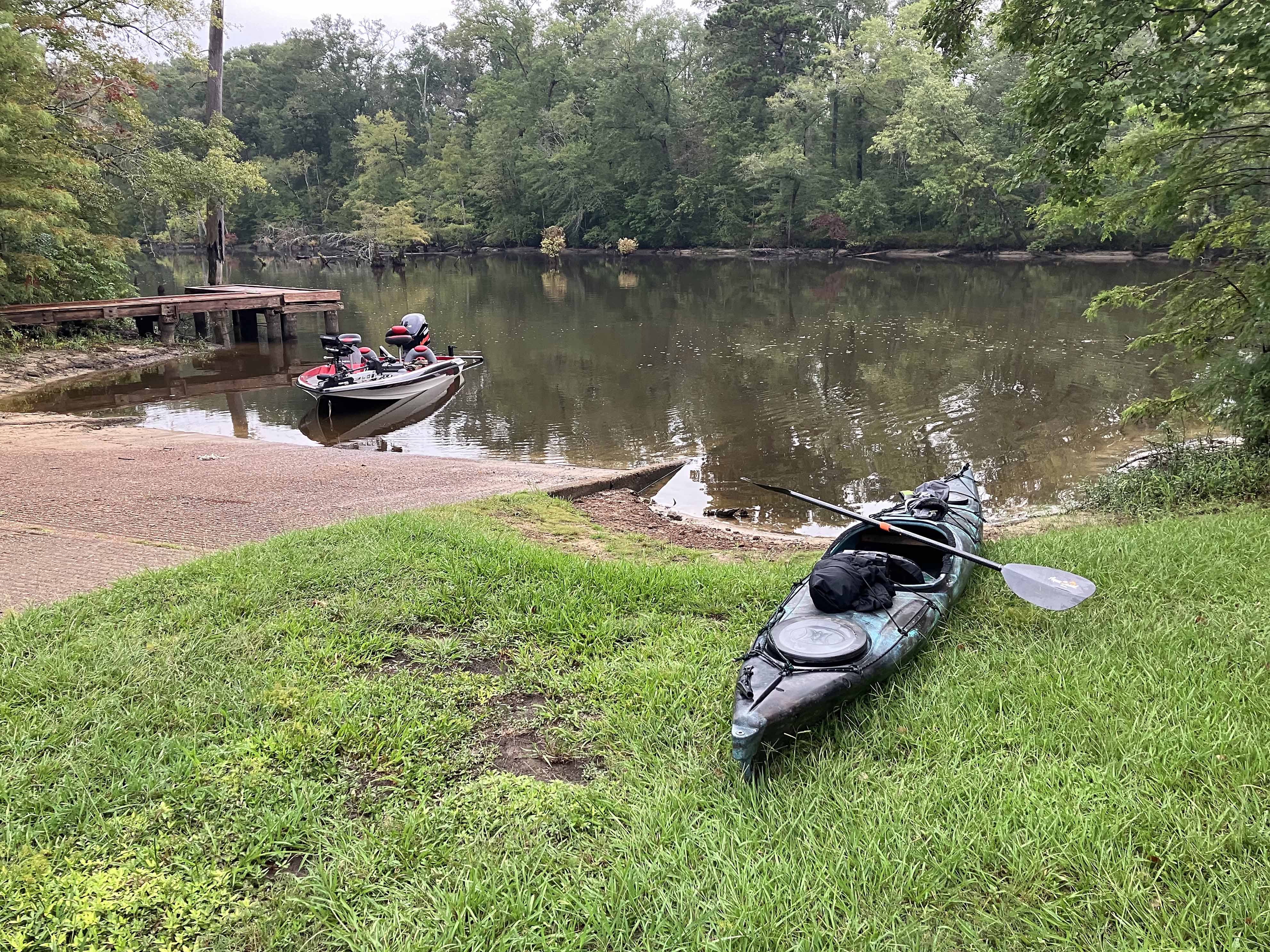 The more typical Corney Bayou paddle starts at Highway 550 and goes north; there is a map and trip description for that paddle on another page. This route does the section below 550, almost down to the lake. And it was quite nice on an overcast rainy day as the pictures show! The launch has a self pay kiosk, $5, and they had the envelopes so no excuse. This is an easy flatwater paddle, very scenic, and the channel was, on this occasion, narrower than usual due to low water. Otherwise this stretch of the bayou would be fairly wide. A paddling trip in the rain is (sometimes) so nice. Like today.