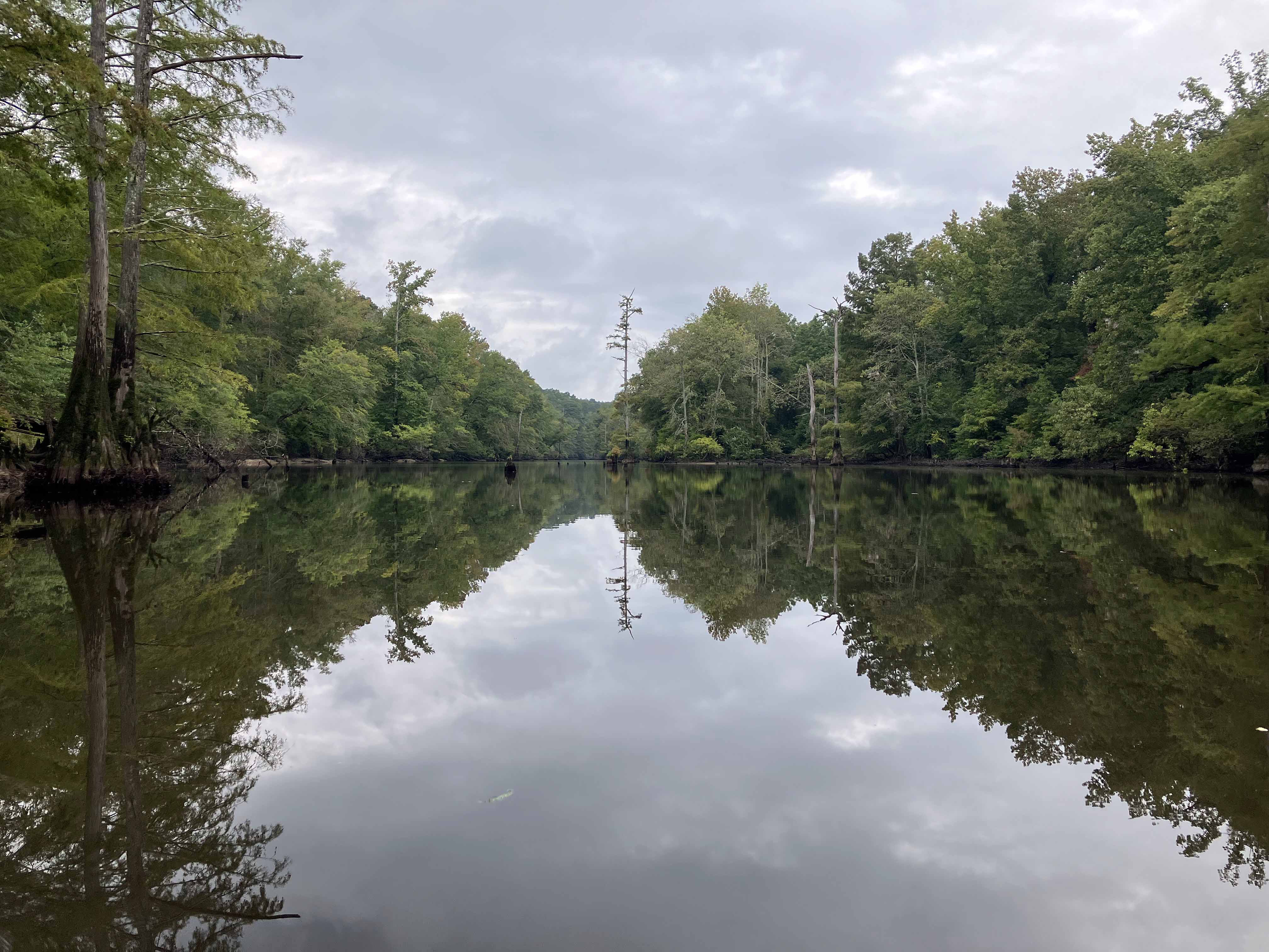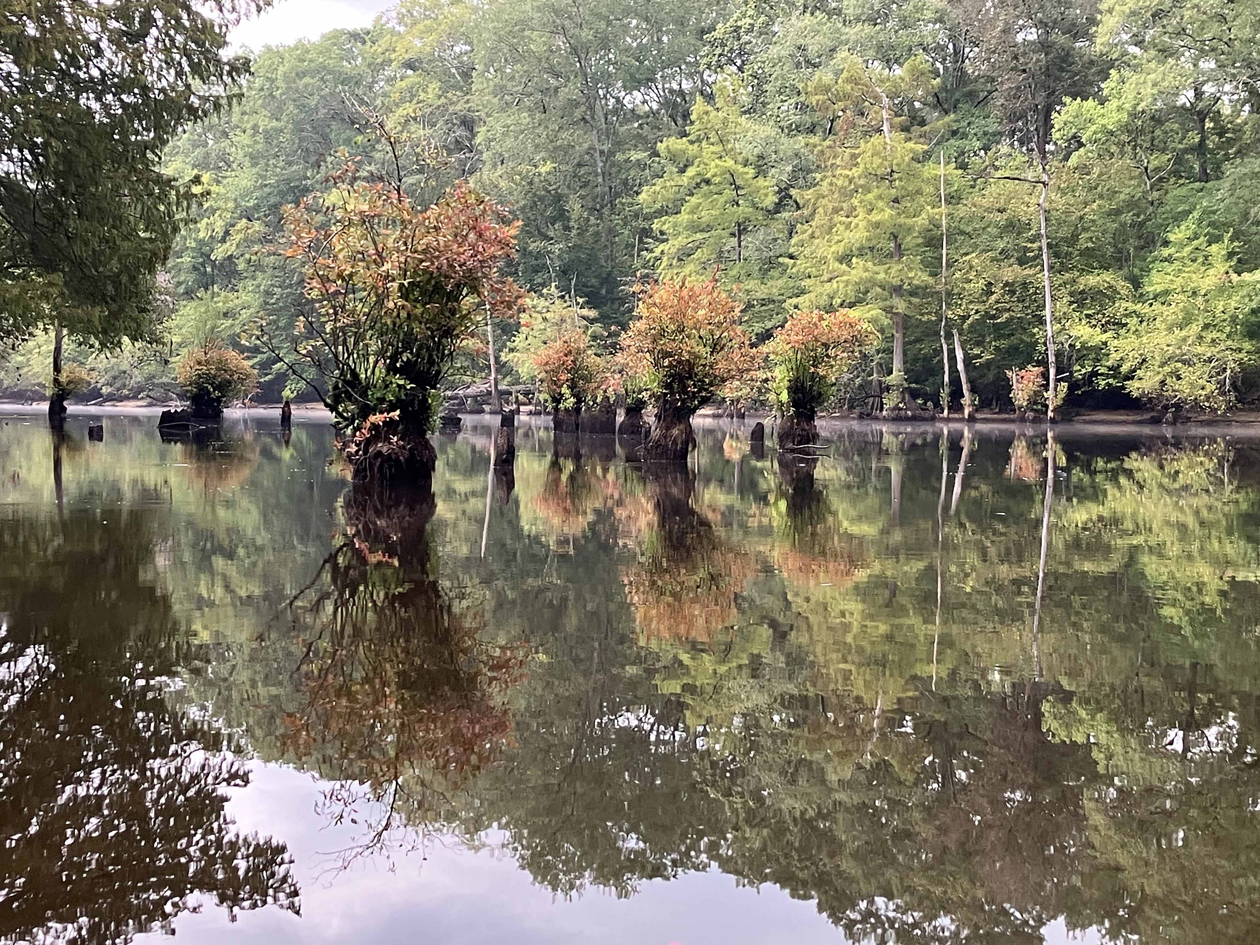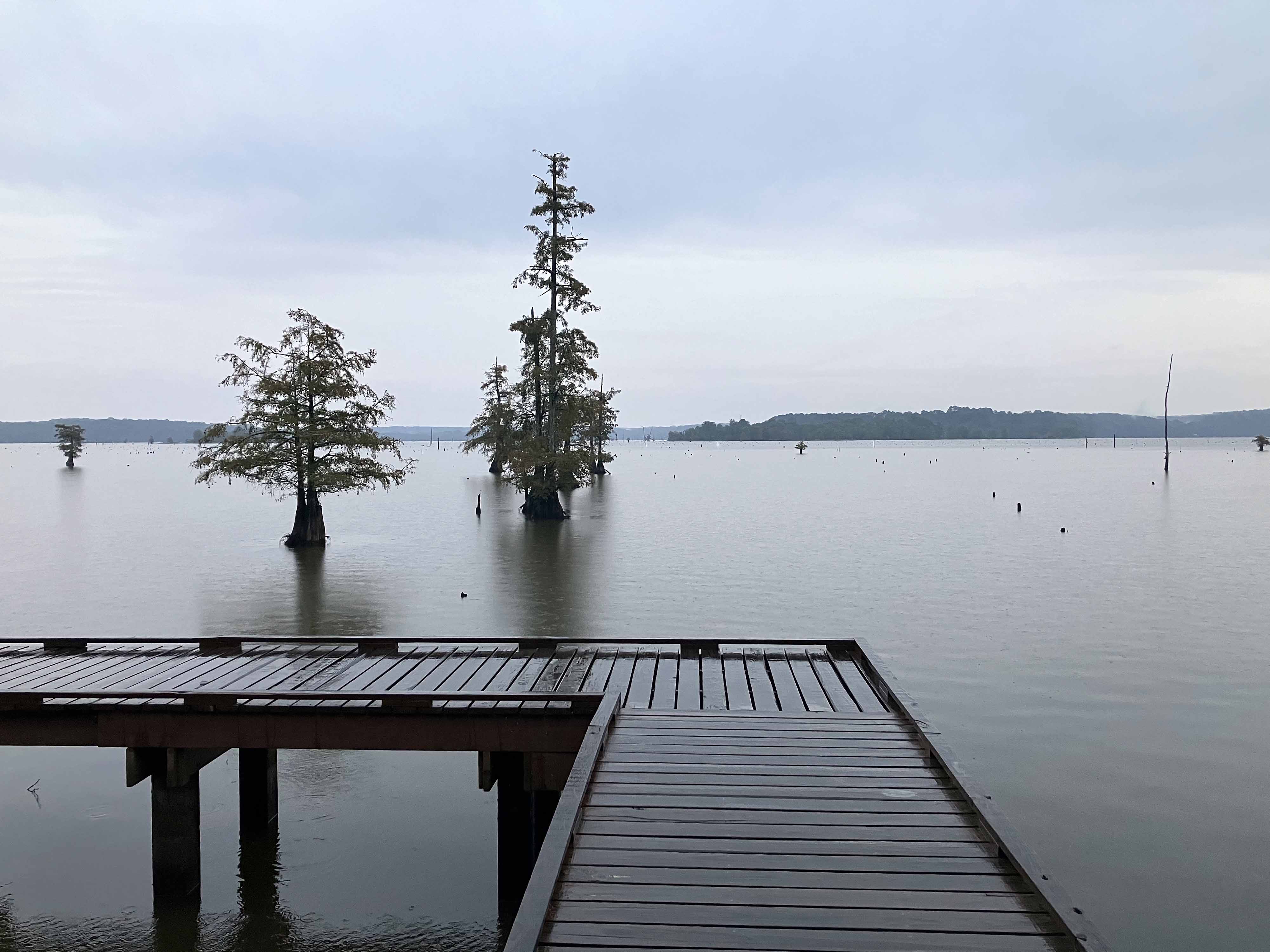Above: PIcture of Lake D’Arbonne from the dock at the state park, rainy and overcast.