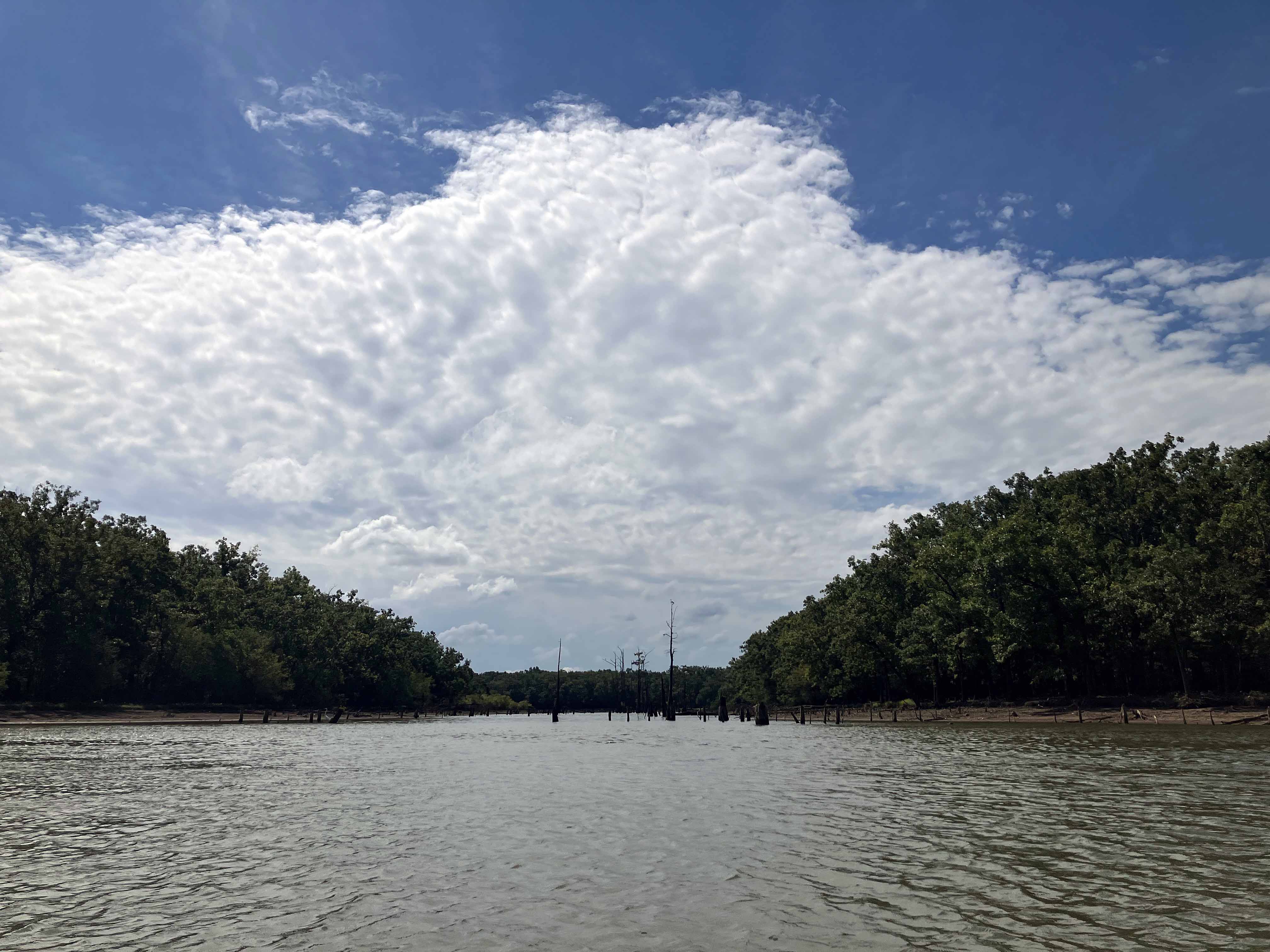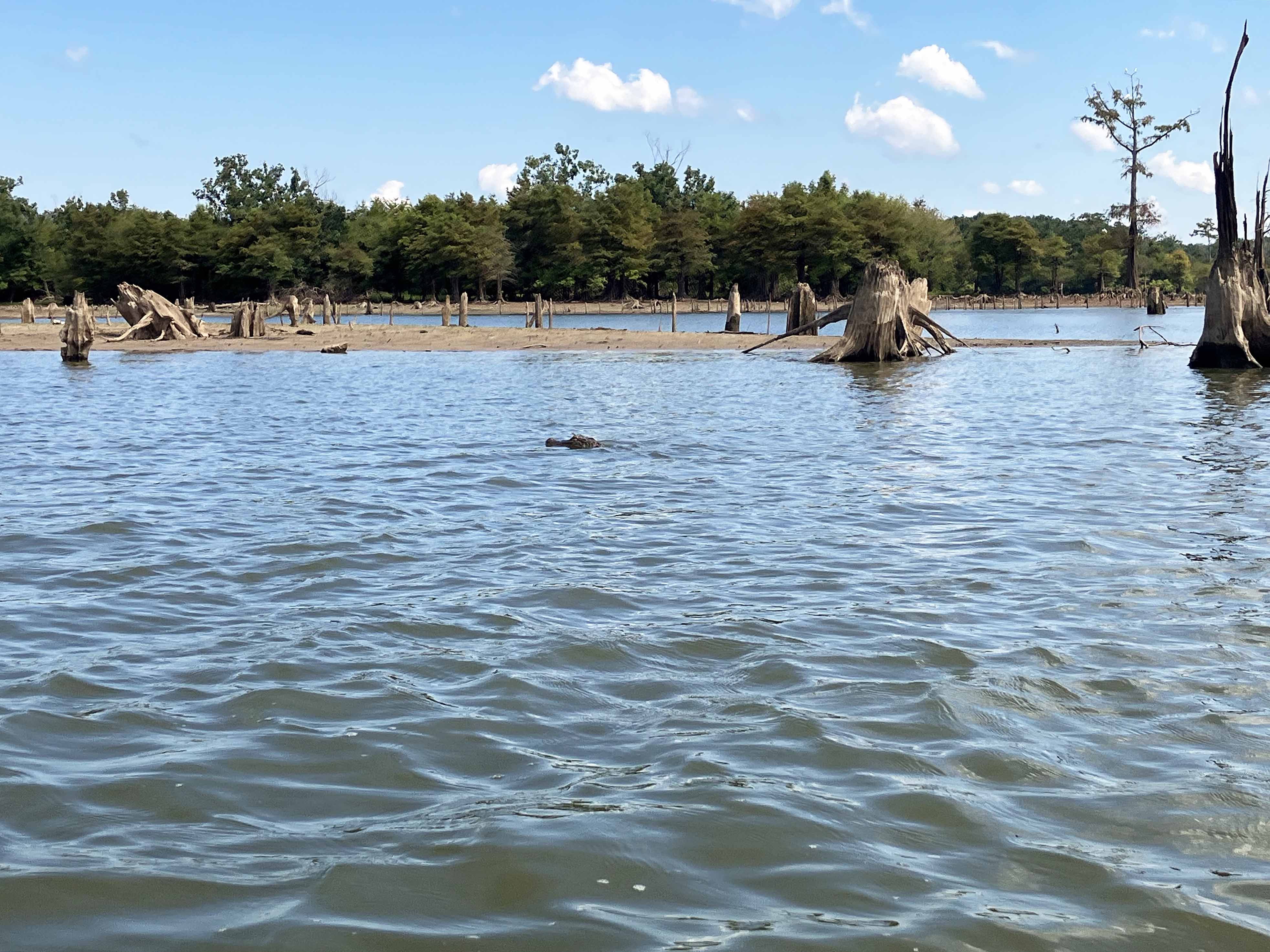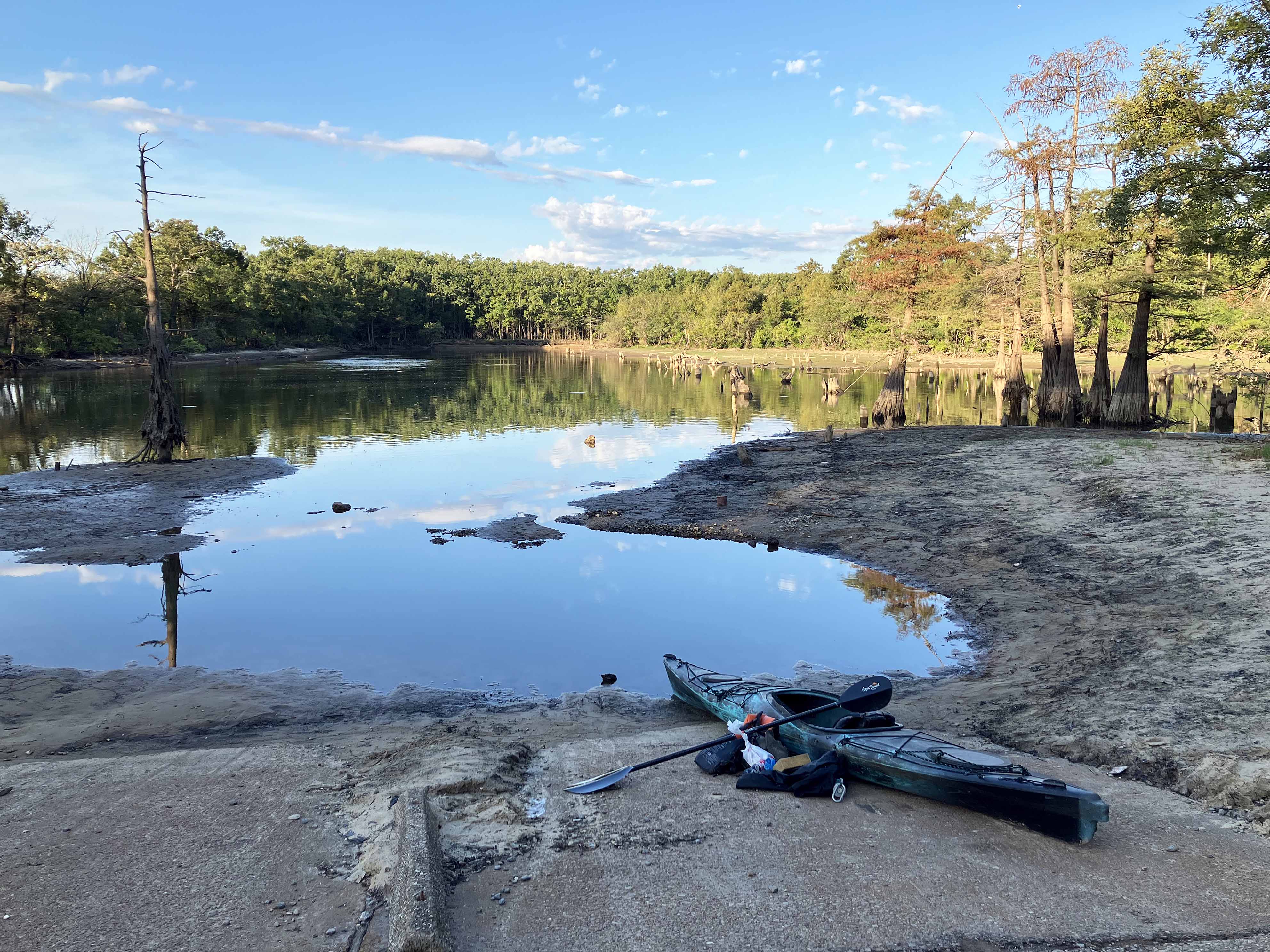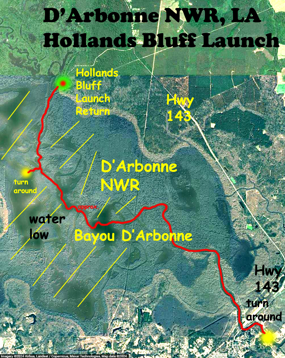 This is the second route I have done starting from the Hollands Bluff Launch in the D’Arbonne National Wildlife Refuge. I drove from Dallas, stayed at Lake D’Arbonne State Park, drove to the refuge and the sign says *LAUNCH CLOSED*. ack! But the ranger at the station said with a kayak just slide it in wherever you can no problem. Thank you! The ranger also explained that the water in the refuge was down three feet because of a emergency repair on a lock/dam along the Ouachita River downstream at Columbia LA. However, people I talked to had a variety of alternative explanations. In any event, levels here, and upstream at Lake D’Arbonne, were super low. For this trip that meant that rather than exploring the otherwise huge expanse of D’Arbonne NWR, I paddled down the D’Arbonne Bayou corridor to Highway 143 and back. Everything to either side was mud. Which was fine, kind of weird, very unique as the pictures show. Saw five or six gators, a bald eagle, and lots of fish concentrated into much smaller volume than normal. Great, scenic paddle under peculiar conditions. Note that a large region on the west side of the D’Arbonne NWR is off limits for waterfowl hunting AND is open all year to non motorized watercraft. The seasonal entry limitations vary from refuge to refuge but this one can be paddled year round.