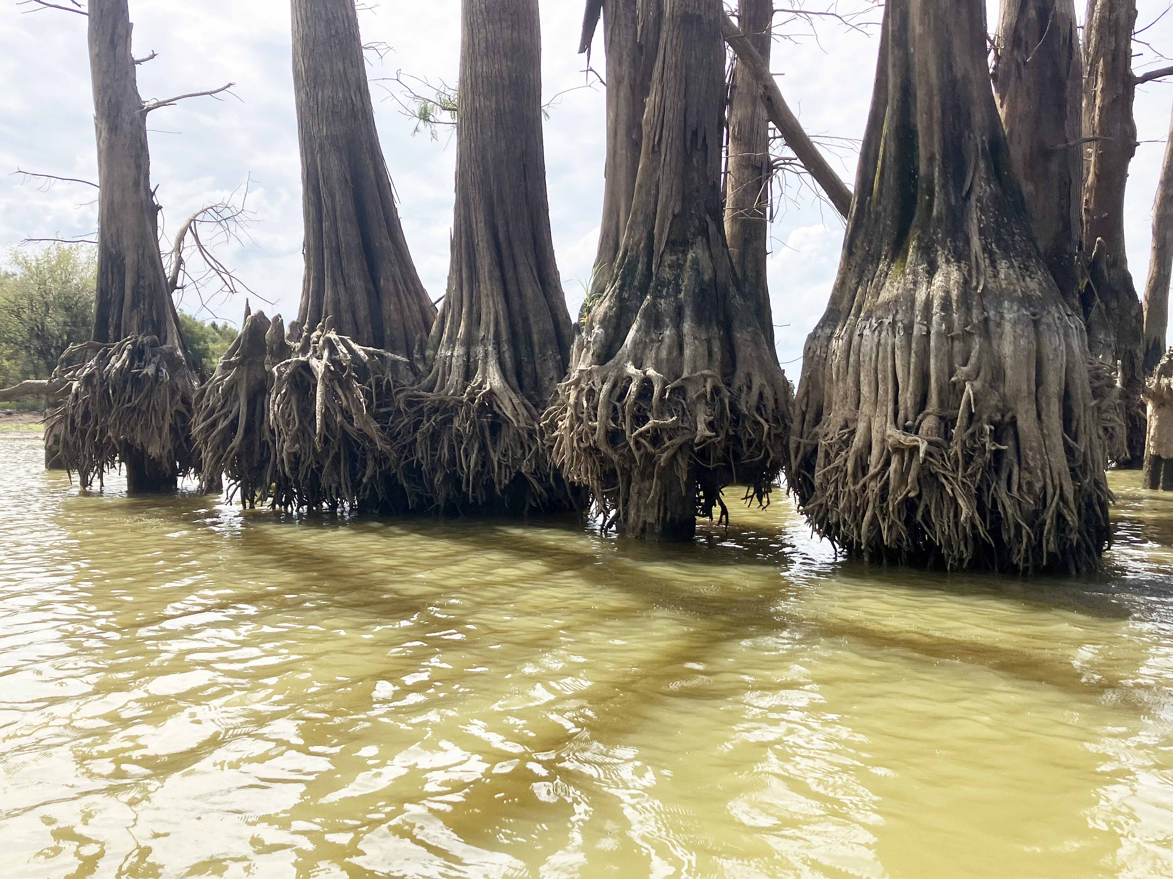 Above: The base of dead cypress trees kind of stand up on a narrow shaft with their old roots exposed.