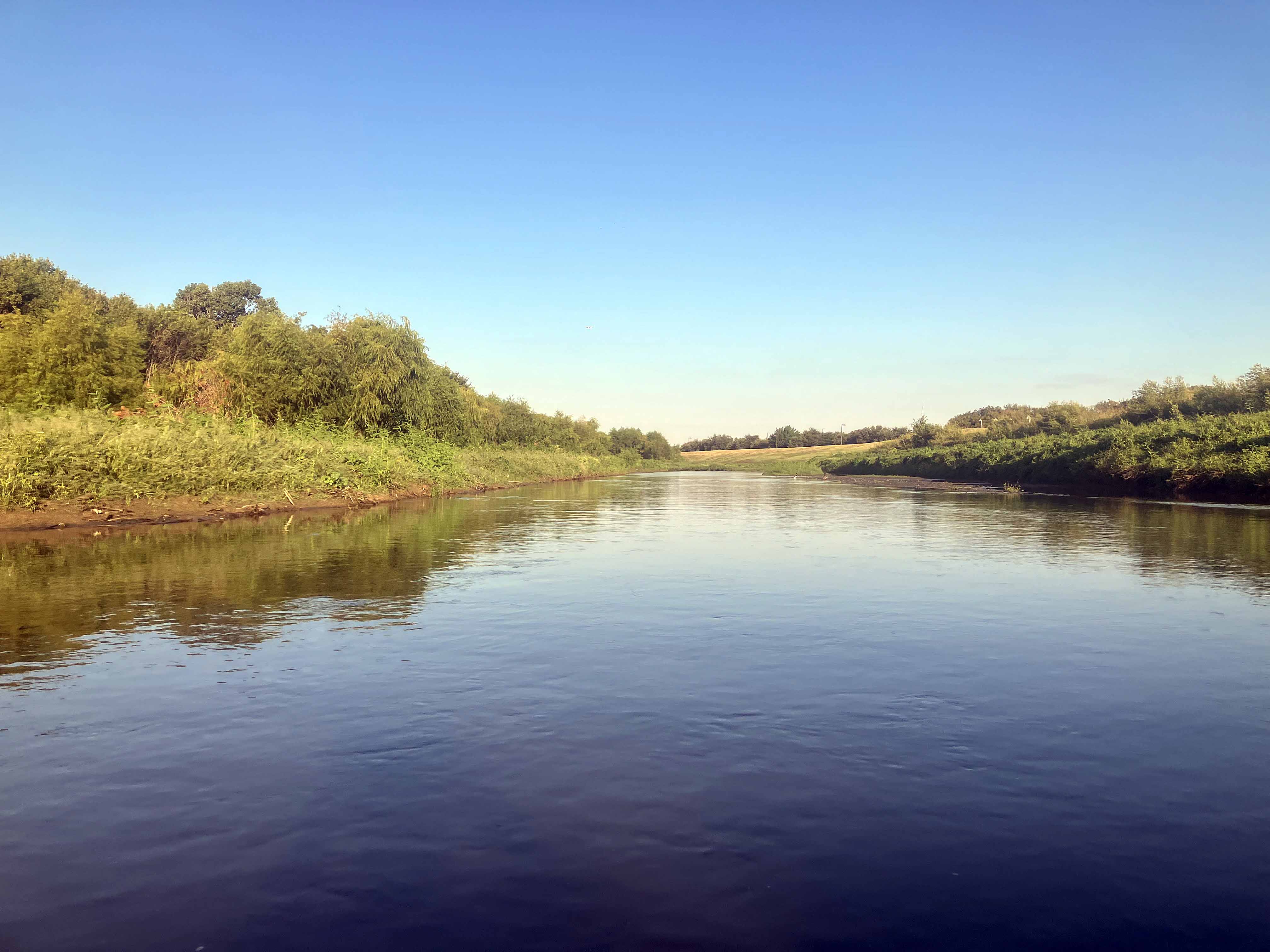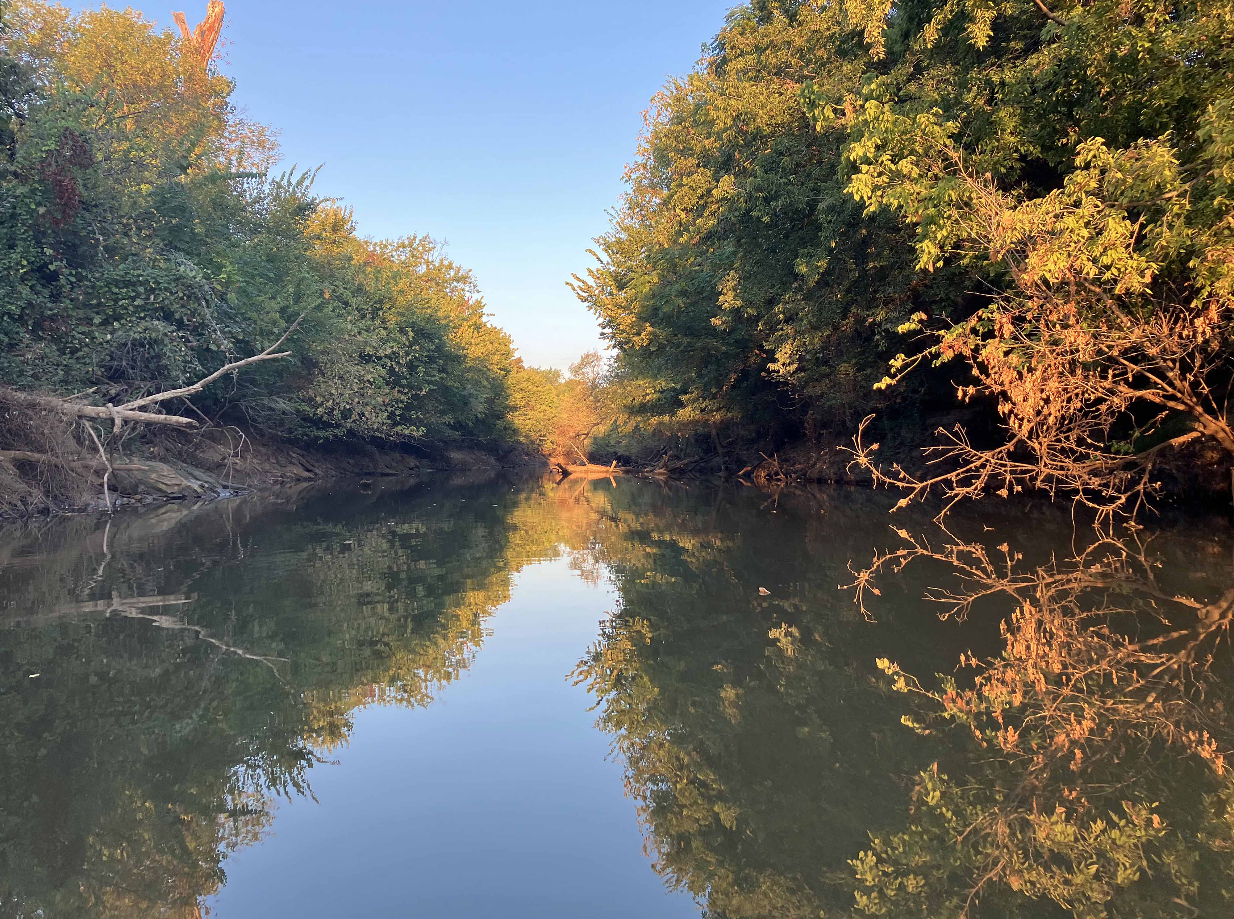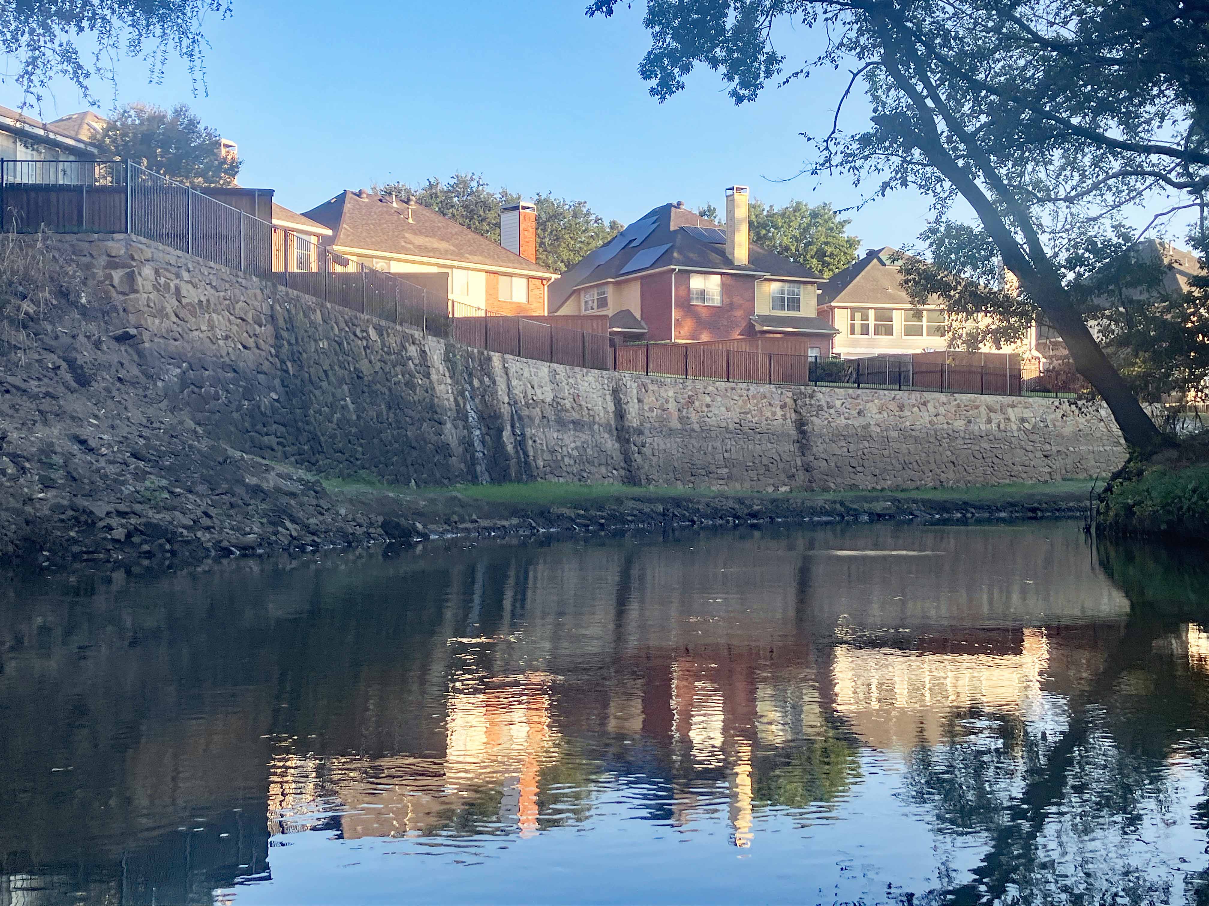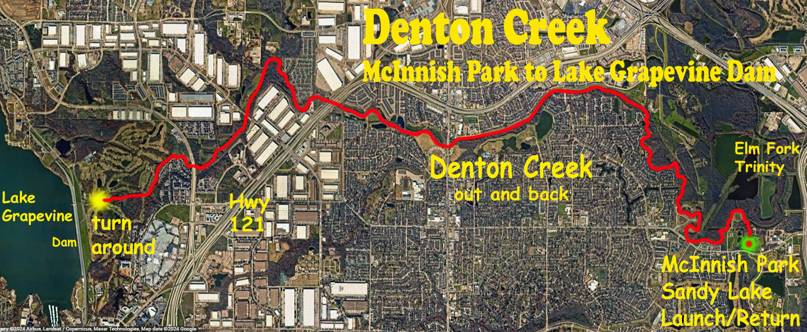 The above kayak route map (click on map to enlarge) shows an out and back on Denton Creek starting at the McInnish Park Launch in Carrollton Texas. The idea was to paddle upstream to the dam at Lake Grapevine, then paddle back. The creek winds in and around some large homes which is kind of interesting, and near Grapevine there is plane after plane coming in from the north preparing for landing at DFW airport. It’s definitely an urban float. Complications to the route are possible log jams that must be portaged, and there is a wide section of river about the half way point that can be a bit shallow (and sometimes too shallow). Towards the end of the wide section, in the upstream direction, is a 1 foot spillway (edit; the spillway is now a stone barrier; you can instead paddle a narrow bypass channel; another such bypass occurs just upstream as well. However, the bypass channels are new routes for the creek and are lined with trees. With flooding those trees will undoubtedly fall across the channels blocking them both. Will be curious to see what happens here.). Note also there is a steel pipe a mile or so upstream of the launch that you have to go under or around depending on the water level; for this trip I went under (~80 cfs is fine e.g.). The last bit just before the dam is riffles and so I had to pull the boat up this stretch to actually reach the golf course bridge and the ‘Restricted Area’ sign. Pretty nice paddle, and an interesting alternative to the usual McInnish-Elm Fork route.