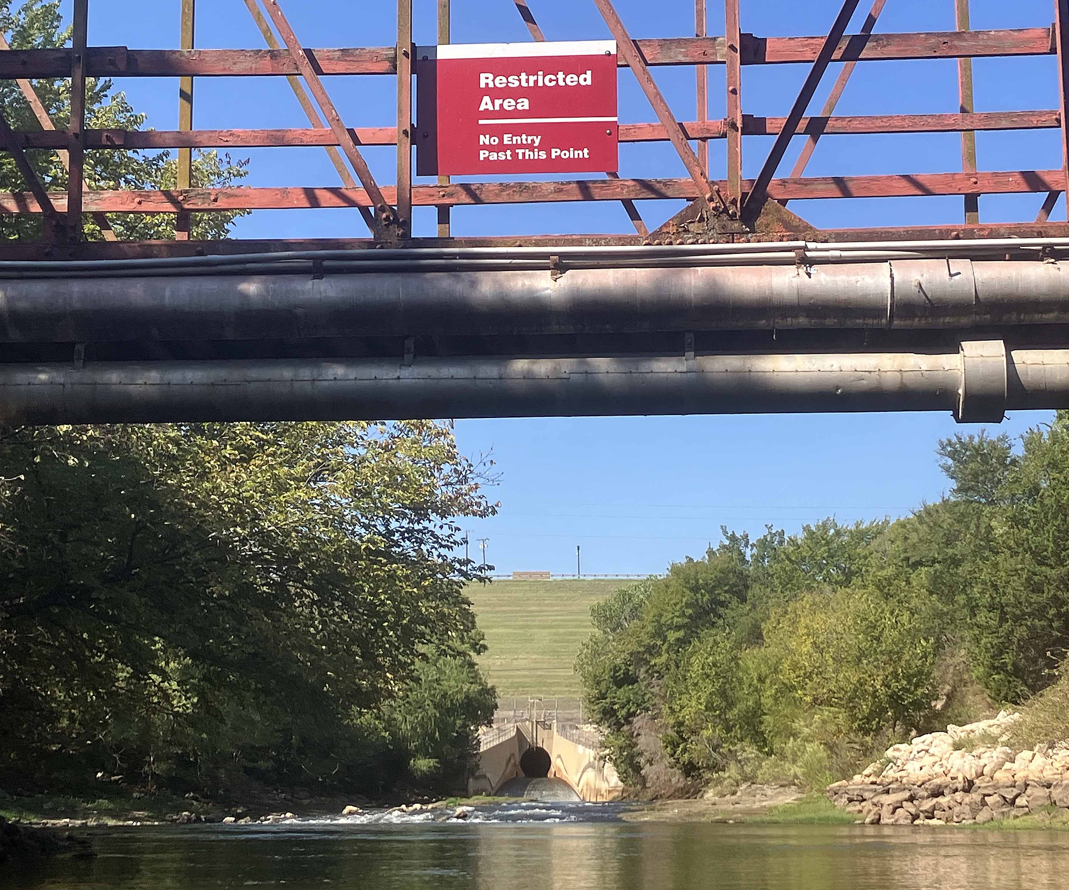 Above: Turnaround point. Golf course bridge with Restricted Area sign and view of the Grapevine Dam and outlet into Denton Creek.