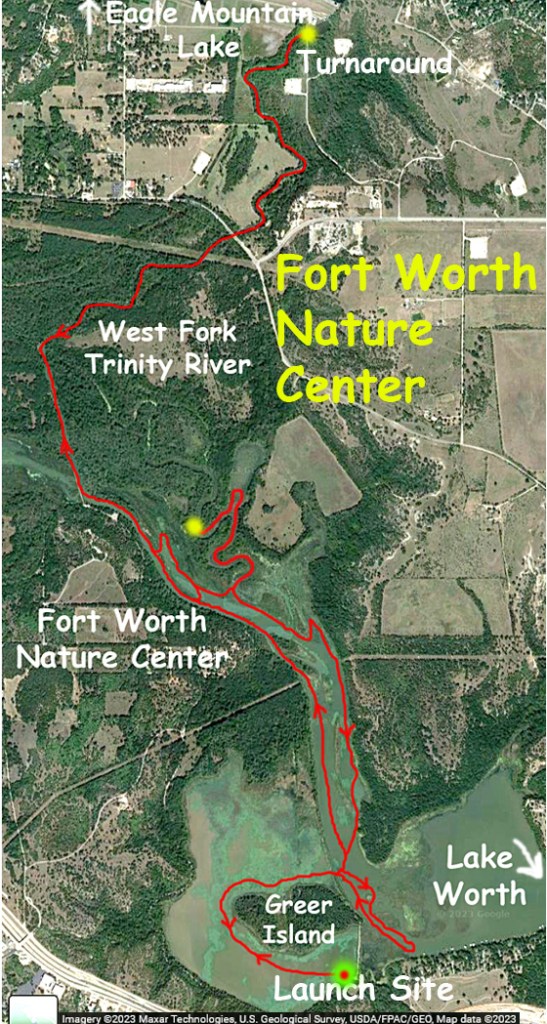 It’s possible to see alligators kayaking at Caddo but in my experience it’s kind of hard, or chancy. So I was surprised when I first paddled the Fort Worth Nature Center on the west side of DFW to see so many here. There’s a lot. The Center is located between Eagle Mountain Lake and Lake Worth on near Fort Worth. Connecting the two lakes and running through the refuge is the West Fork of the Trinity. There is an entry fee (including for dogs so be sure your dog remembers to take his/her debit card), and a couple boat launches. This route uses the launch at the east end of the Refuge near Greer Island. There is a variety of paddling types, up the creek paddling to the dam, exploration of the small grassy islands, or even paddling down to Lake Worth itself, depending on how far you want to go. On one occasion the West Fork was lined with guys fishing and there were dozens of fishing kayaks in the water, and I kind of wished I had picked a different day.