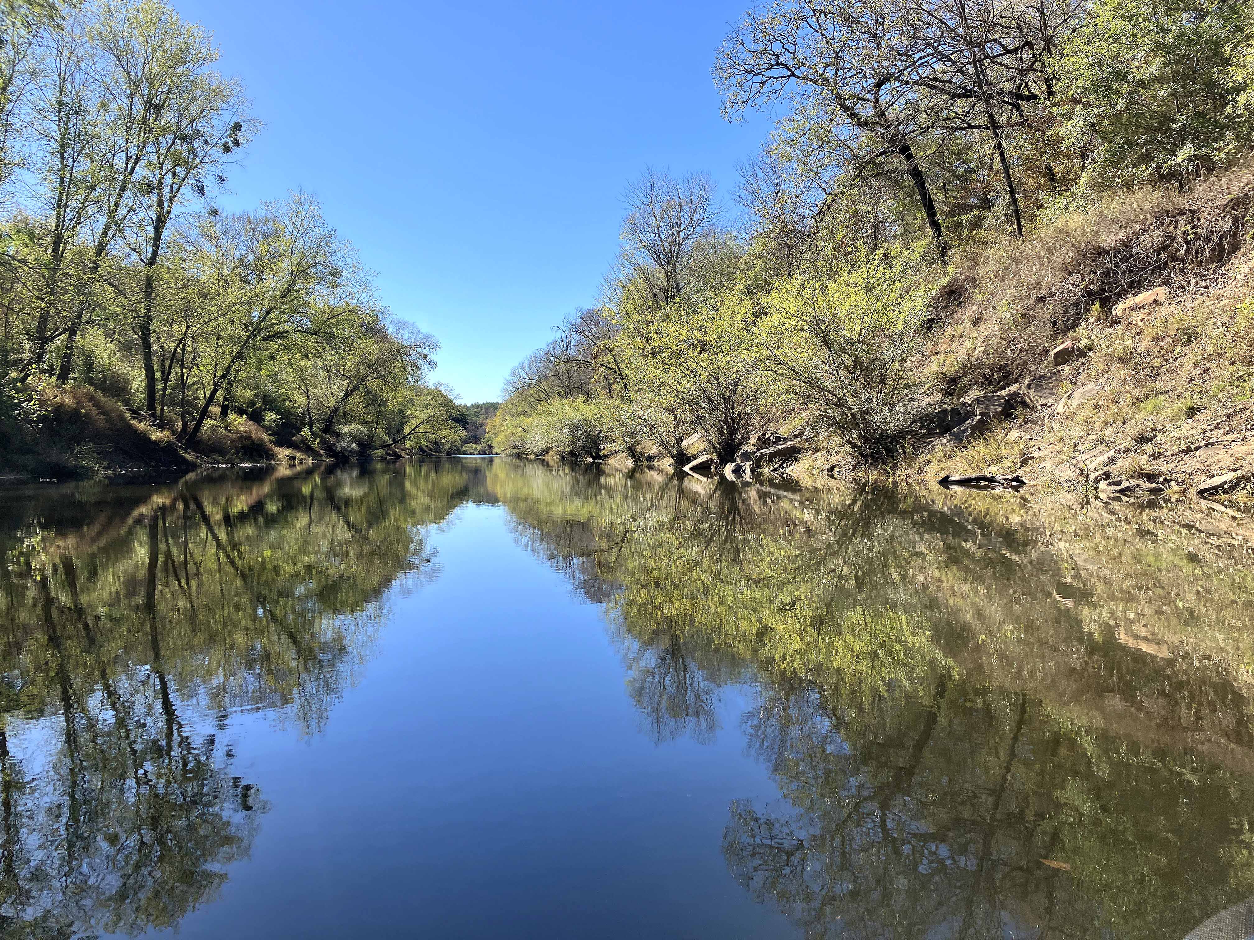 This kayak route map launches at Rattan Landing on Highway 3 just a few miles east of Antlers Oklahoma. From this launch you can go south into the Hugo WMA area and several posts describe routes in that direction. The trip here goes north from the launch up the Kiamichi River towards Antlers, OK. The turnaround point was at a jumble of rocks in Cedar Creek. I was surprised at the gradient in the Kiamichi, at least as compared to the southern direction out of Rattan. While mostly a wide flat river, there were some nice riffles here and there. Some of these could be paddled up, there was enough depth for the blade to bite, but there were another three or four where I had to pull the boat up through, as the pictures below show. Perhaps this varies with flow rate (this trip was ~750 cfs Kiamichi at Antlers), sometimes higher flow is easier. Navigating these spots made progress slower but the portages also added a bit more fun compared to a continuous flatwater paddle. And the day was perfect, cool and sunny, with a few otters chattering and playing in the river.