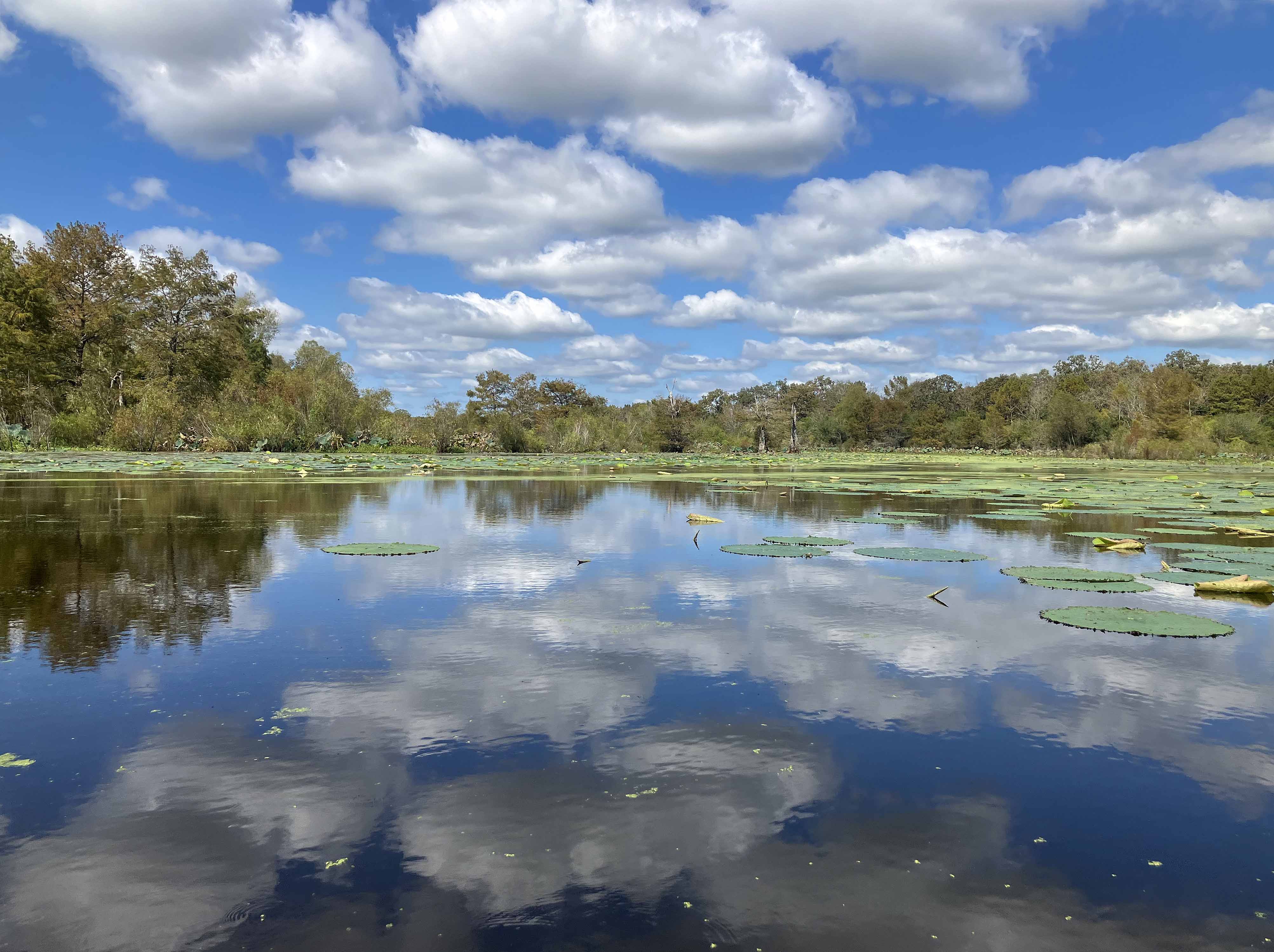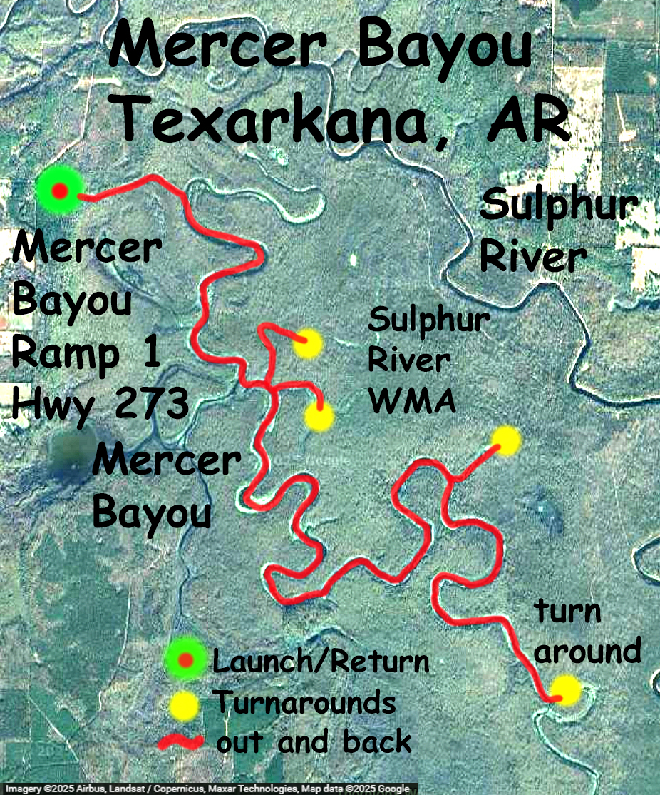 Kayak paddle trail route map in the Mercer Bayou area of the Sulphur River WMA in Arkansas, just south of Texarkana. This trip paddles along the bayou to the point of a turnaround for one of the prior Mercer Bayou trips thus, over several trips, completing the entire channel. Beautiful day as the pictures show, lily pads, lotus, and great sky. Saw several guys out in their mudboats on this trip, either fishing or cruising the bayou, probably because the weather was a bit cooler. And four or five alligators in the water, but nothing big-big. And a hawk trying to catch an egret, is that even likely? As you paddle by the fish kind of pop up at the surface all over the place, in front of you and to the sides, amazing.