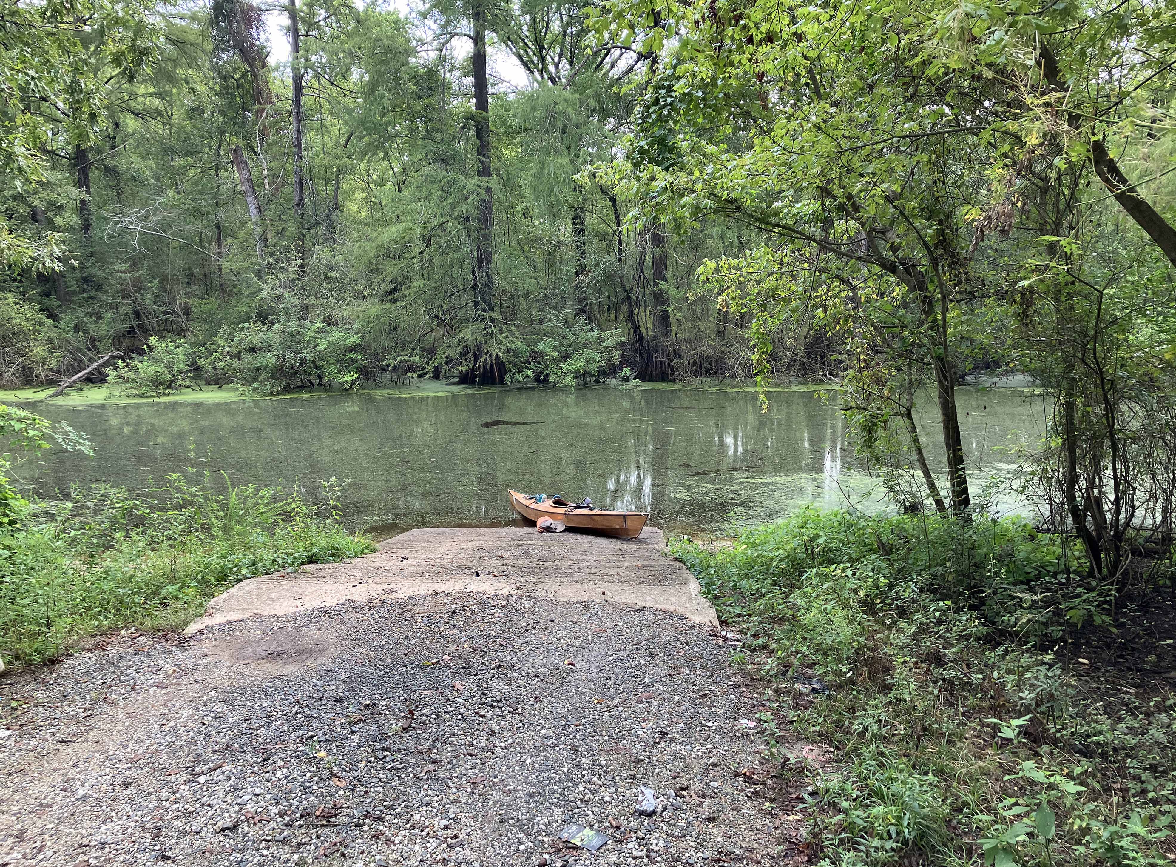 Kayak paddle route trail map on the Mercer Bayou located in the Sulphur River WMA south of Texarkana, Arkansas. This area is included in the Arkansas Game and Fish Commission Water Trails program. This trip was my second one here, and it launched at the end of a small county road 109, a spot called Mercer Bayou Boat Ramp No. 3. The trip has an out and back leg to the south and an out and back leg to the north. At the southern end there is another boat launch but further progress is blocked by an earthen barrier and closed water gate. The southern leg was swampy paddling through duckweed and watermeal and, in early afternoon, almost completely silent, spooky, like it might have been 100 years ago, or so I imagine. I think it’s the watermeal that gives the gritty feeling on your hands when you paddle. The northern leg entered wider, more open areas of the bayou with lots of lily pads and lotus. An Arkansas Game and Fish guy I talked to said he recently had the bayou treated in order kill off the Cuban bulrush growing along much of the shoreline. Saw nobody the whole trip.