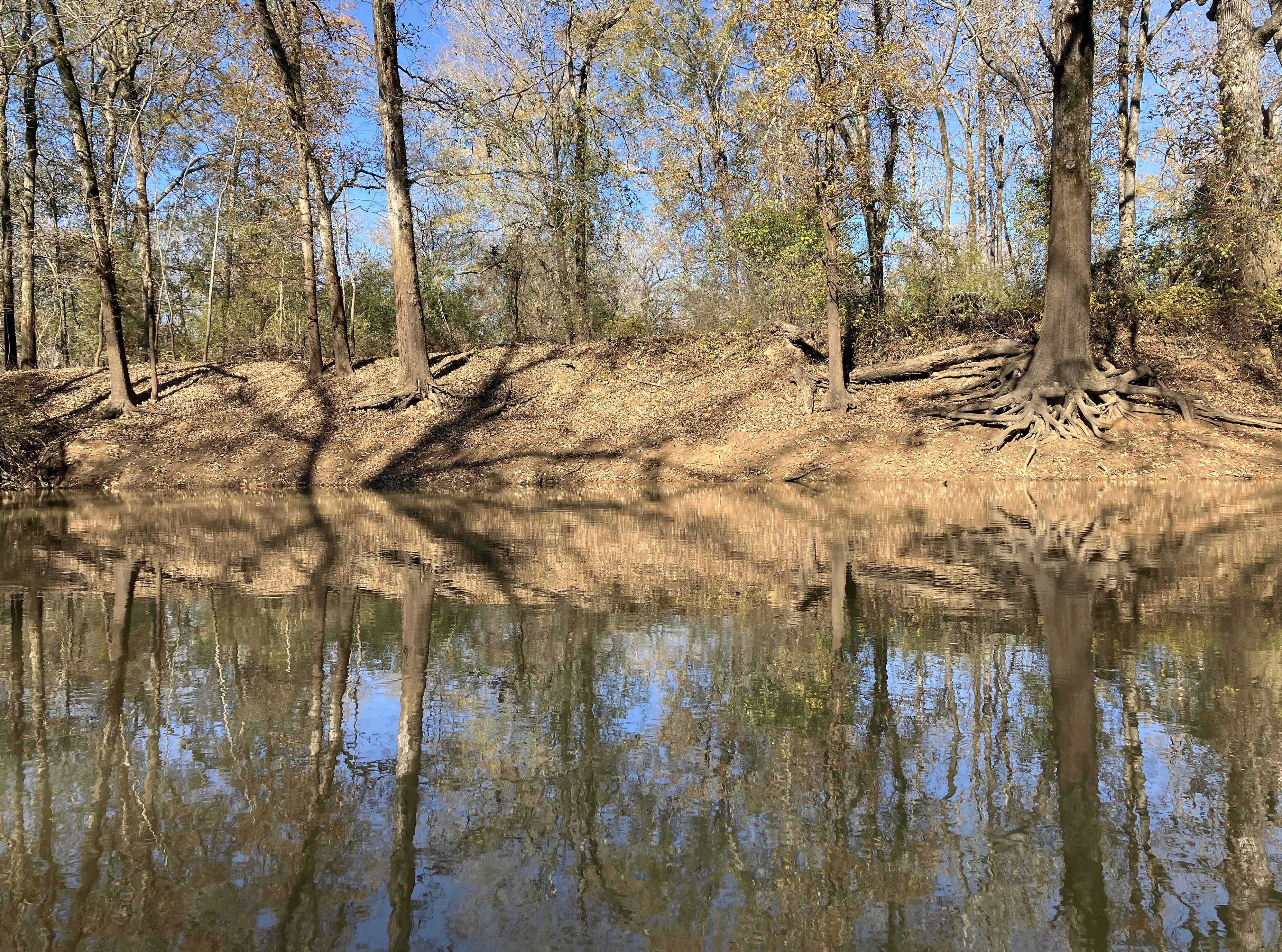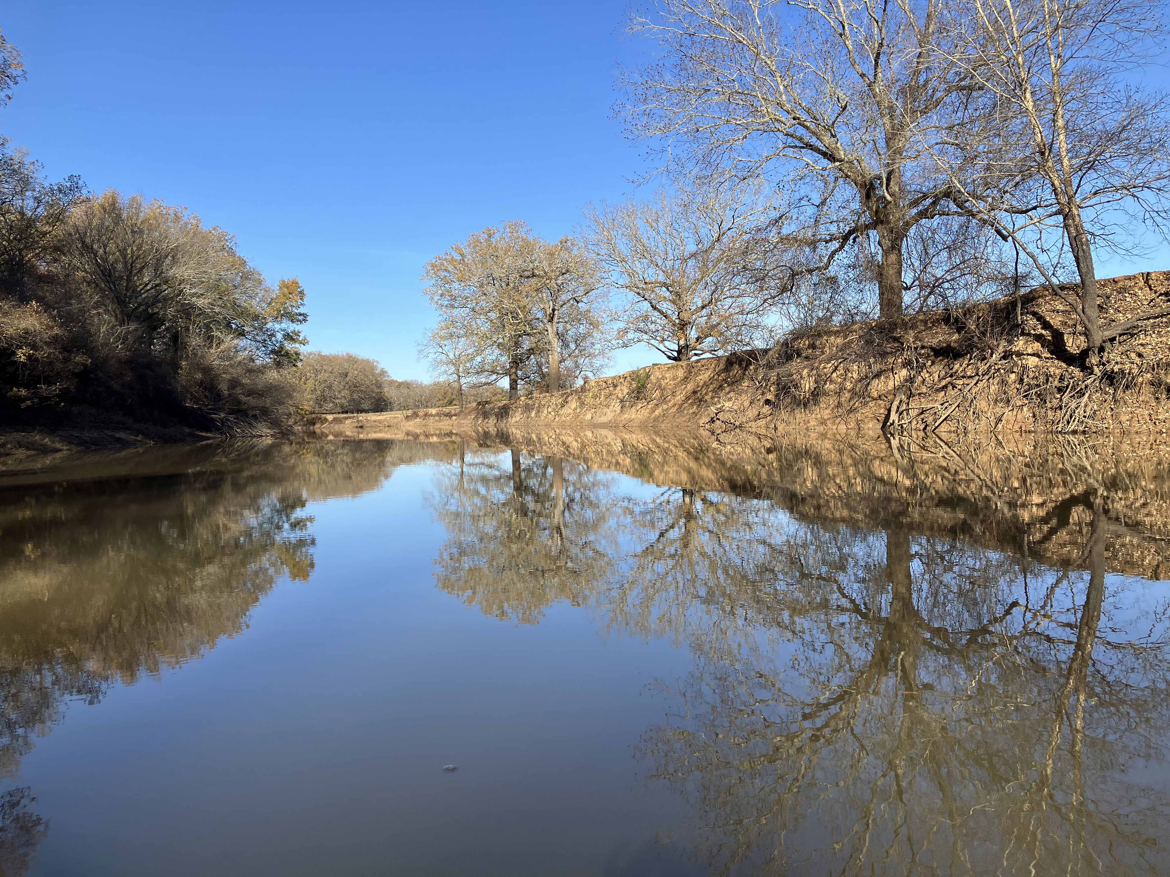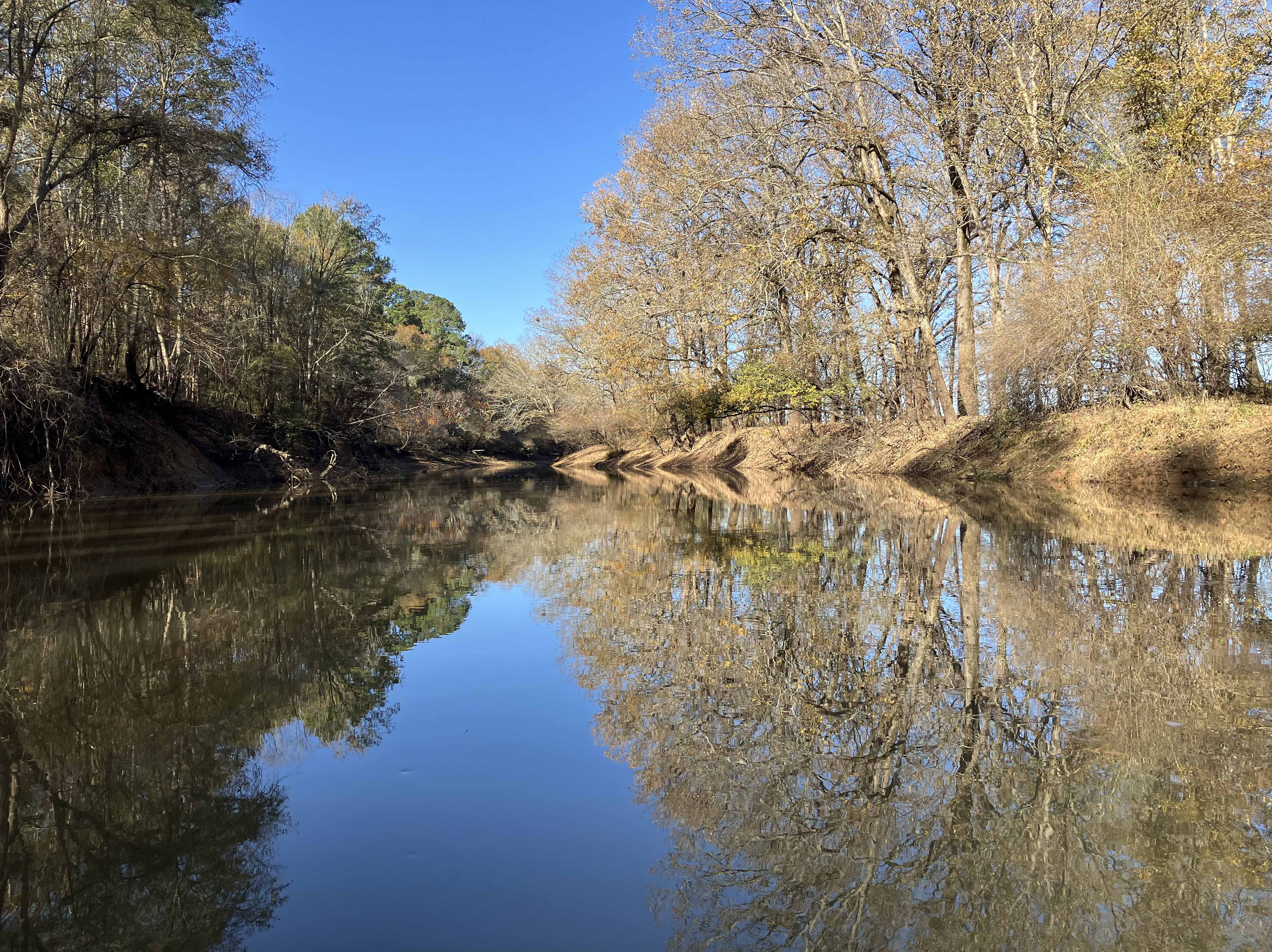 Kayak paddle route trail map on the Neches River starting at the CR 1155, CR2829 put-in. This route starts at an out of the way launch in the Davy Crockett National Forest. It is actually the put-in for the ‘downstream to Highway 7’ Crockett Trail. But the route here goes upstream about 10 miles to an ‘I’m done’ turnaround point and returns to the launch. Took approximately three hours up and two hours back, more or less, with the Neches at Hwy 294 gage reading 320 cfs and the Neches at Hwy 7 gage reading 460 cfs. A bit of current so easier coming back. The forest adjacent to the river in this section tended to be deciduous/hardwoods, less densely packed, even some cleared fields, with fewer sections closed in by tall east Texas pines. The river is the eastern boundary of the Davy Crockett National Forest, although some of this may be private inholdings–there were a few houses along the river and one or two private launches. Upstream of the put-in the river is fairly wide and no portages were necessary, but towards the turnaround point where the river is oriented north-south the geography changes. There you can see by google maps that the river wanders and takes some side channels and in that area the main course narrows and things get a bit more brushy, although still not too bad. Overall nice winter paddle, super bright day.