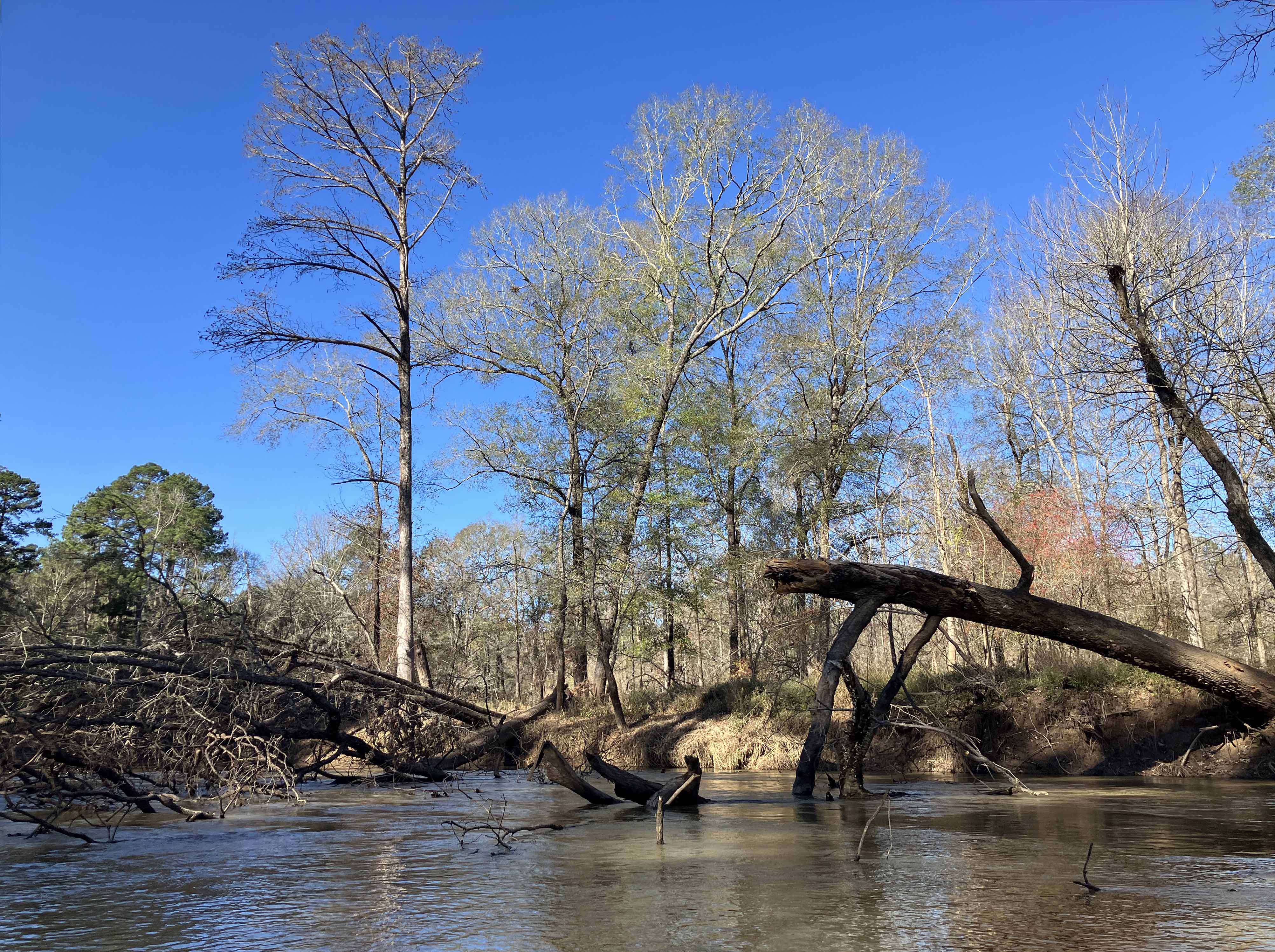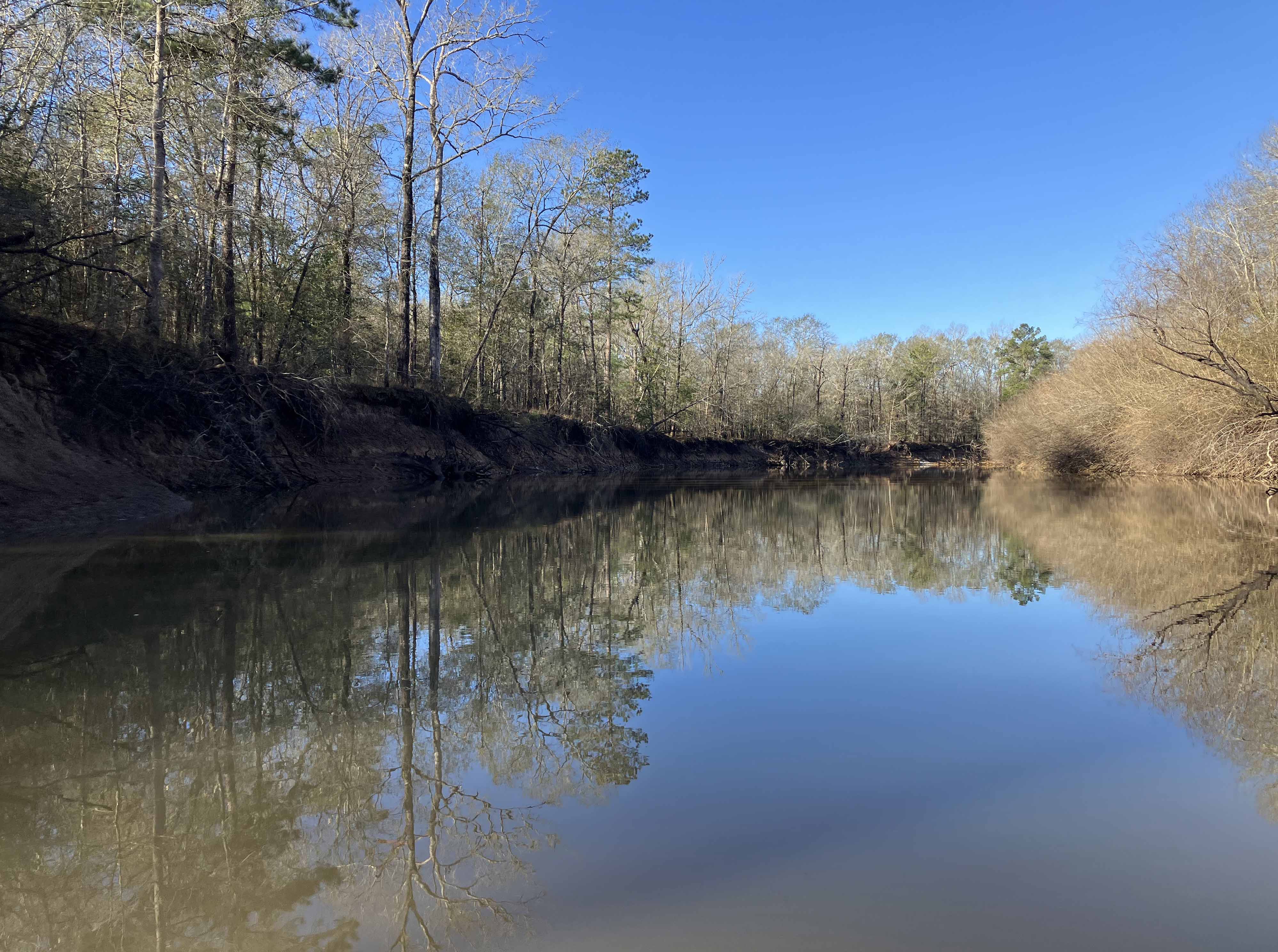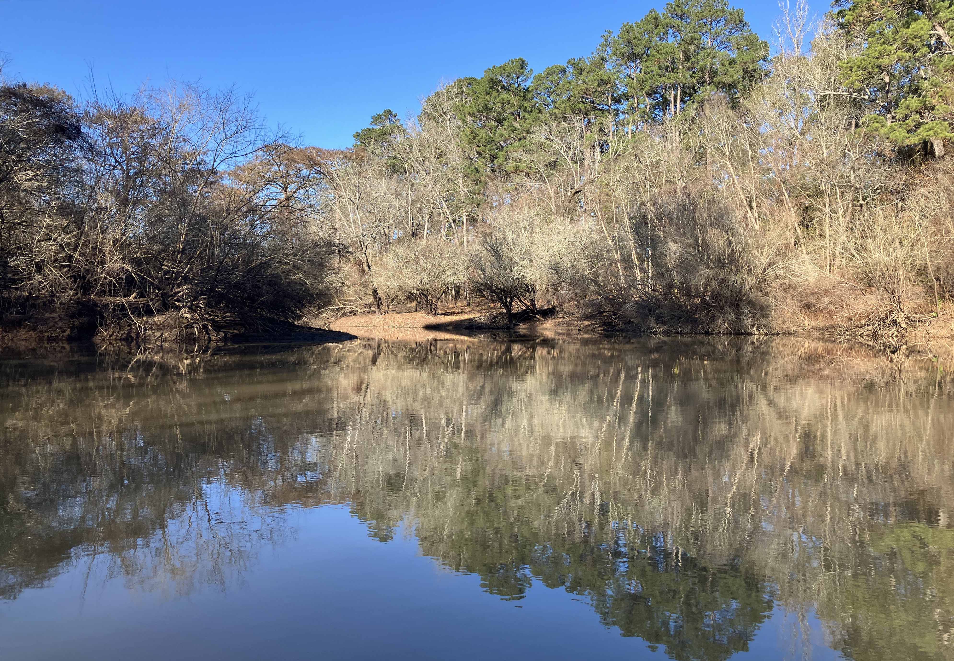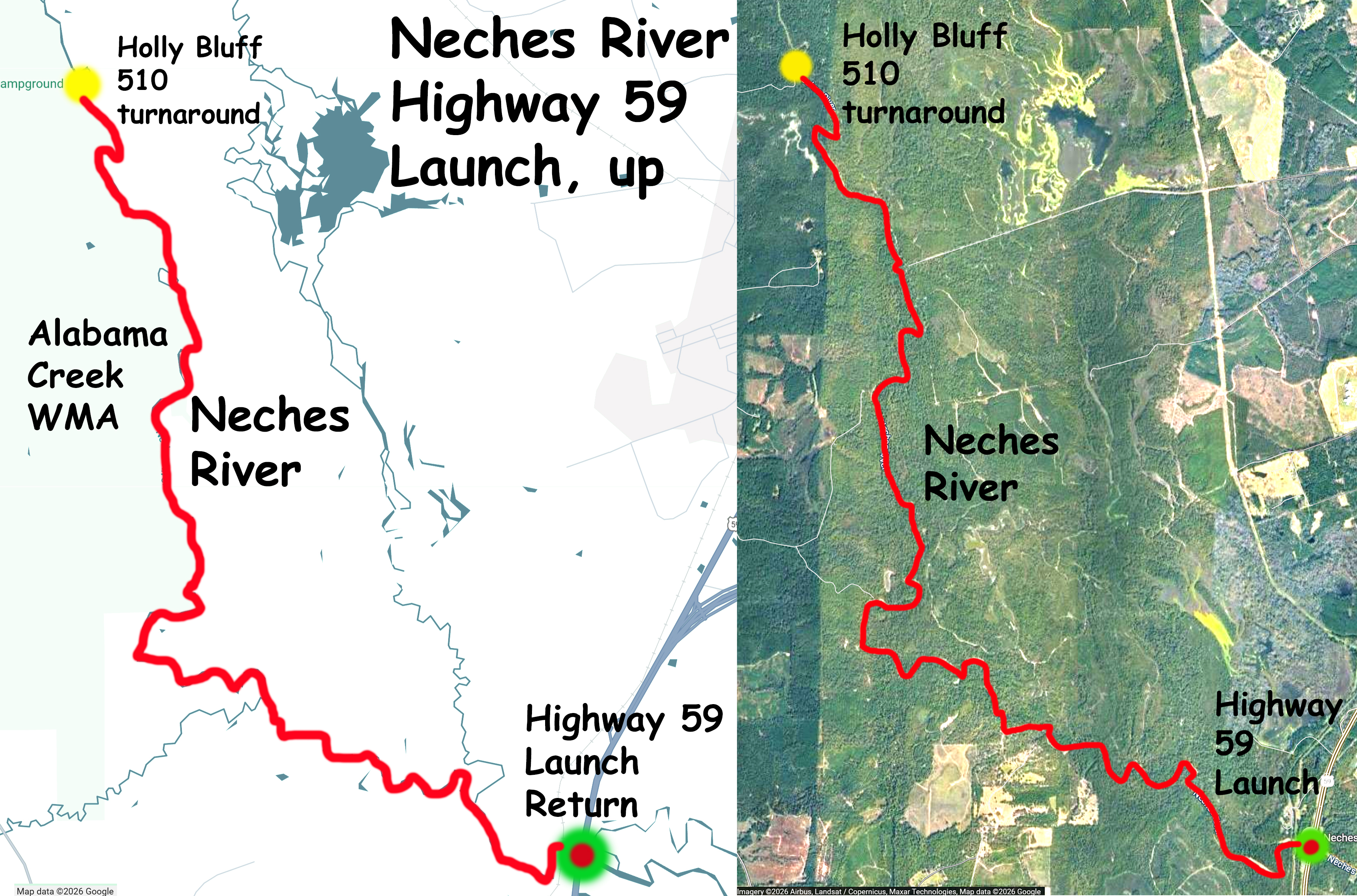 Kayak paddle trail route map on the Neches River, launching at Highway 59 just south of Lufkin Texas. Cold but sunny winter morning, perfect paddling weather, went upstream about 9-ish miles to the Holly Bluff Campground/510A turnaround, and back again. Roughly three hours up and two hours back with Neches Rv at Diboll TX at 395 cfs. Some trees and brush along the way but only two get out of the boat jams, both up and over. Guys at the launch said they had seen alligators in this area before, but not for me today, only pigs and possums. Part of this section of river is the eastern boundary of the Davy Crockett National Forest and the Alabama Creek WMA. Nice stretch to paddle, very pretty.