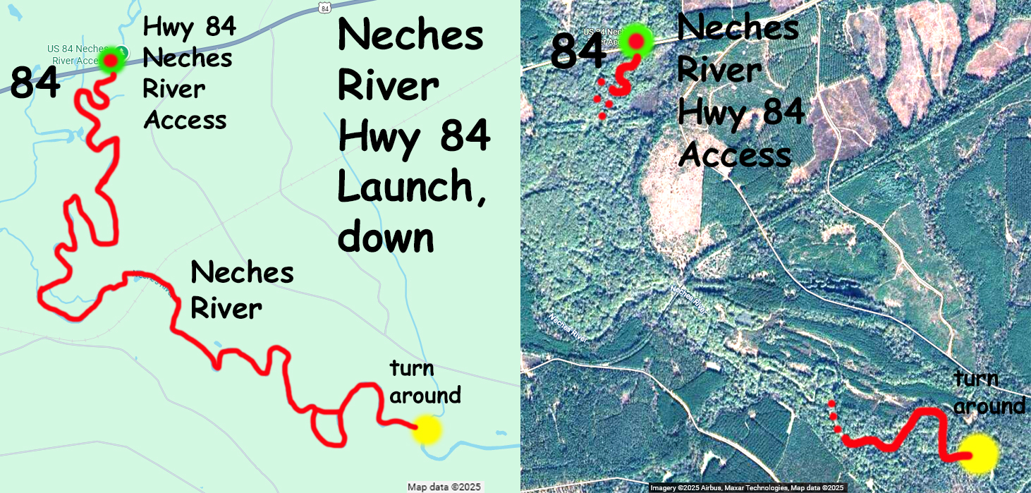 Kayak paddle trail route map on the Neches River, launching from the Highway 84 Access Point, between Palestine TX and Rusk TX. An earlier trip went upstream first, but the route here is a down and back. I limited the down time to about one and a quarter hours, unsure how long it might take to return (about hour and three quarters). Overall a bit shorter than I wanted but its good to get a sense how the flow numbers relate to the experience itself. For this trip the Neches River at Neches gage read about 270 cfs and the gage at Hwy 294 read about 440 cfs. The area around the Hwy 84 Access is interesting because it is narrow and swampy, but further downstream the river opens up and has the more usual forested Neches feel. Progress was mostly clear because limbs had been sawed by fishermen/hunters; one portage going downstream and a couple coming back. Afterwards drove along County Road 1225 and Cherokee Hunting Club Road to assess a downstream put-in spot. Nice drive.