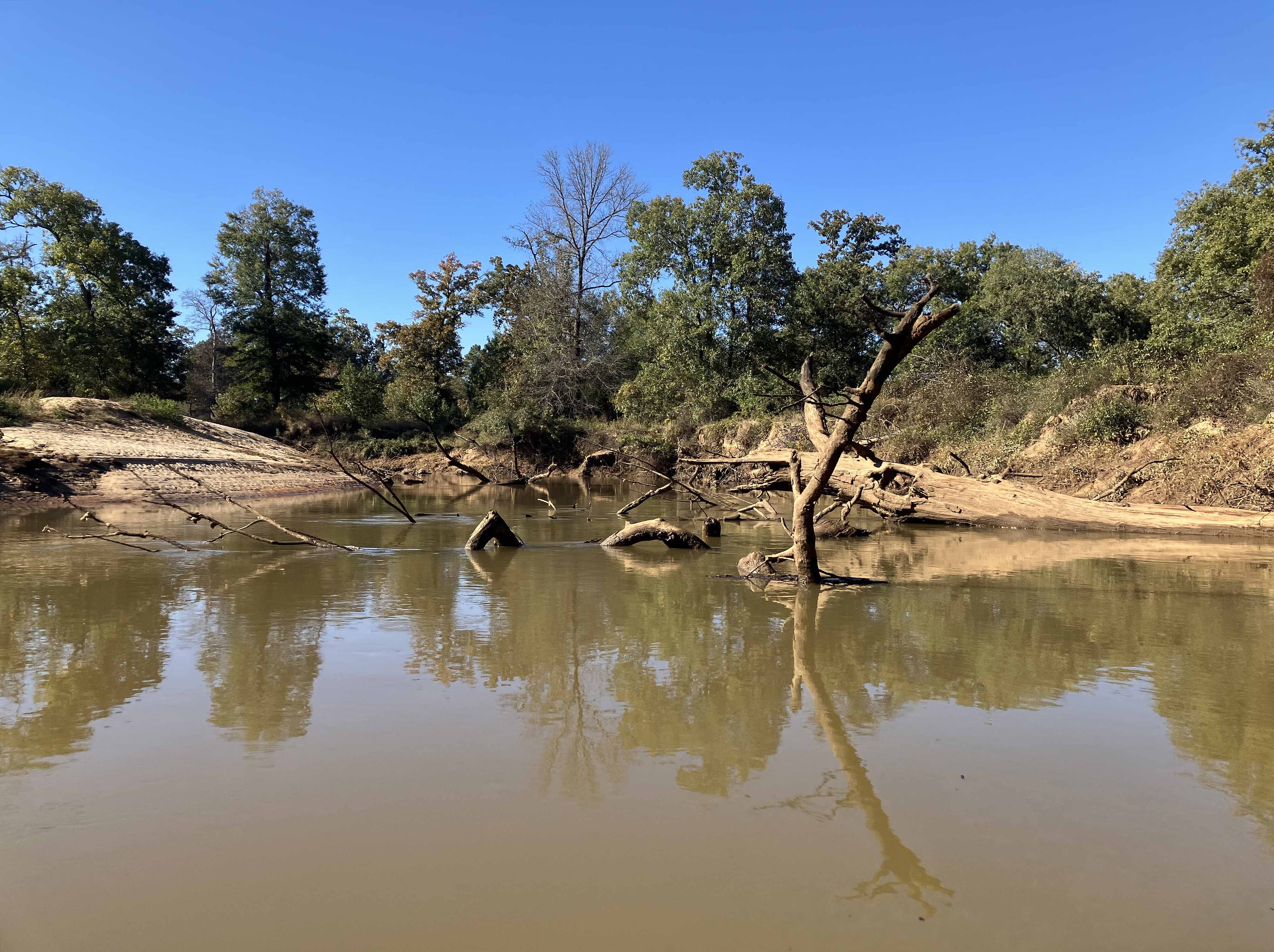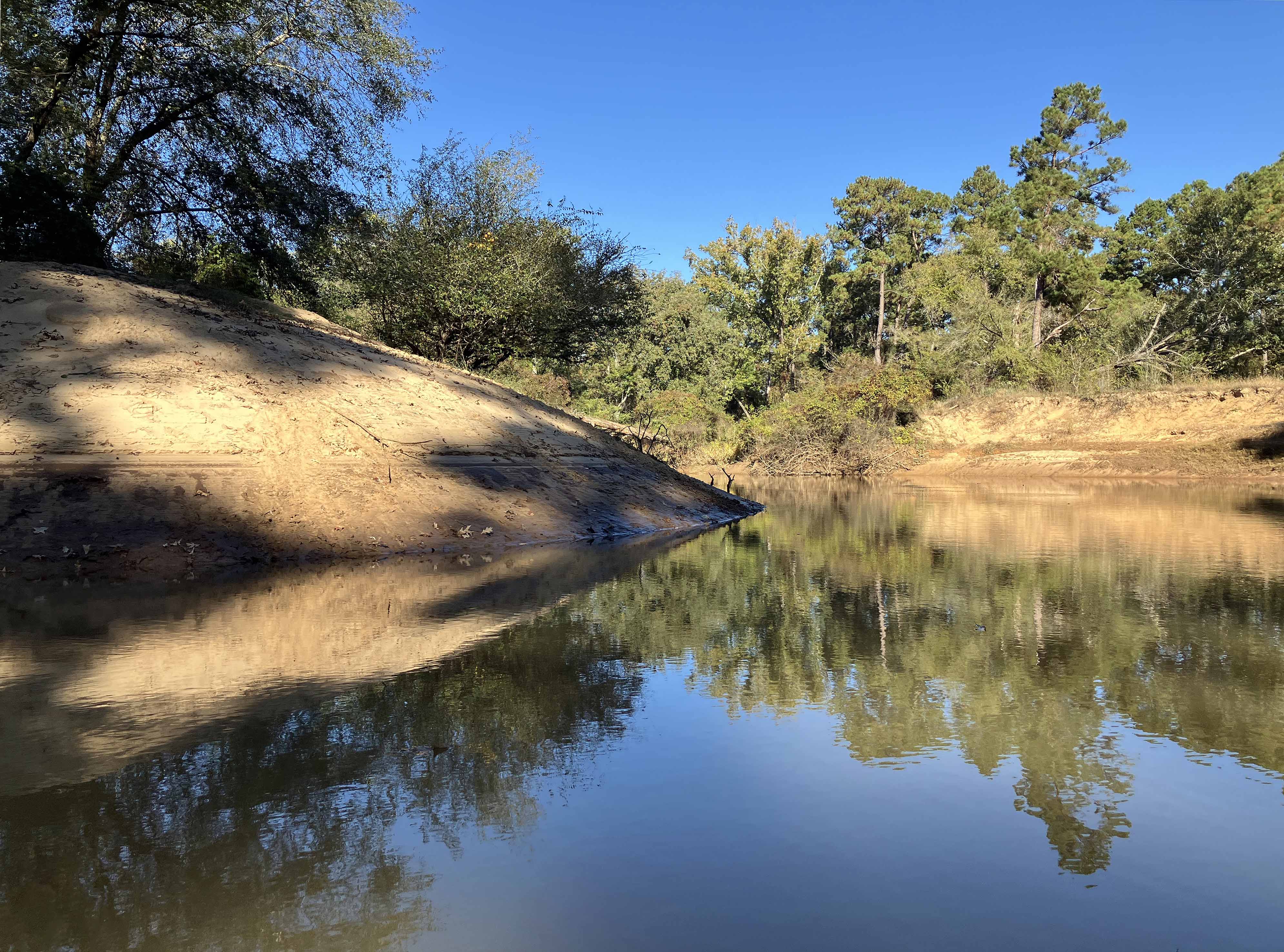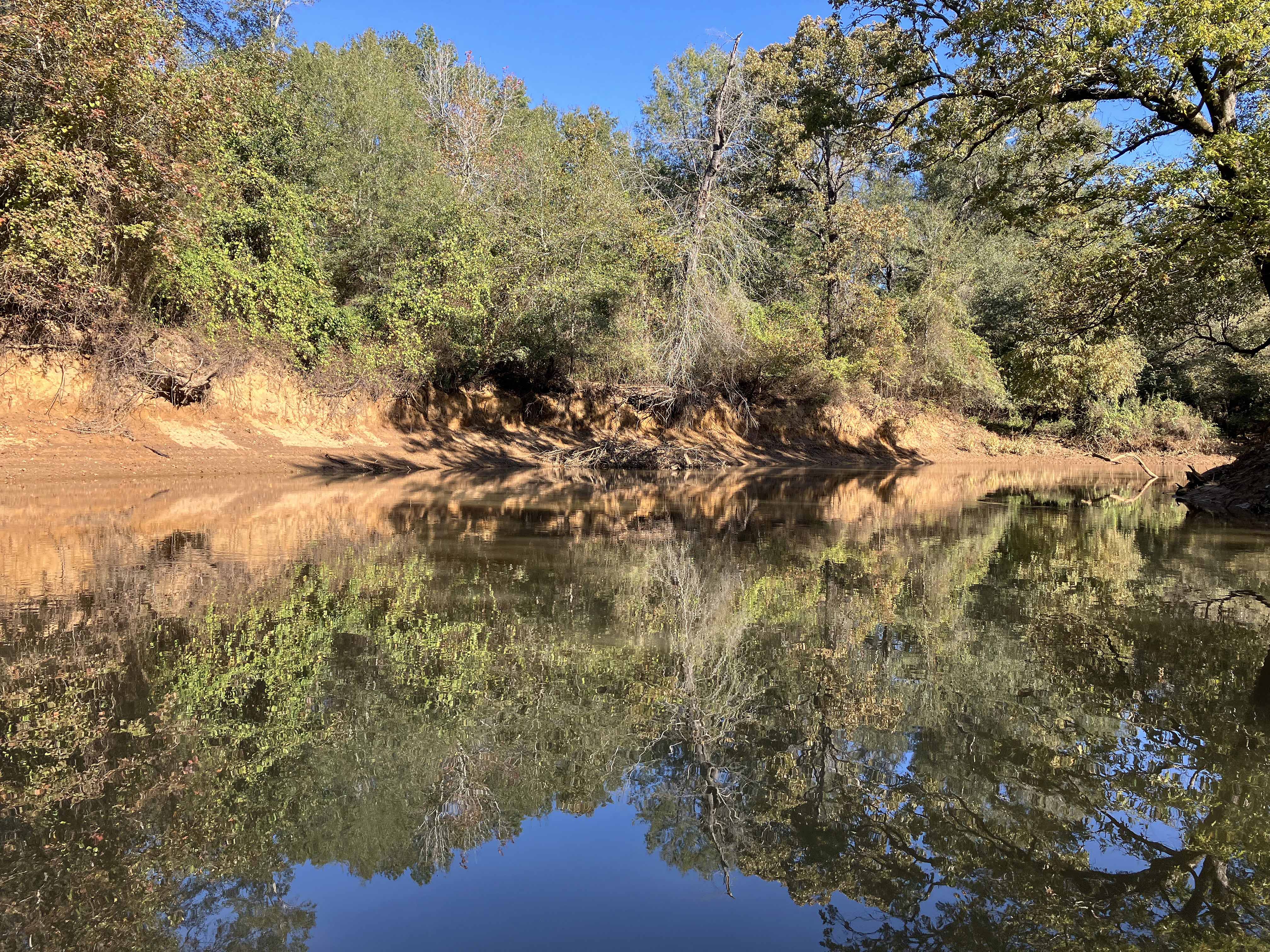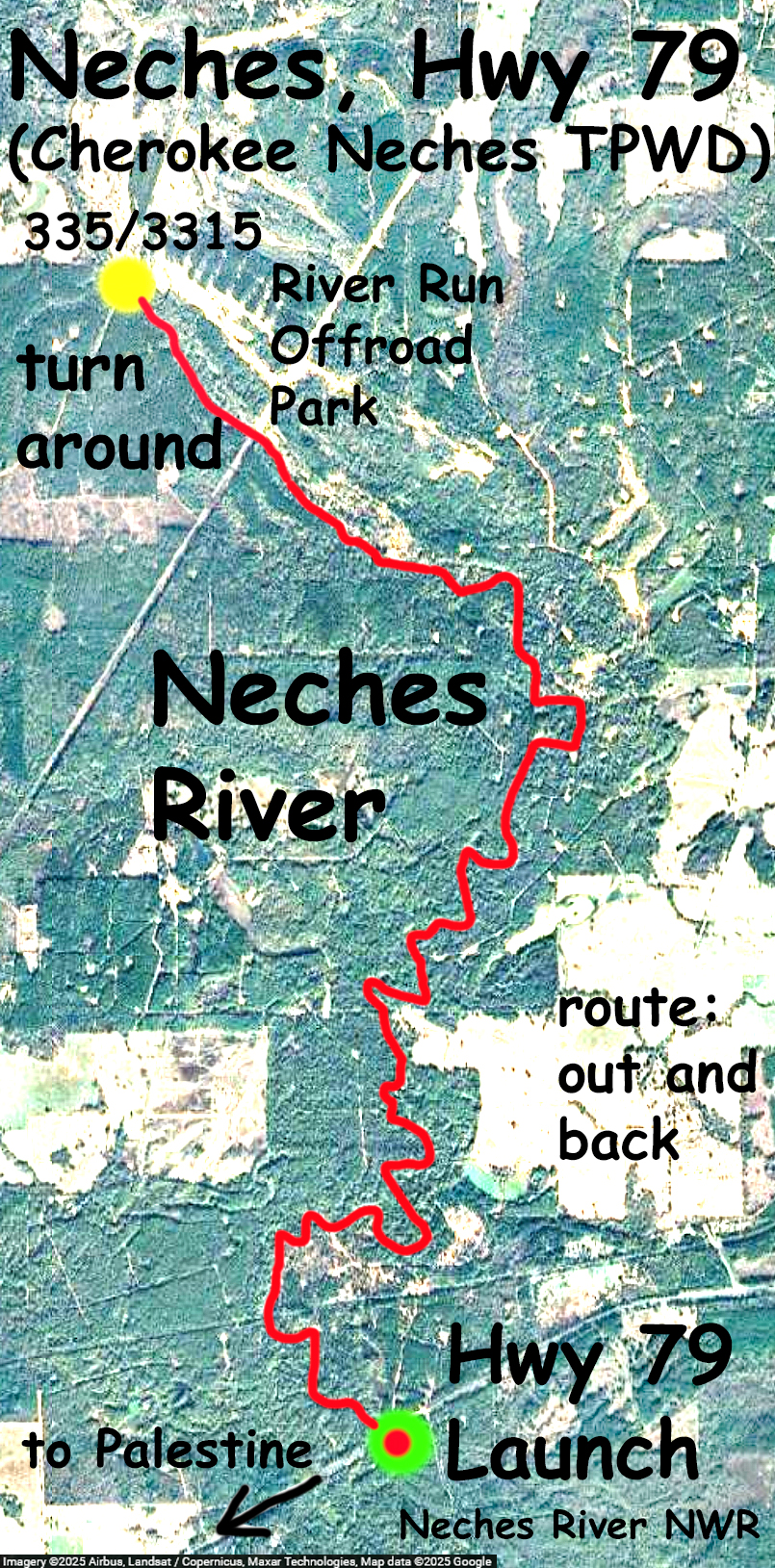 Kayak paddle trail route map on the Neches River near Palestine, Texas. The route here starts at the Highway 79 put in, goes upstream to the 335/3315 bridge near River Run Offroad Park, and returns to the launch. The route is the same as the “Cherokee Neches” trail on the TPWD paddle trails site. That one is a point to point, north to south, going one way downstream. Nice fall paddle, clear weather and cool. There was quite a bit of fallen tree debris in the river but only two or three spots required ‘get out of the boat’ workarounds. The rest could be solved as little paddling puzzles, over, around, under, etc. Or by scooching, the unh unh unh to get off of a high center, there was quite a bit of that. The turnaround point, about 6.5 miles up, is the bridge near the River Run offroad park. Across Highway 79 is the Neches River NWR; a dirt road leads into the refuge and there are several nice hiking trails. Didn’t see much wildlife on the paddle this day, but the scenery was great. The USGS gage Neches Rv nr Neches read about 120 cfs, mild current. It took about 2 hours to go up and an hour and a half to get back.