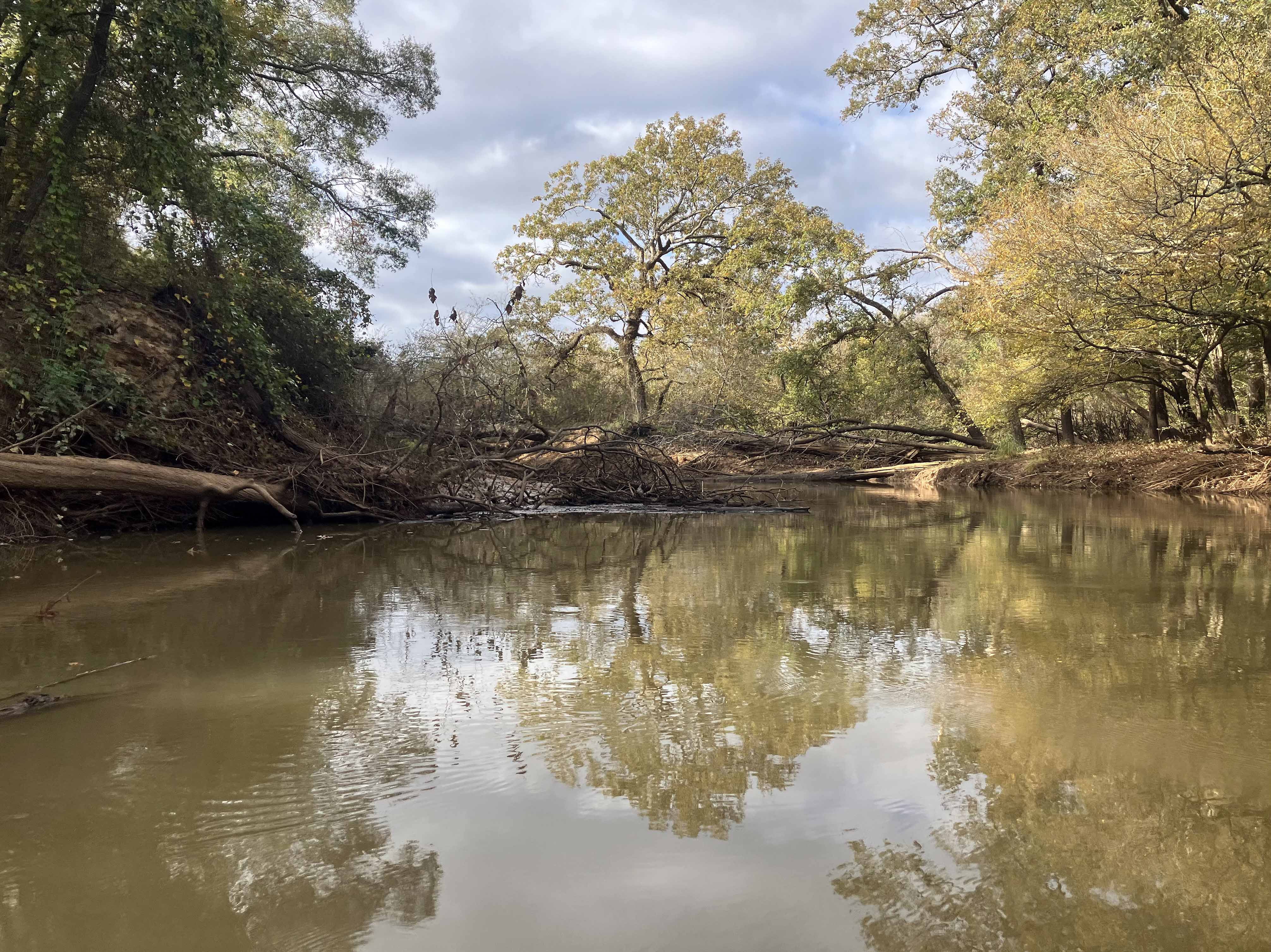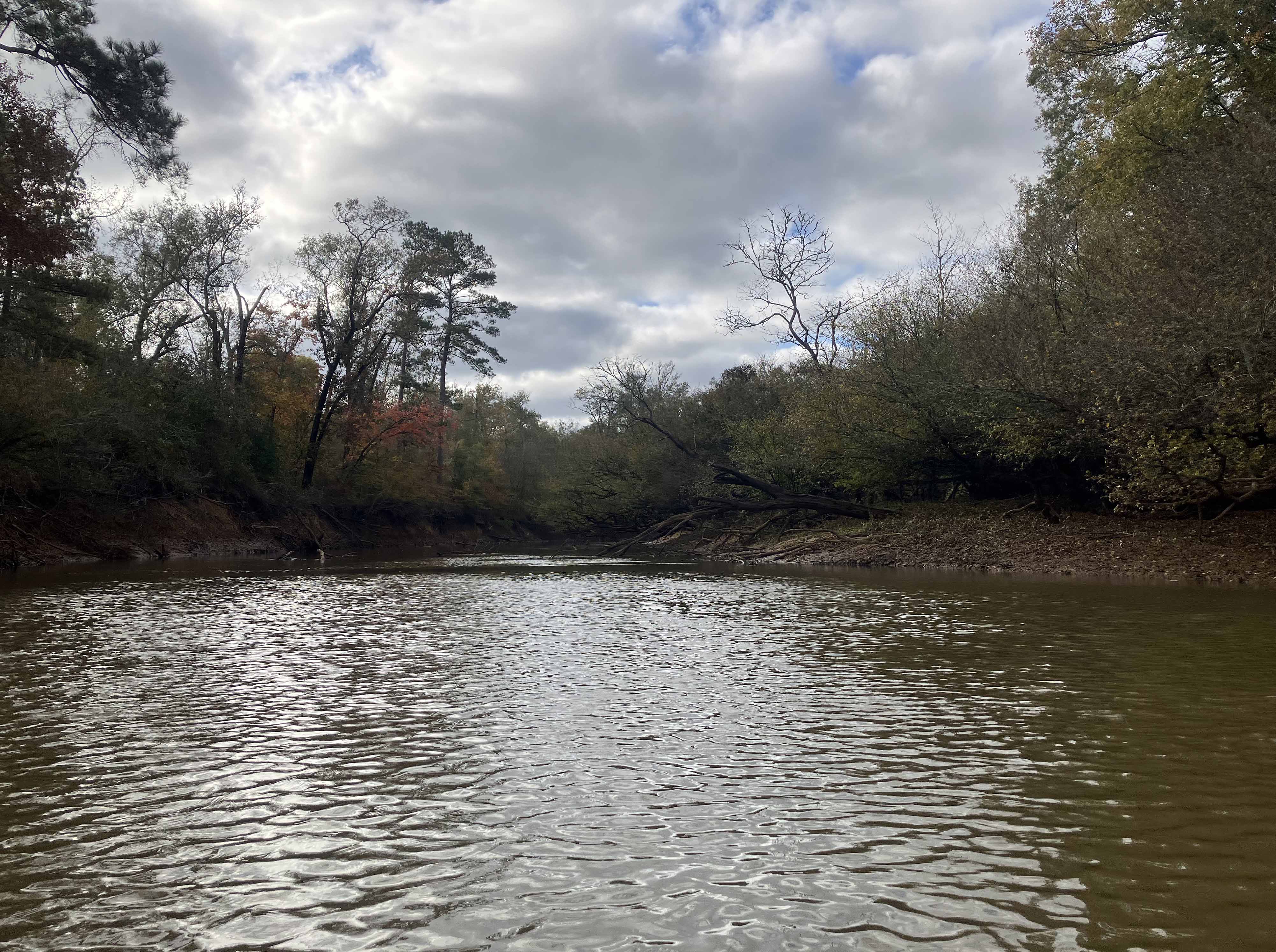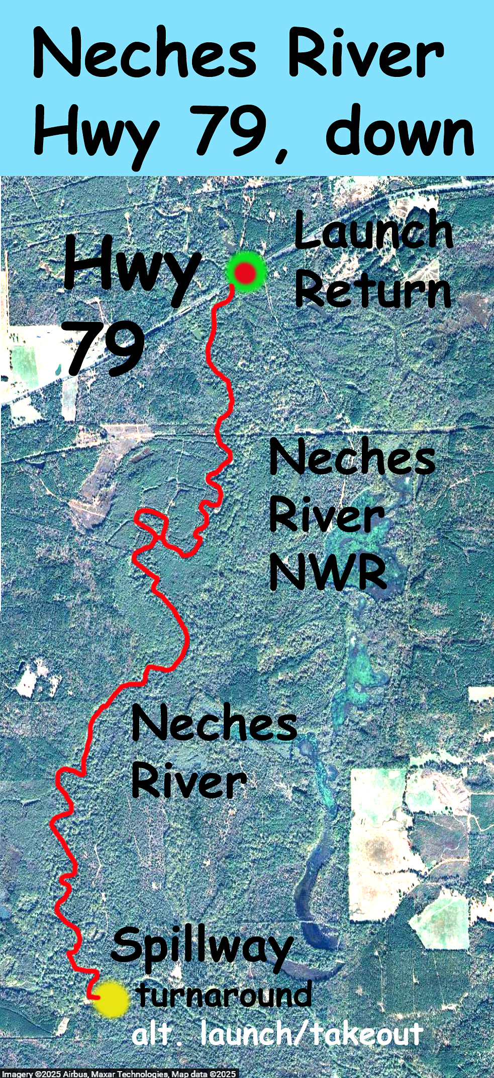 Kayak paddle trail route map on the Neches River, starting at the Highway 79 Launch near the Neches River NWR. Another trip started at this launch and went upstream first; this one goes downstream first, then back upstream to the launch. The time down was an hour and a half. With the slight current that meant a two hour return. The Neches River nr Neches USGS website was about 110 cfs, similar to the upstream trip. The feeling of this region is nicer–more woodsy and isolated–than the upstream region, perhaps because the river borders the Neches River NWR. There was a lot of logs and brush to avoid in the river but only two get-out-of-the-boat portages. The plan was to go a mile or two further than the turnaround shown on the map, but there was a low water dam that I had not expected. Rather than portage this and go further it seemed convenient to call this spillway as the turnaround point. Turns out the spillway launch can be accessed off of Hwy 79 by taking roads 354 and 3542. This spot could provide a launch or takeout point roughly halfway between Highway 79 and Highway 84. I drove down there to check it out after completing the paddle. The last hundred yards of road before the river is pretty rough and would require a suitable vehicle. The day I did this paddle the refuge was closed for a special permit/lottery/draw type hunt. And when I returned to the Highway 79 launch I was examined?/quizzed? by a NWR Ranger who was looking for folks who were on the refuge hunting without authorization. As I understand, paddling the river is separate from activities on the refuge itself. Not much wildlife this time but terrific fall scenery. One snapping turtle though, which is pretty cool.