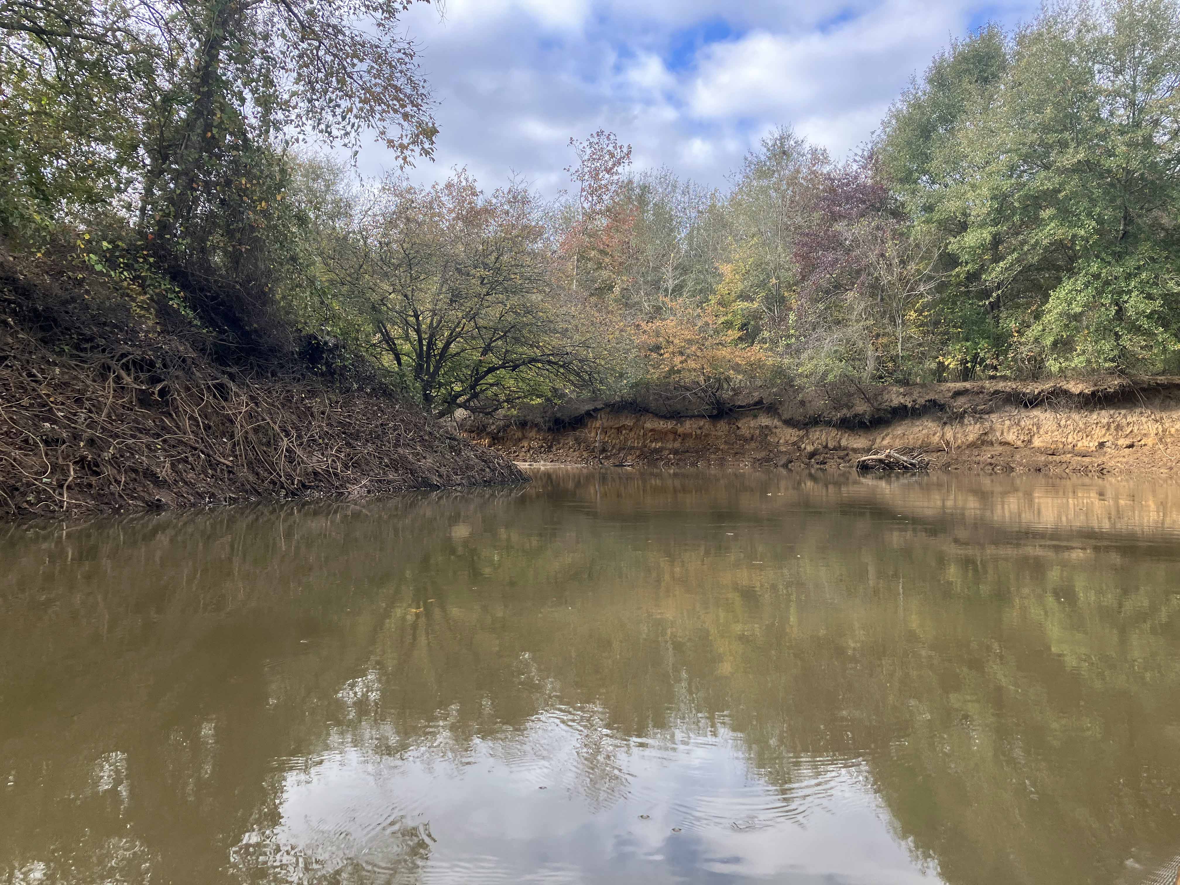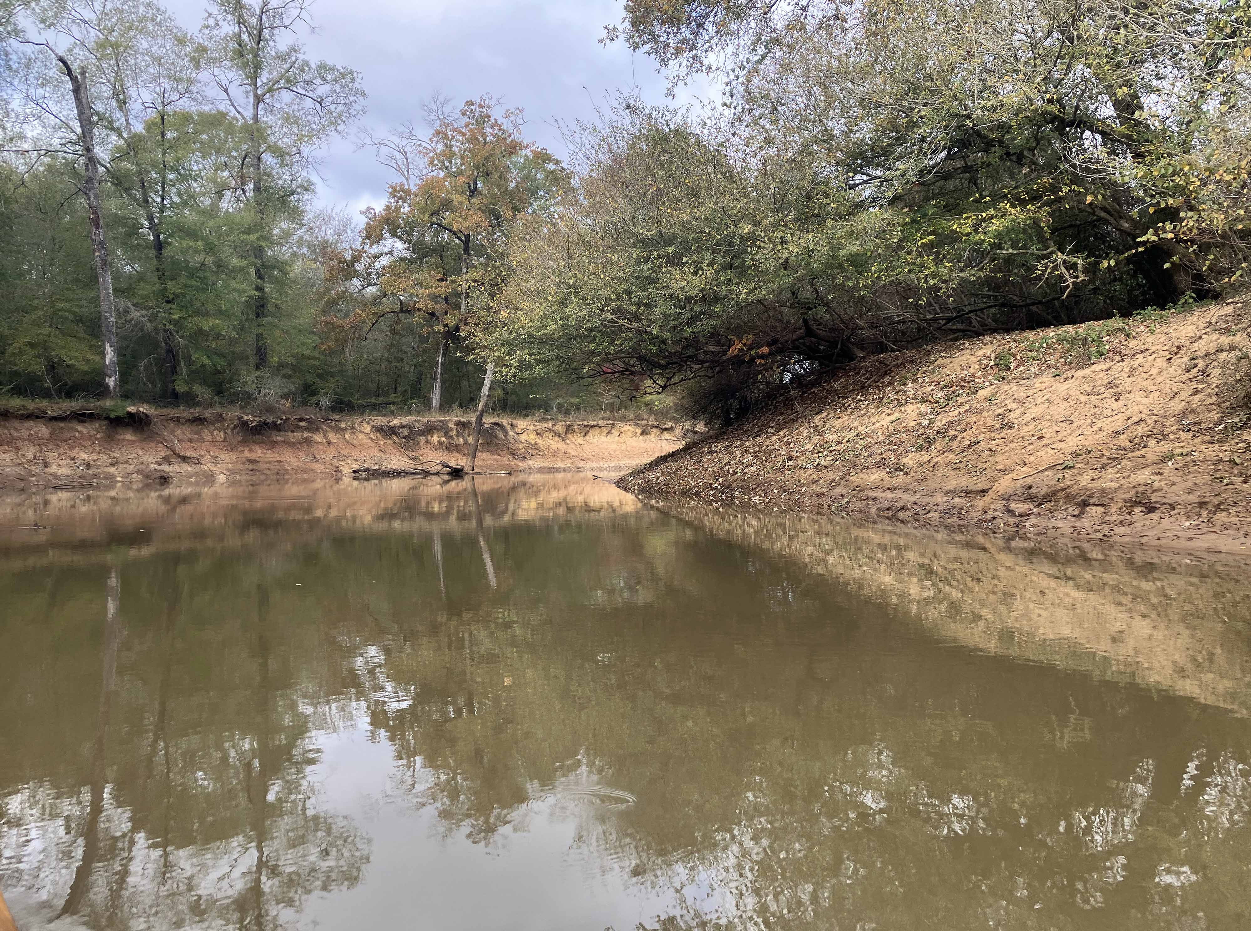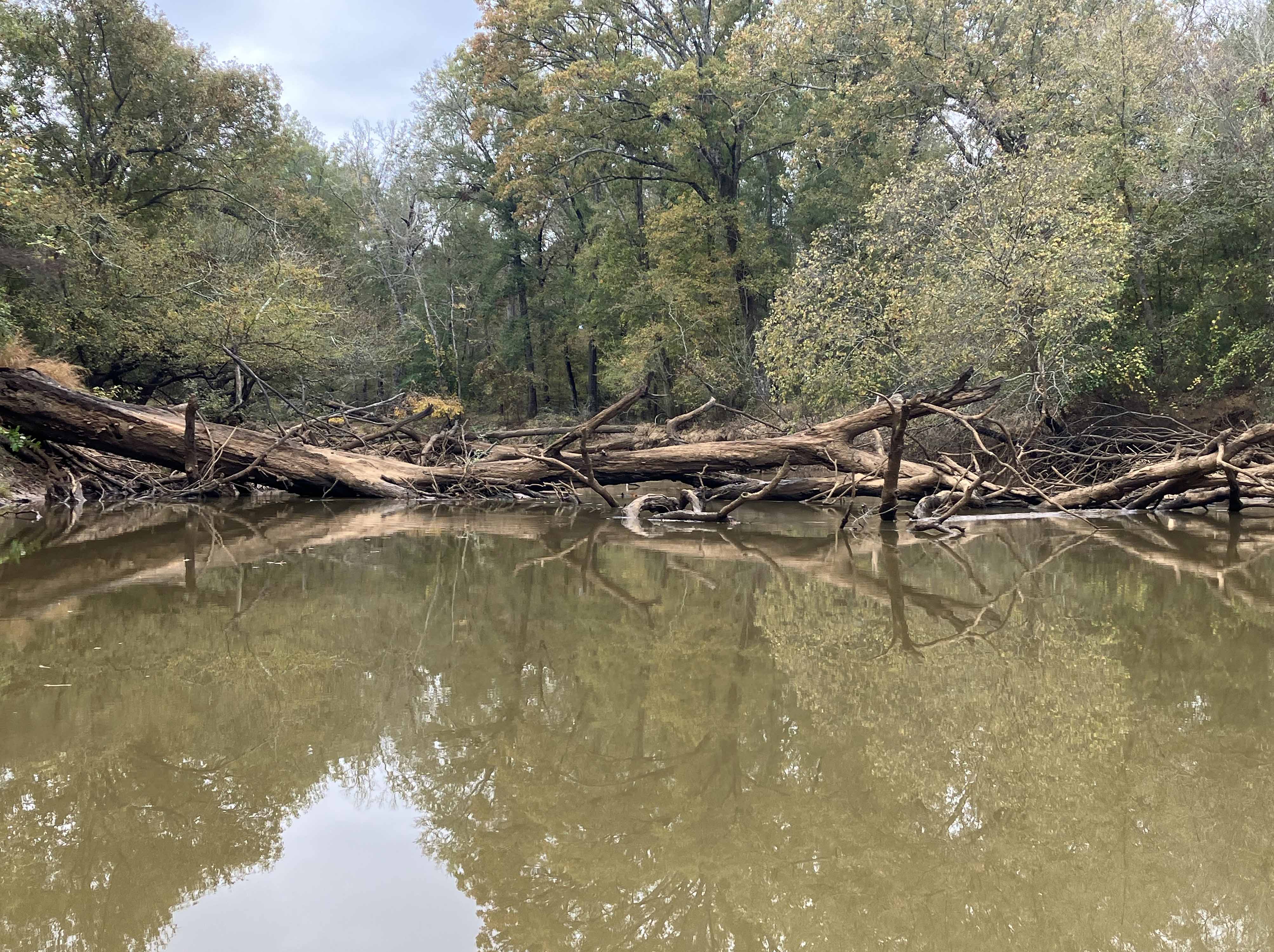 Kayak paddle trail route map on the Neches River, starting at the Highway 79 Launch near the Neches River NWR. Another trip started at this launch and went upstream first; this one goes downstream first, then back upstream to the launch. The time down was an hour and a half. With the slight current that meant a two hour return. The Neches River nr Neches USGS website was about 110 cfs, similar to the upstream trip. The feeling of this region is nicer–more woodsy and isolated–than the upstream region, perhaps because the river borders the Neches River NWR. There was a lot of logs and brush to avoid in the river but only two get-out-of-the-boat portages. The plan was to go a mile or two further than the turnaround shown on the map, but there was a low water dam that I had not expected. Rather than portage this and go further it seemed convenient to call this spillway as the turnaround point. Turns out the spillway launch can be accessed off of Hwy 79 by taking roads 354 and 3542. This spot could provide a launch or takeout point roughly halfway between Highway 79 and Highway 84. I drove down there to check it out after completing the paddle. The last hundred yards of road before the river is pretty rough and would require a suitable vehicle. The day I did this paddle the refuge was closed for a special permit/lottery/draw type hunt. And when I returned to the Highway 79 launch I was examined?/quizzed? by a NWR Ranger who was looking for folks who were on the refuge hunting without authorization. As I understand, paddling the river is separate from activities on the refuge itself. Not much wildlife this time but terrific fall scenery. One snapping turtle though, which is pretty cool.