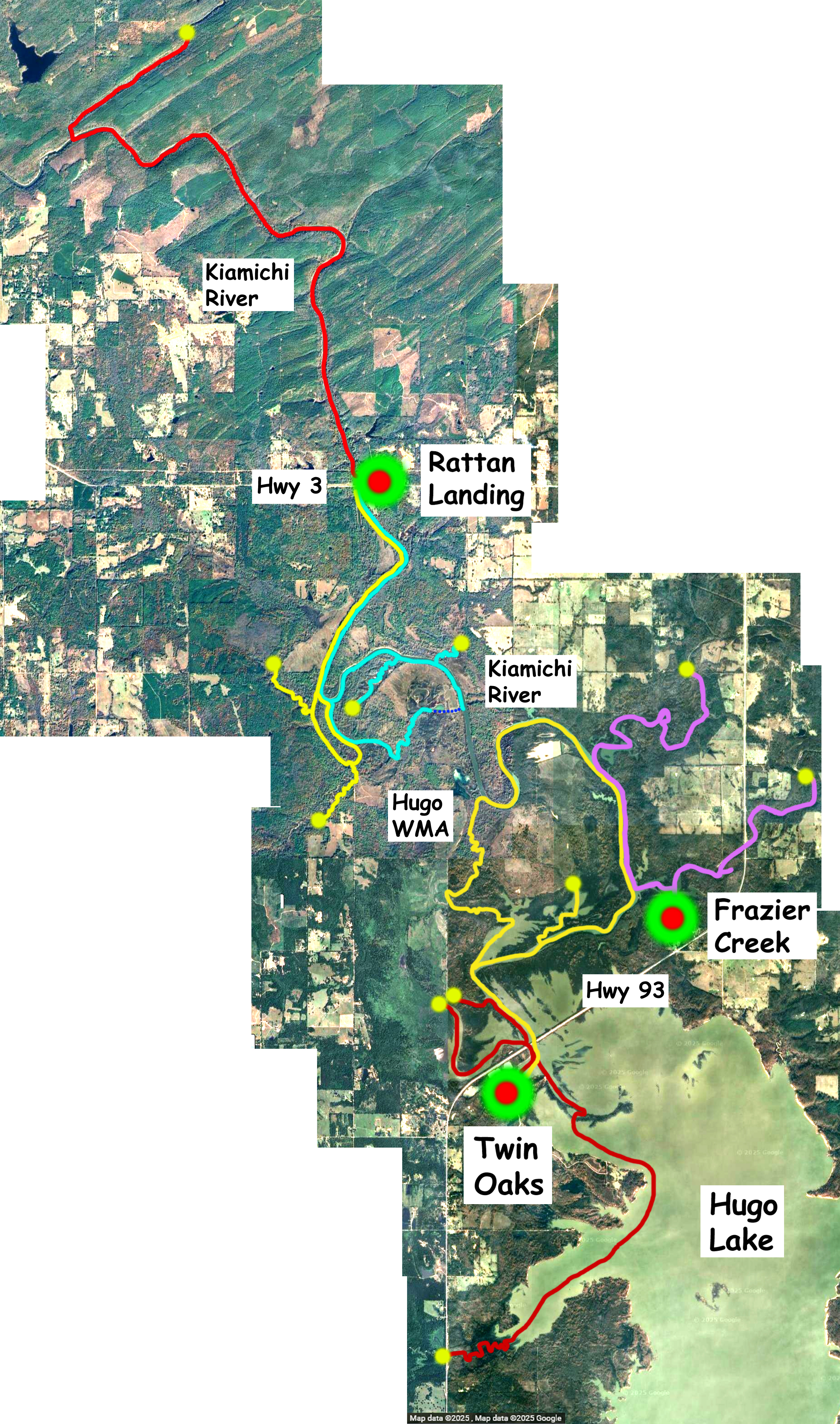 Above: Section by section kayak paddle trail route map of the Kiamichi River, Hugo WMA, Hugo Lake area in Oklahoma. All routes are loops or out and back. Click to expand map.
