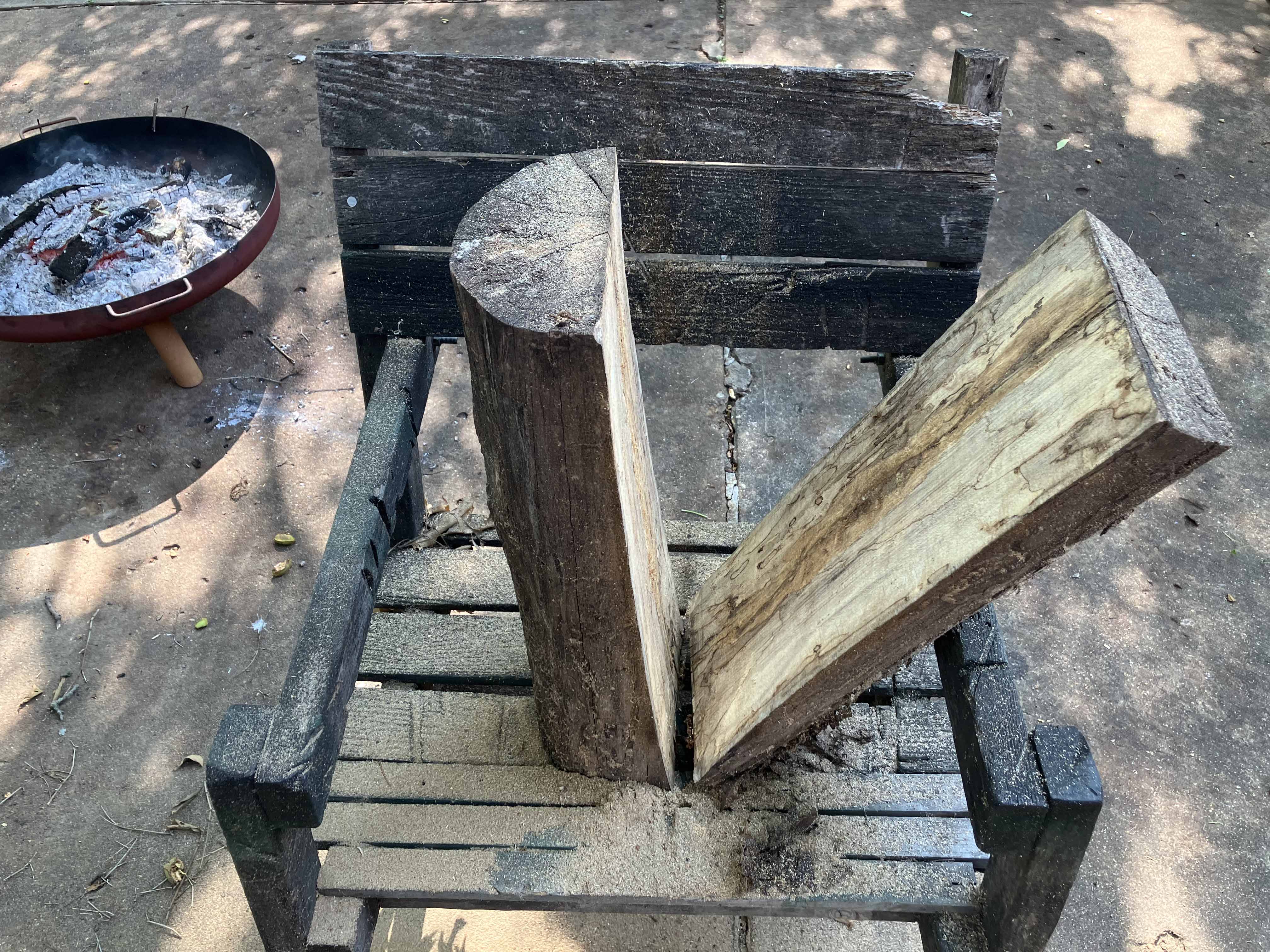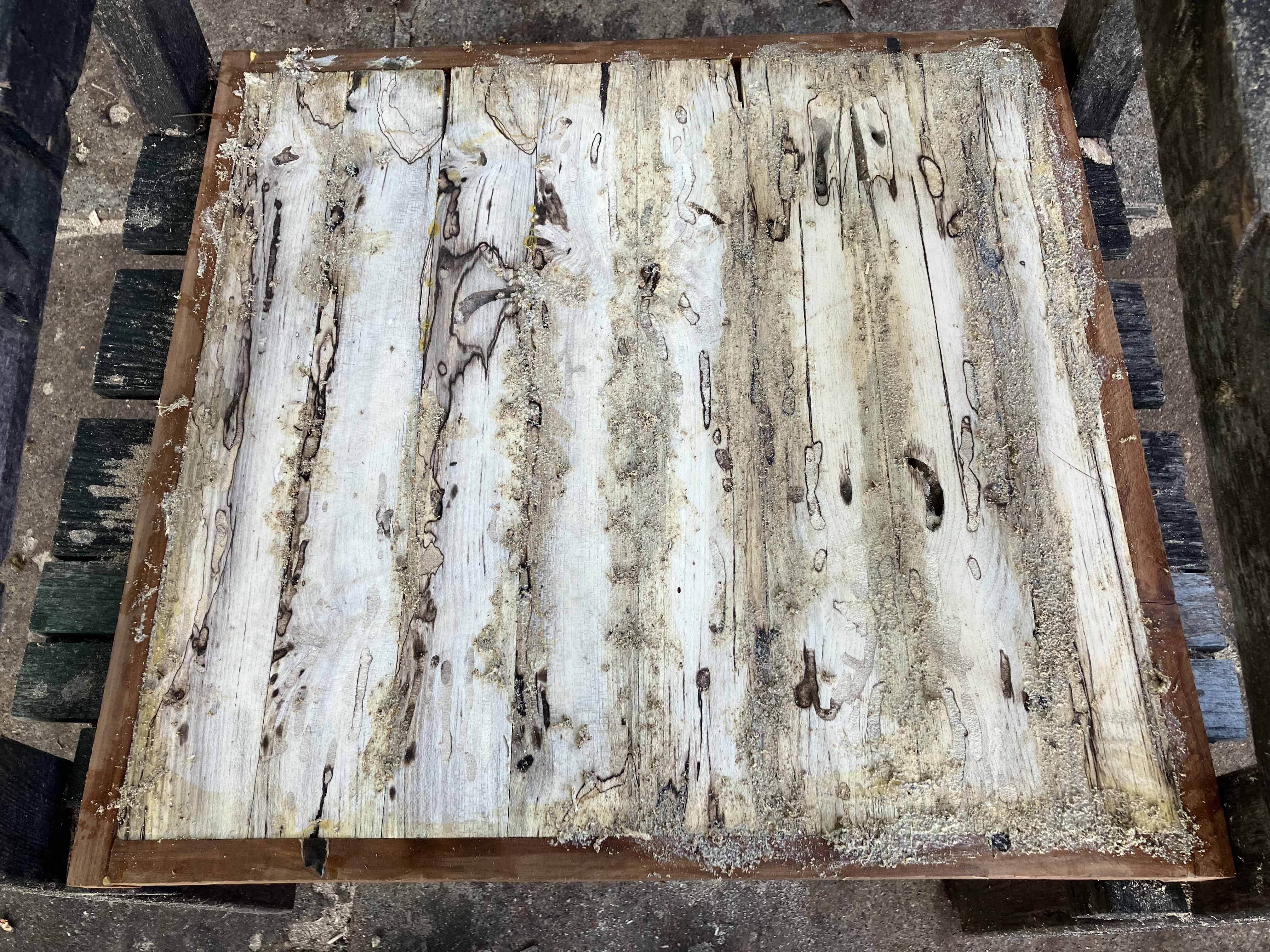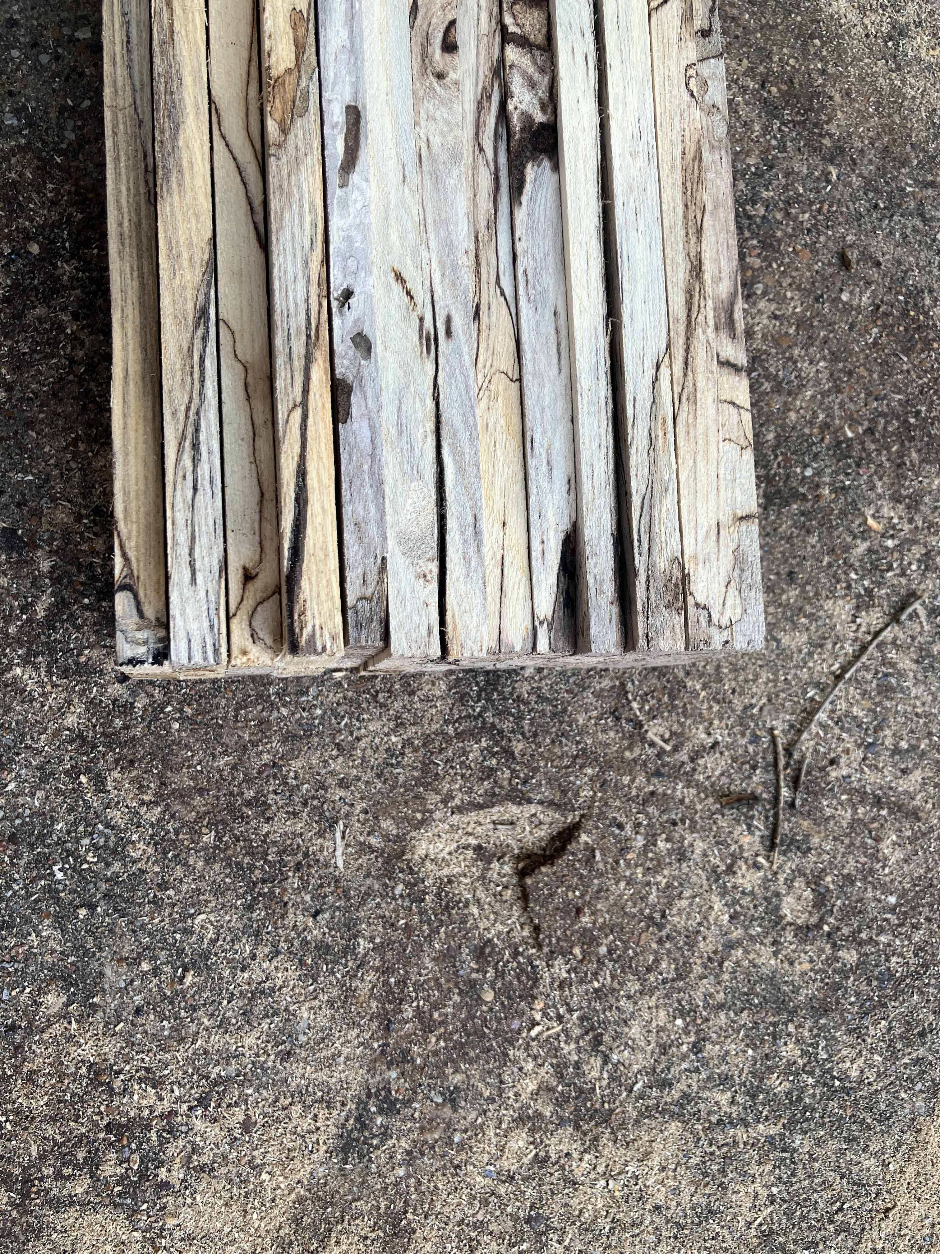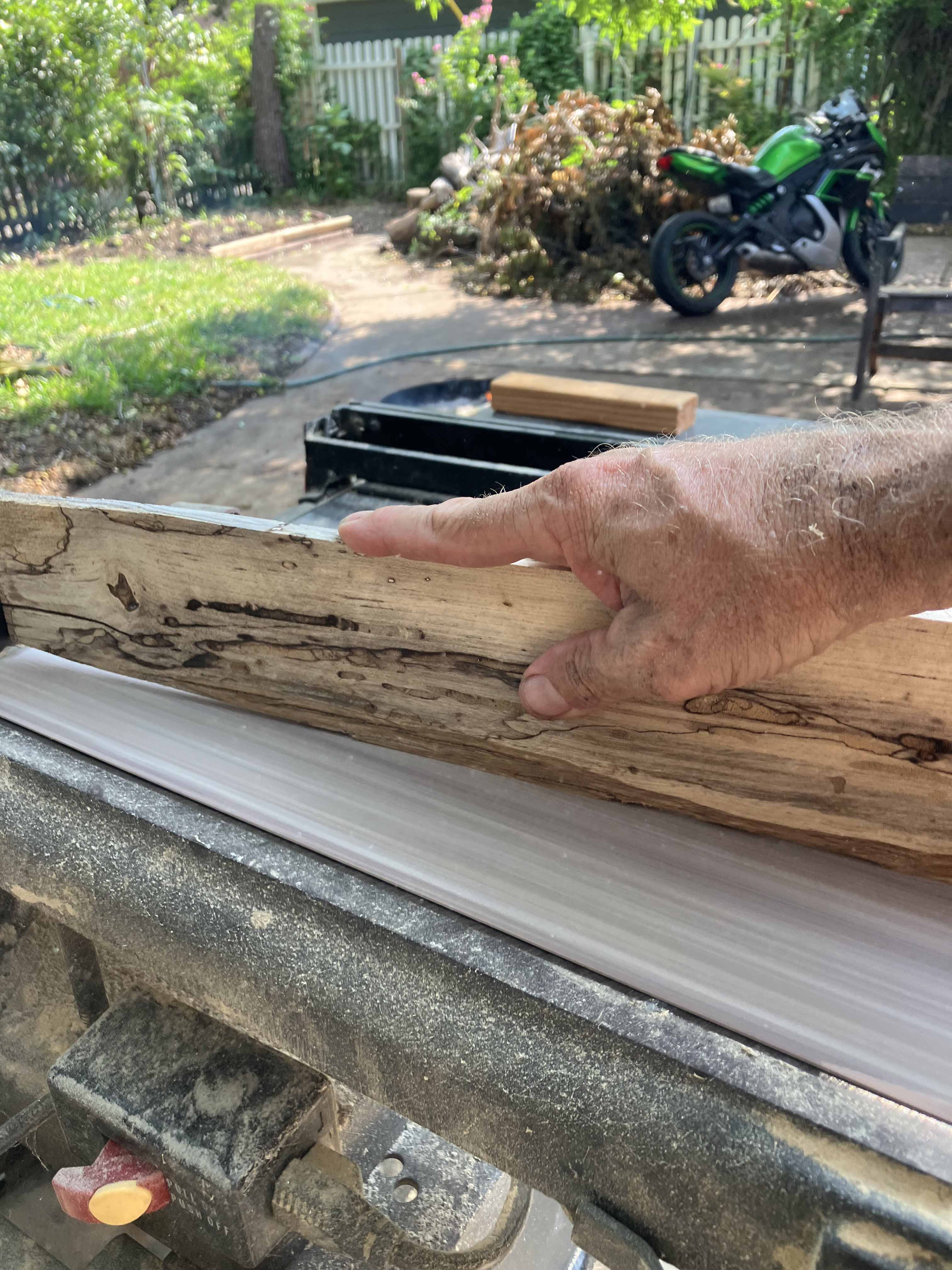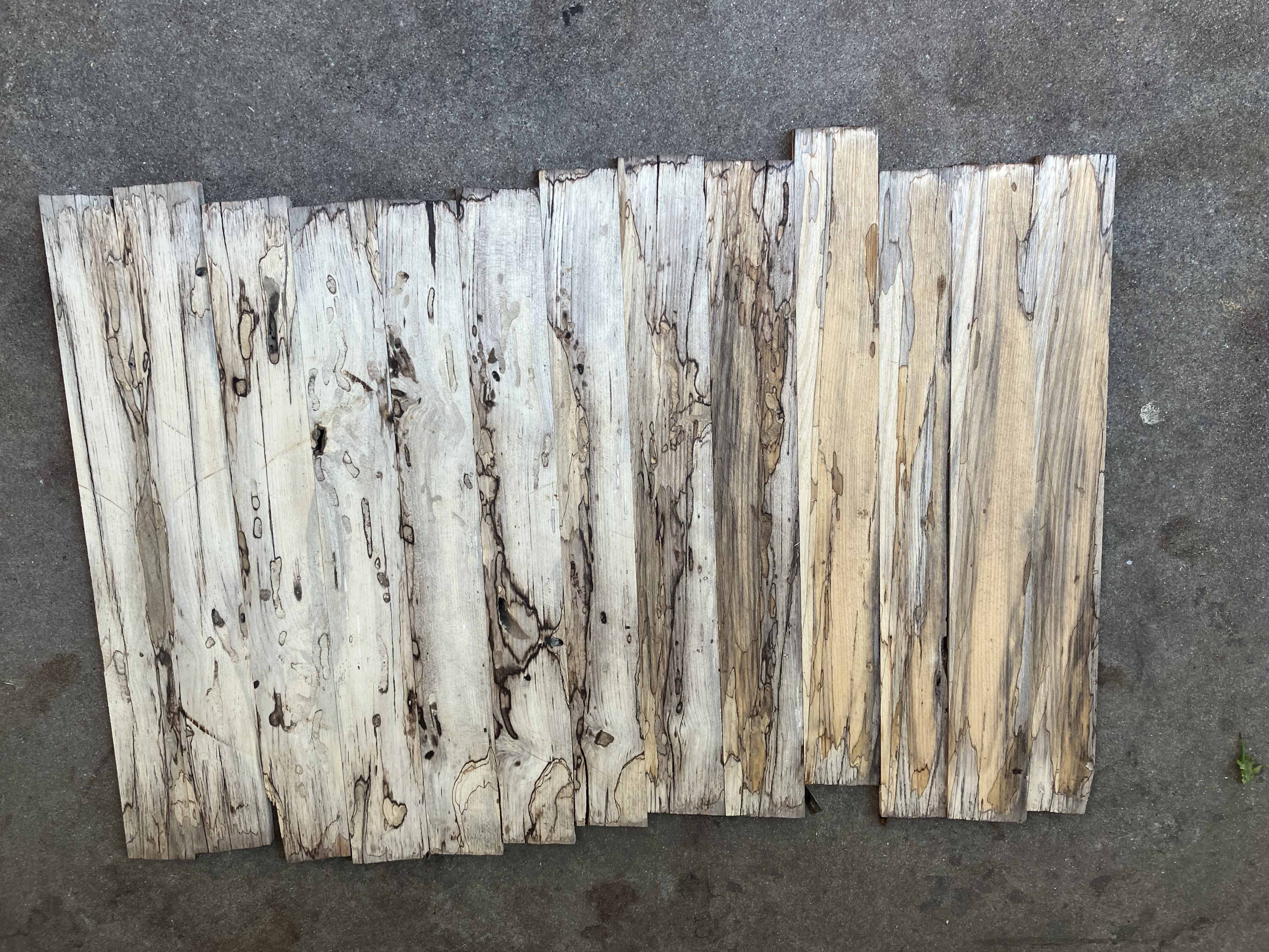 We cut the slab into slats of desired thickness. This is the best part, using dangerous power tools and seeing the spalted wood slats. Different every time.