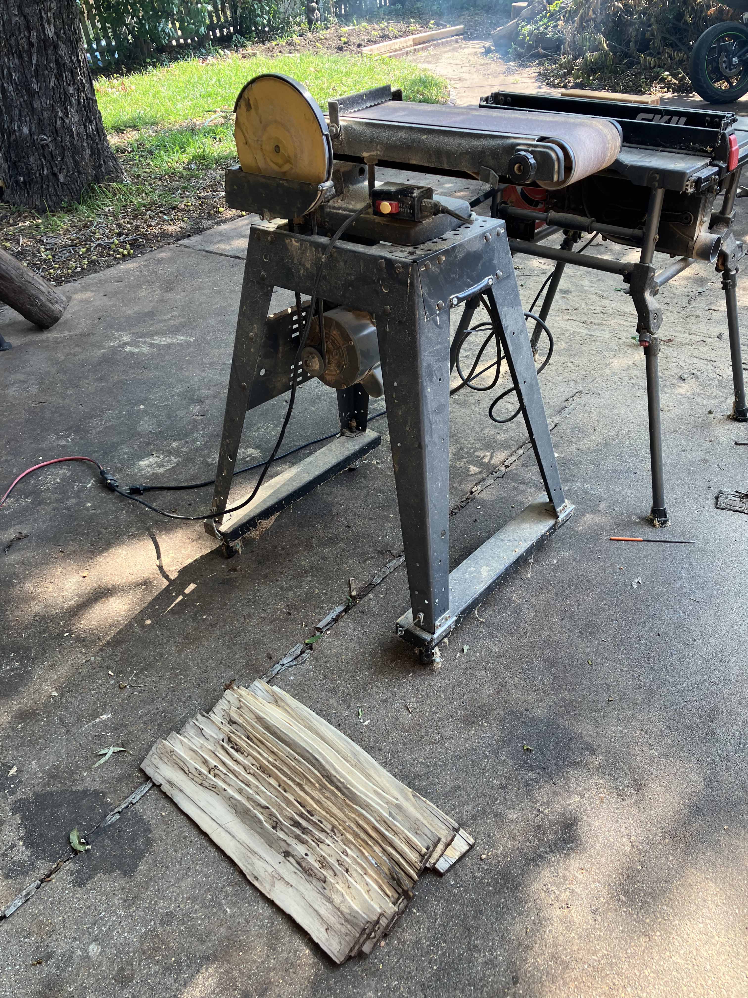 The edges of the slices are uneven from the original chainsaw cut. A sander is used to flatten one edge just a bit before it gets trimmed on the table saw.