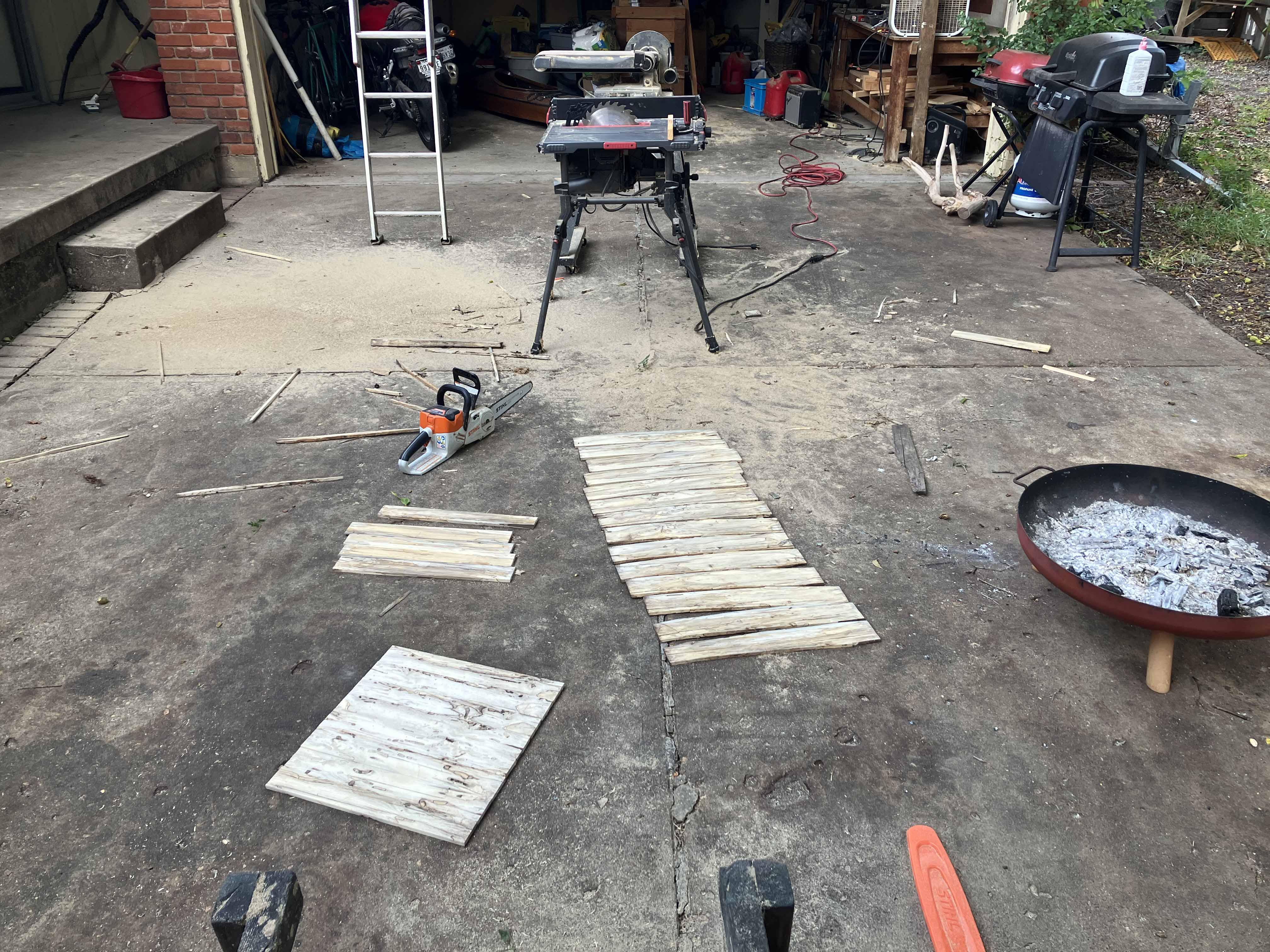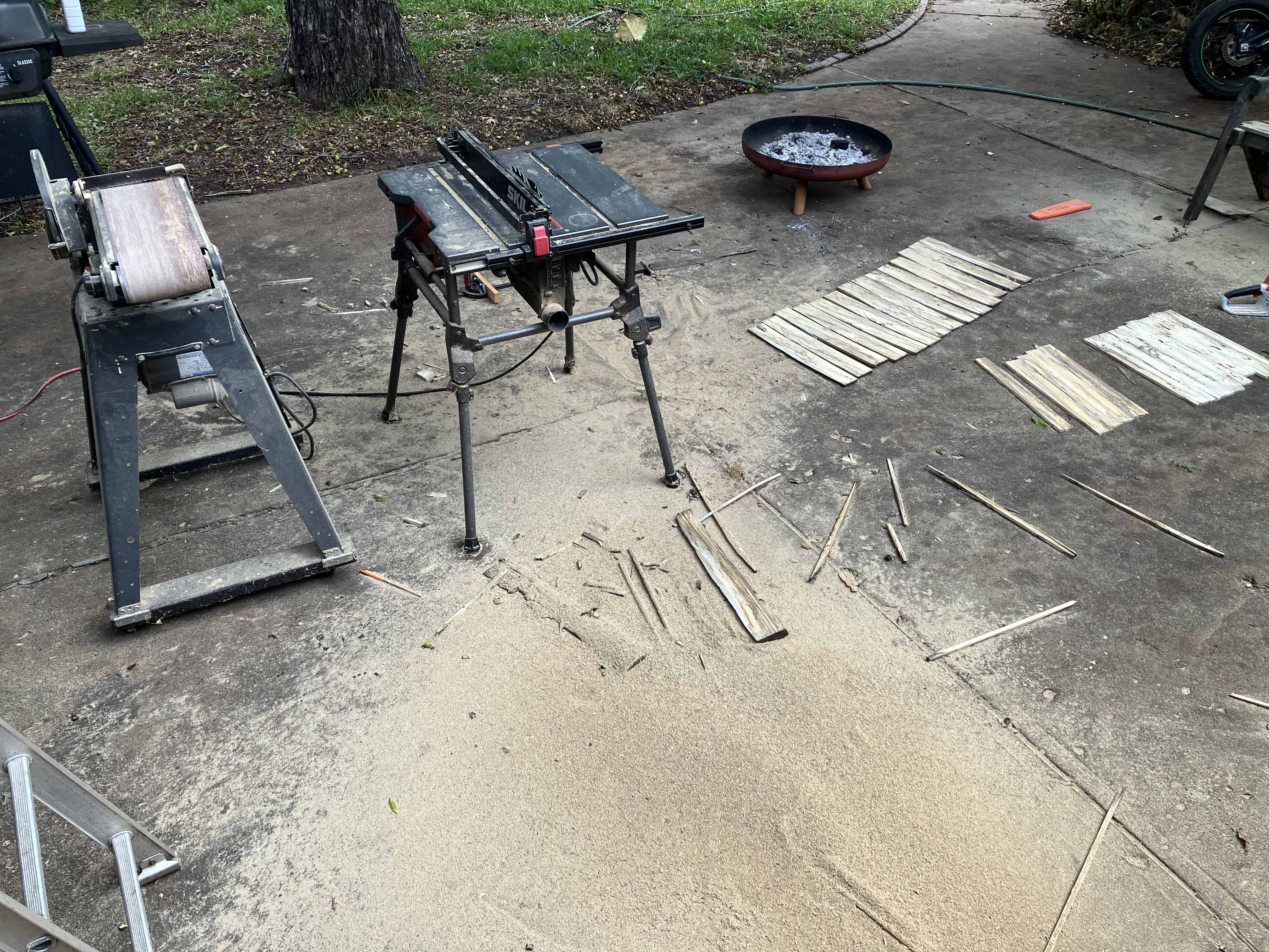 Now the slats can be put through the table saw, trimming both sides so that they fit together better. Usually takes several passes.