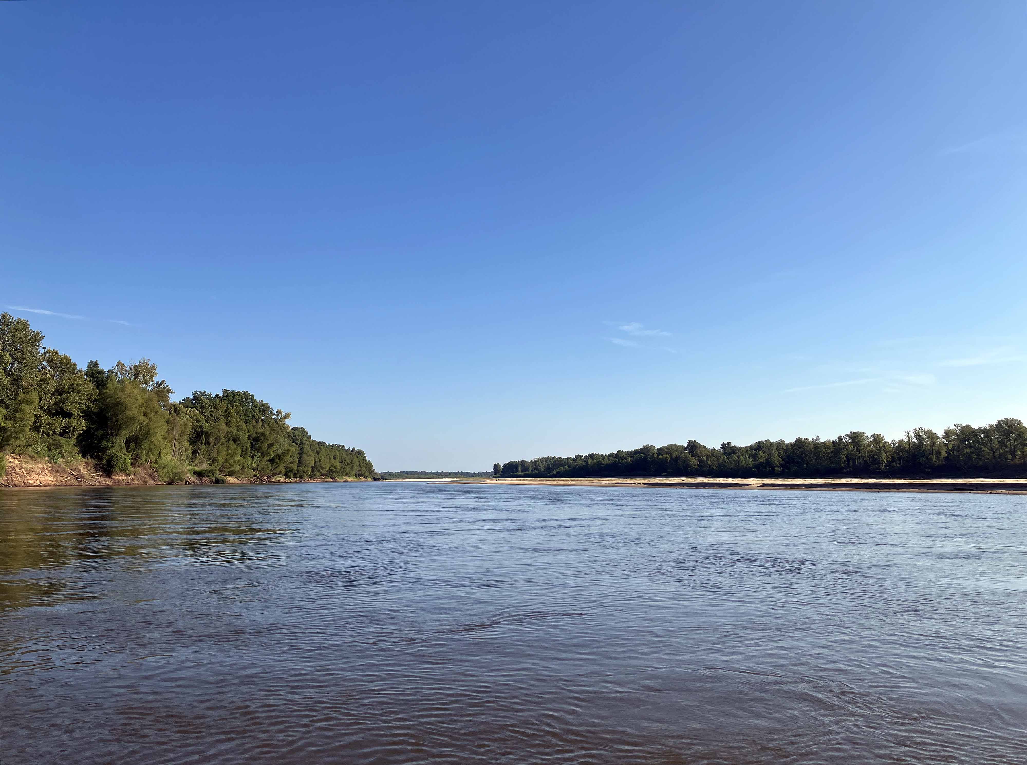 Kayak paddle route trail map on the Red River in Arkansas, south of Texarkana. The launch is along Highway 160 which itself doesn’t intersect I-49 but can be accessed by taking an I-49 exit to the north or south. The location of the ramp is at the confluence of the Sulphur and Red Rivers, and an earlier trip on the Sulphur reached this point and then went back upstream. But the confluence looked interesting so this time the route explores the Red River itself, going upstream in an out and back route, reaching a turnaround point at the Miller County Road 8 bridge. The river was low and there were lots of sandbars, but even with a flow of only 4500 cfs (Red River at Spring Bank) it was some work paddling upstream. At the launch I chatted with an Arkansas Game and Fish Officer who said the chance of seeing alligators was 100%. But unfortunately not for me on this trip. Later in the day the clouds and sky started to develop nicely. It is interesting to paddle these large rivers when they are not too crazy high, the scenery is open and you can see such a long ways. But they are flatwater paddles and involve a bit of grinding to make progress. A few powerboats were on the river; one mudboat got stuck in a shallow sandbar, so everybody got out to push.
