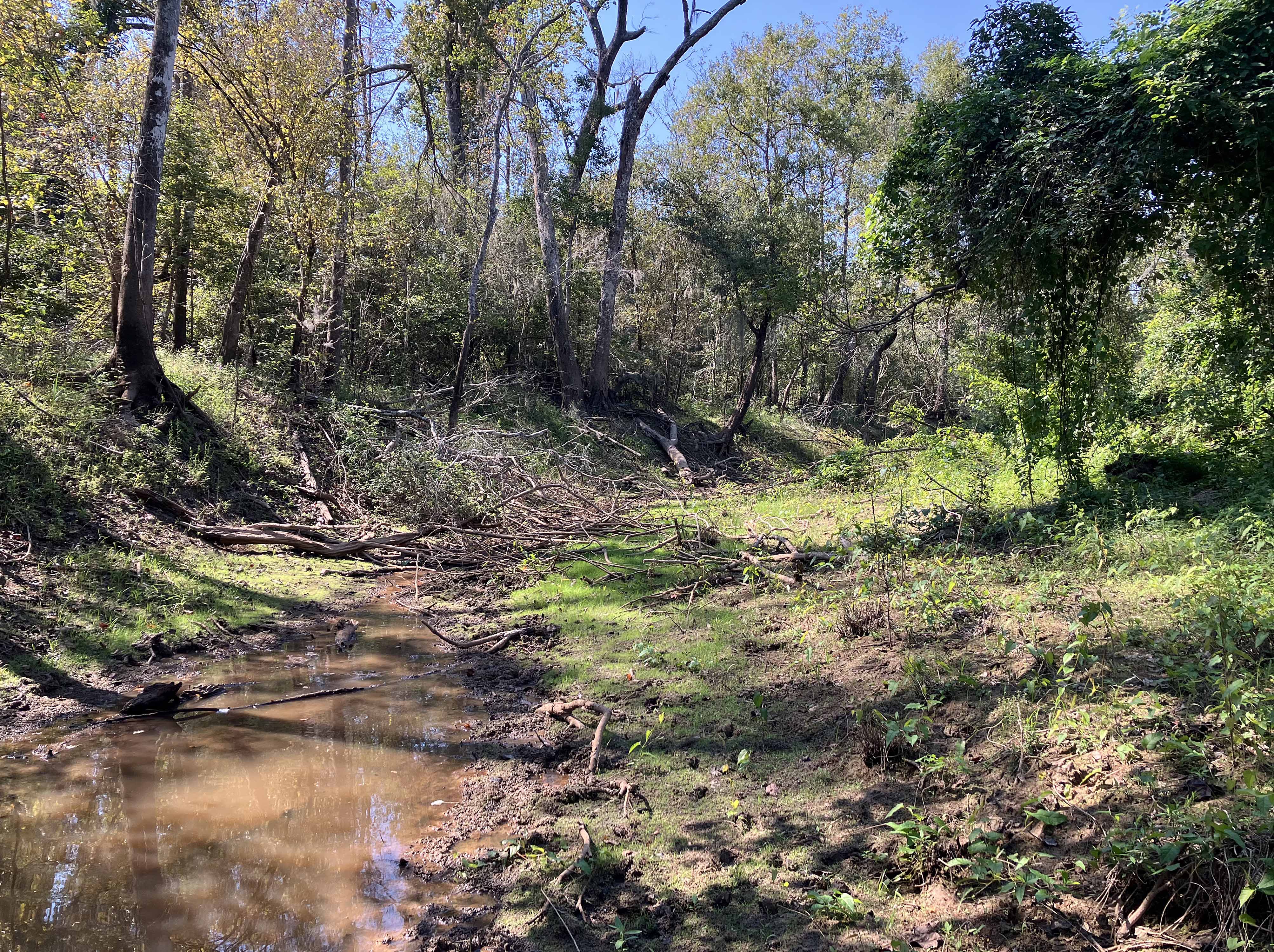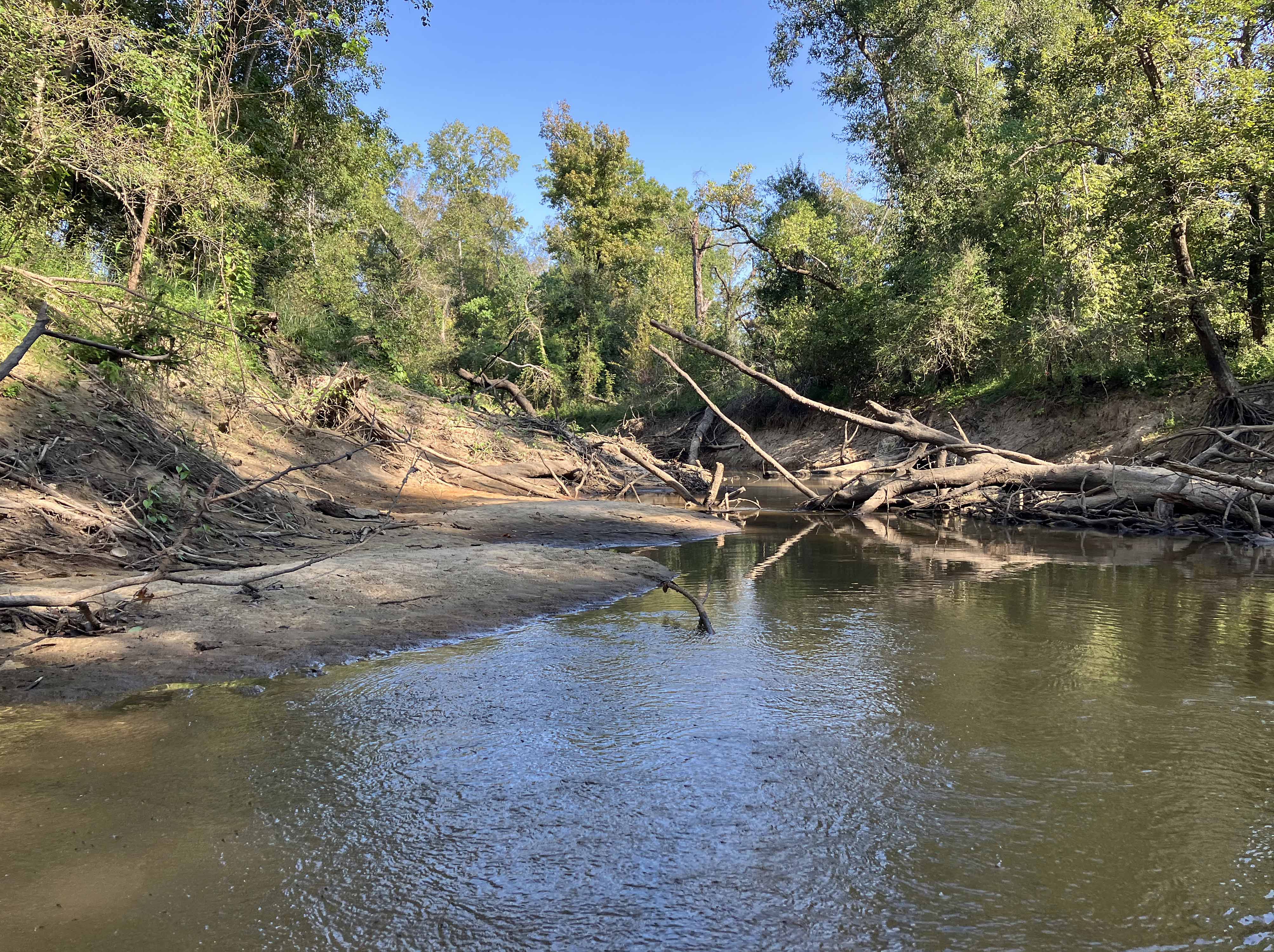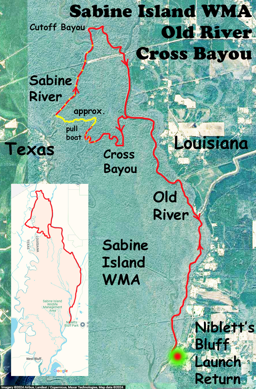 This paddle route was one I had hoped to do on an earlier trip to Sabine Island WMA but the current on Old River was a bit too fast at that time. This time however the flow in the Old River, which is on the east side of Sabine Island, was suitable and it was easy to paddle up north (Sabine at Ruliff about 1050 cfs). The plan was to then take Cross Bayou across the island and connect on the west side with the Sabine River. Google maps images showed this might involve a short portage at the end because the channels going across don’t connect cleanly, so that was expected. Which was fine. But, turns out the water in the interior channels of the island was really low, and while I could take Cross Bayou a ways in, things quickly began to dry up, as the pictures below will show. What to do…turn around or keep going? It’s pretty hard to turn around, especially when you think of going over all the same log falls, the same portages, a second time. So, forward. This turned out to be close to a mile boat drag through heavy brush, vines, woods, fallen trees, and mud (shown by the yellow and dotted yellow lines in the map). But I figured the outcome is certain–hit the Sabine River and just paddle up, around, and back down to Nibletts. Turns out the Sabine was also a bit low, with shallow sand bars where the boat needed to be pulled up through. And so I was happy to reach the northern junction where the Sabine and Old RIver split, because from that point it’s an easy paddle back down to Niblett’s Bluff! All’s well that ends well, an interesting day.