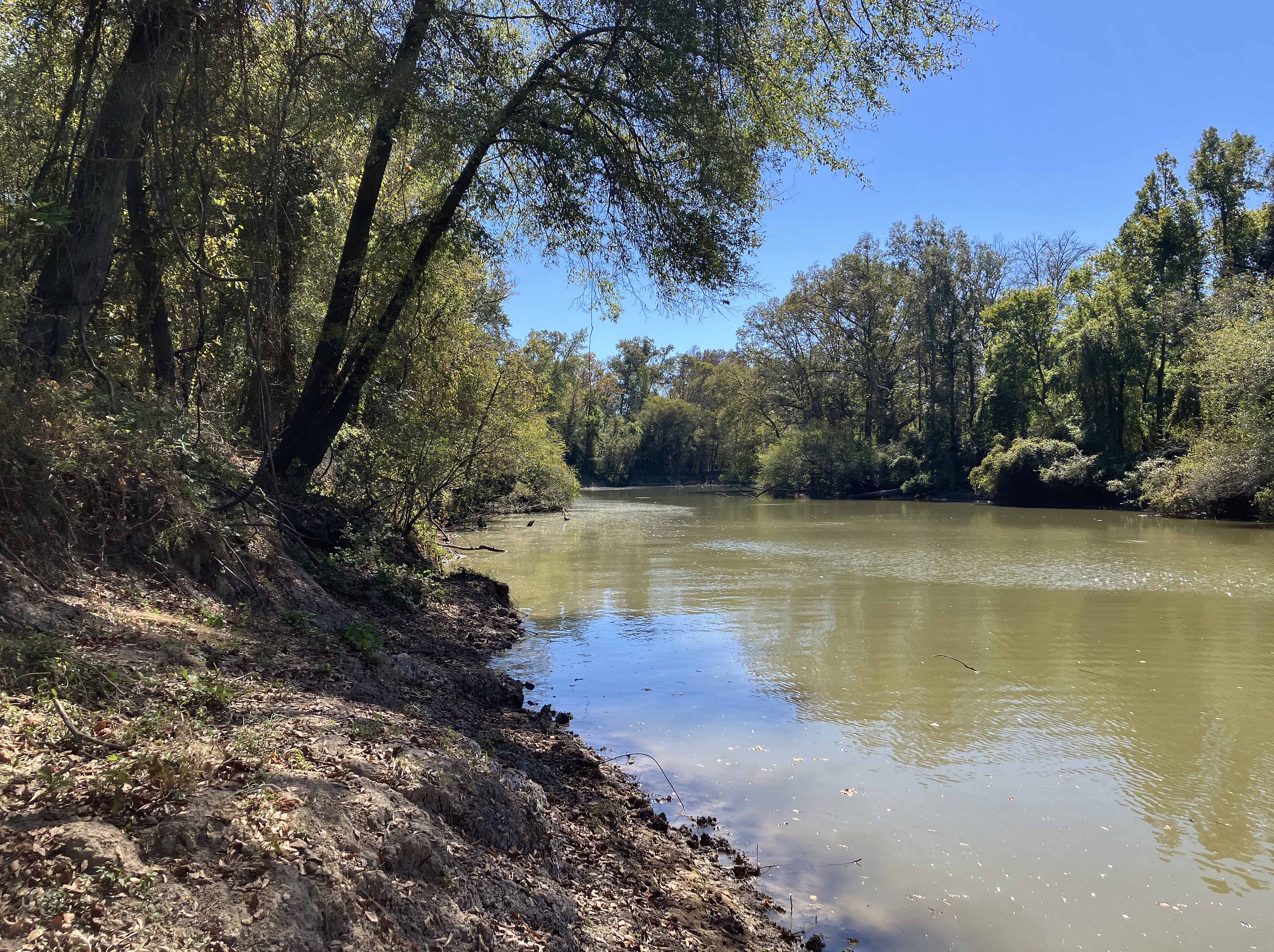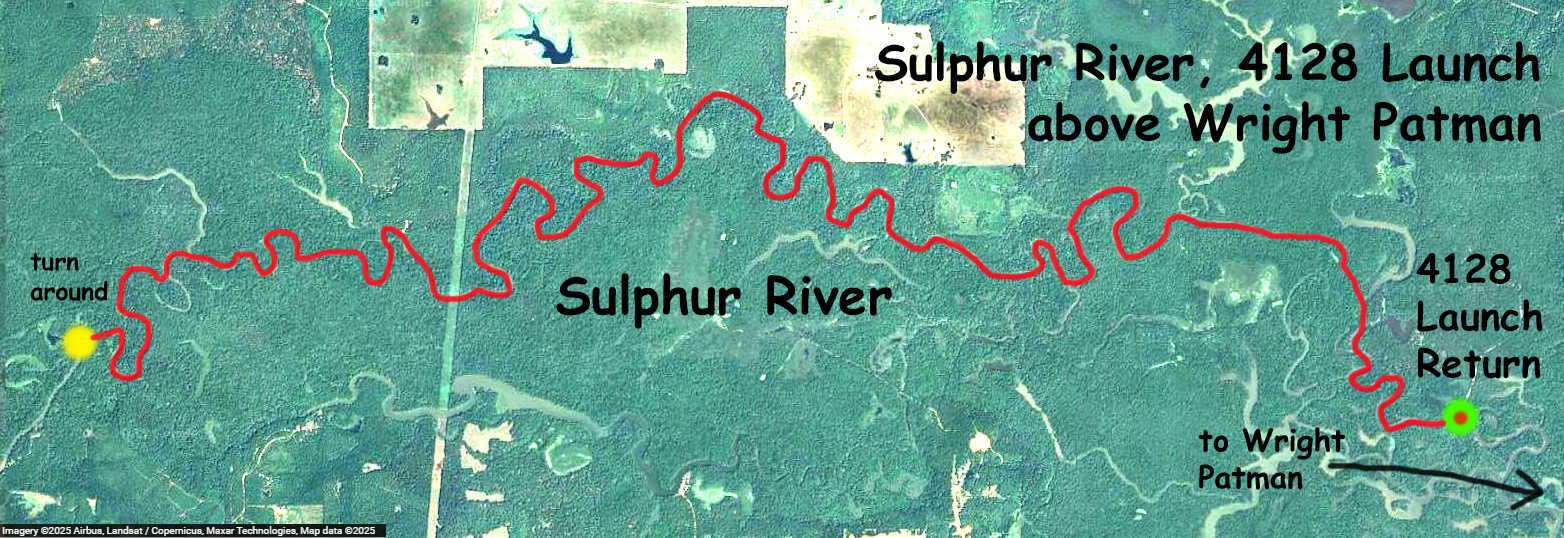 Kayak paddle route trail map on the Sulphur River above Wright Patman Lake. The launch is at the end of a four mile dirt road 4128 that comes off of Highway 67 southwest of Texarkana. I had wanted to find a public launch somewhere in between this one and the launch at Highway 67, its a long stretch, about 30-35 miles, between the two, but haven’t been successful. So I launched here at 4128 and went upstream as far as I could for an out and back of about 28 miles round trip. Early morning was beautiful, and the weather stayed cool all day. No current, the Sulphur River at I-30 was about 15 cfs, and almost no wind either. Some otters, see picture, and tons of gar. Nice paddle.