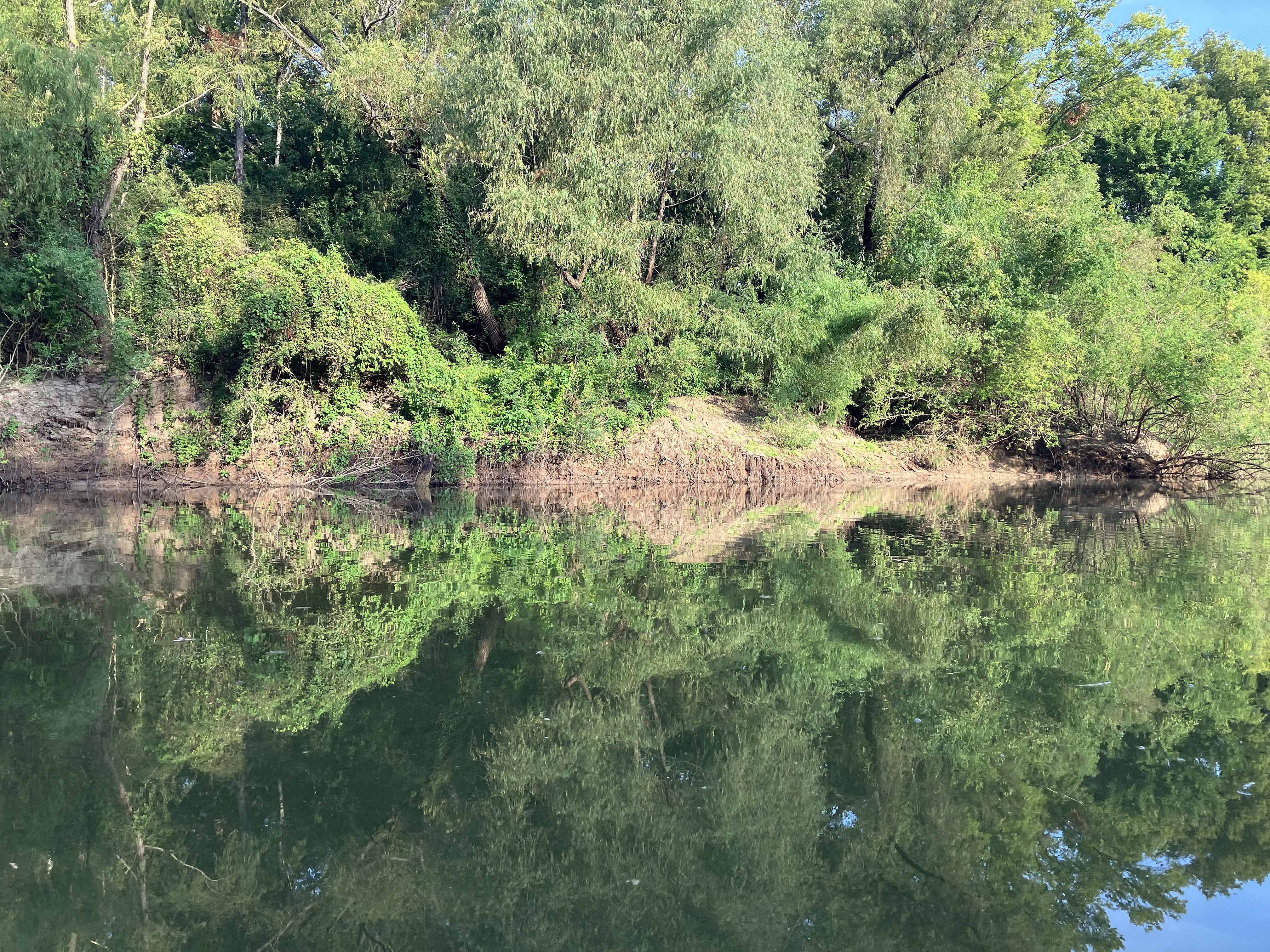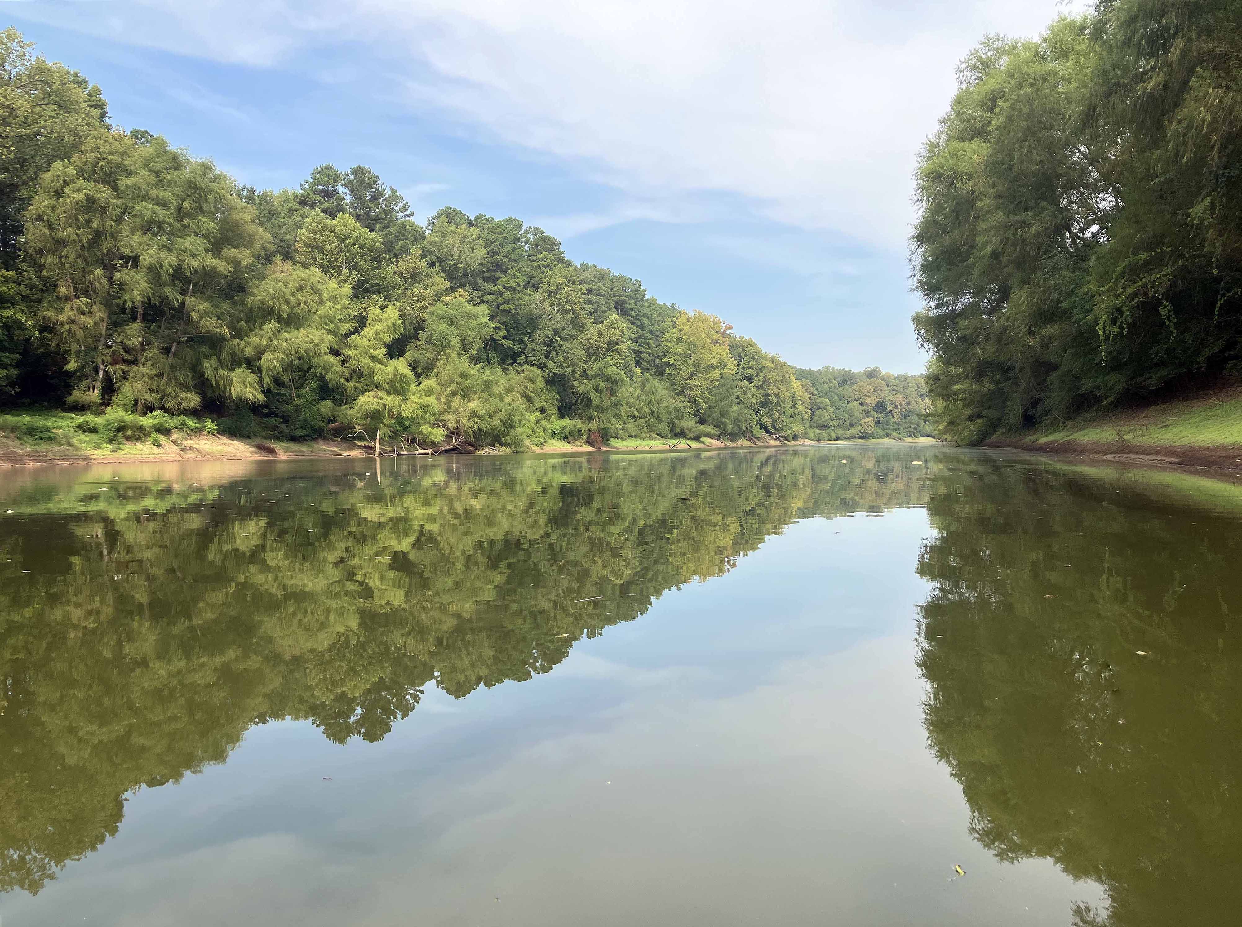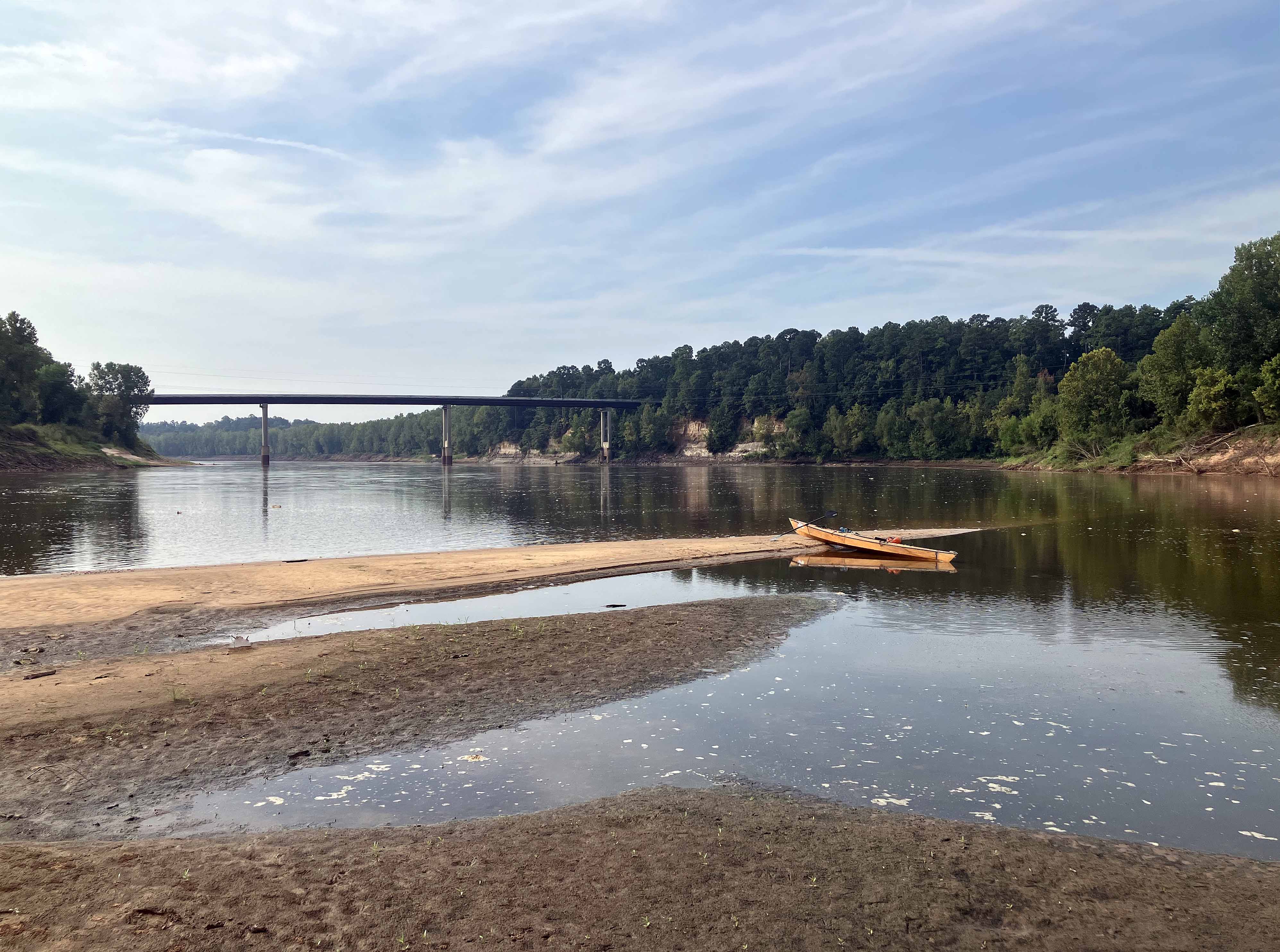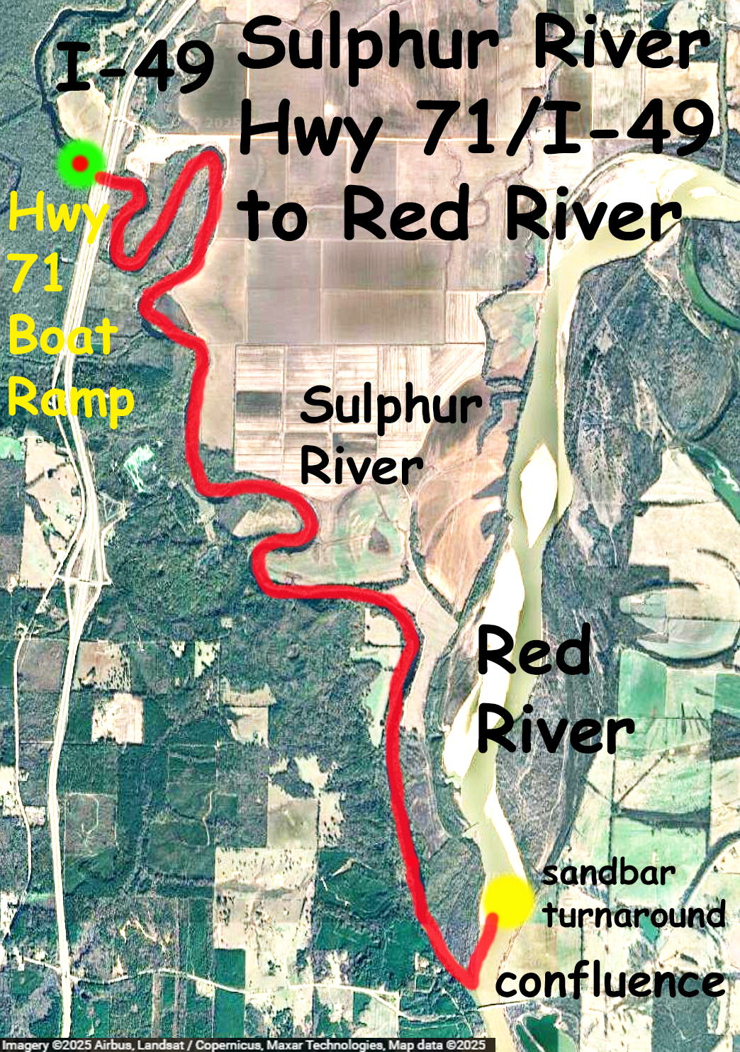 Kayak route trail map on the Sulphur River starting at the Highway 71 Public Launch just south of Texarkana and off of I-49. The route is a down and back that turns around at the confluence of the Red and Sulphur Rivers, near the Hwy 160 bridge. On the day of this trip there was no current on the Sulphur River so it was a smooth, scenic, flatwater paddle in both directions (the Sulphur River nr Texarkana gage read 7.5). The river is fairly wide and would be less fun if it had been windy, but late summer things are pretty still. And there were no log jams like in some of the upper sections. This route is the last leg of a set of Sulphur River trips starting from the point where the river leaves Wright Patman Lake and ending at the Red. There were a few alligators in the water but no pictures this time. The confluence of the Red and Sulphur Rivers is interesting. The Red was only flowing at about 4500 cfs but even at that rate its size is still impressive, it has a ‘crossing the Red’ 1870s cowboy cattle-drive kind of feel. Great paddle.