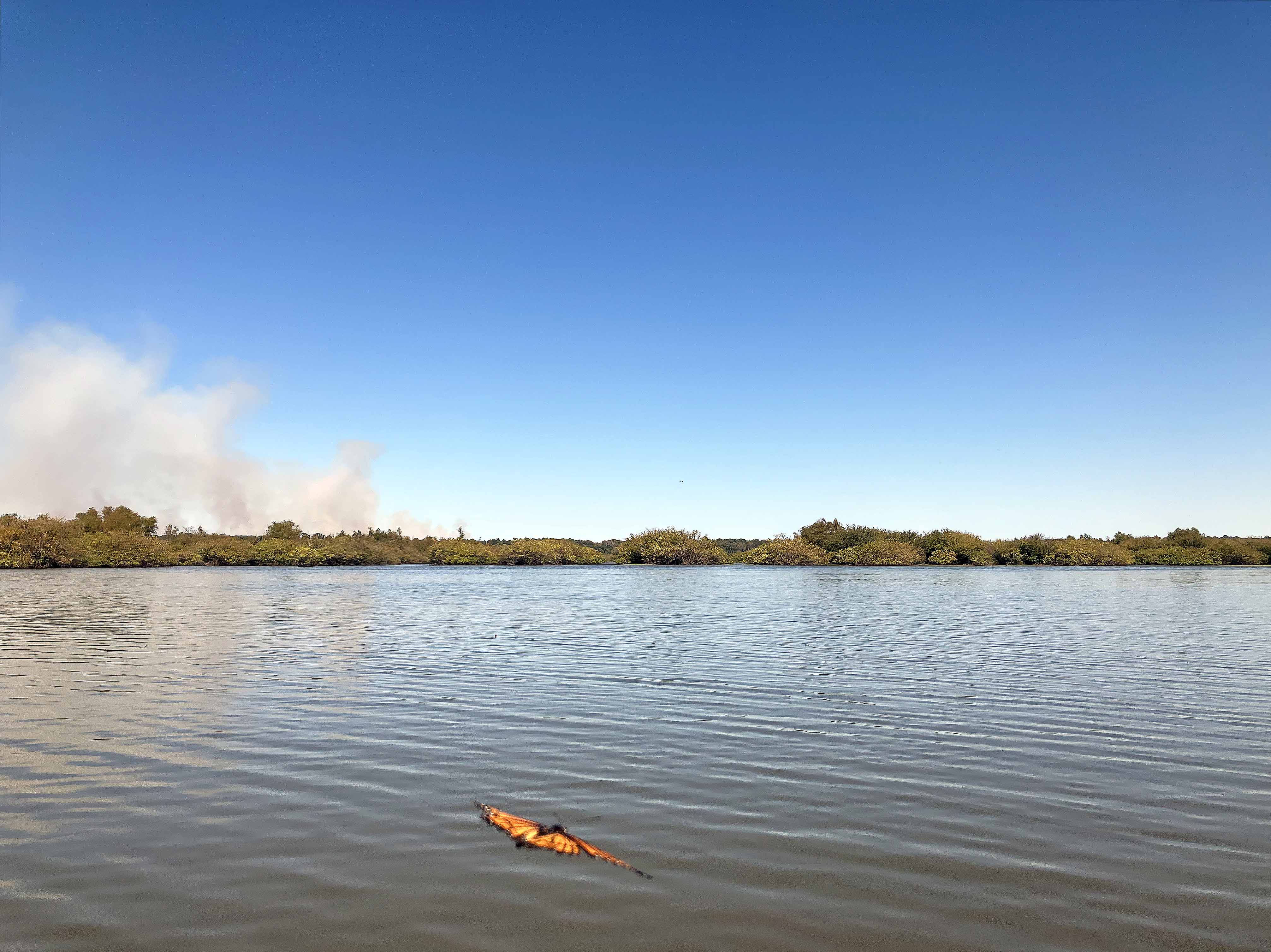 Above: A wildfire in the distance, and a monarch butterfly that flew through as the shot was taken.