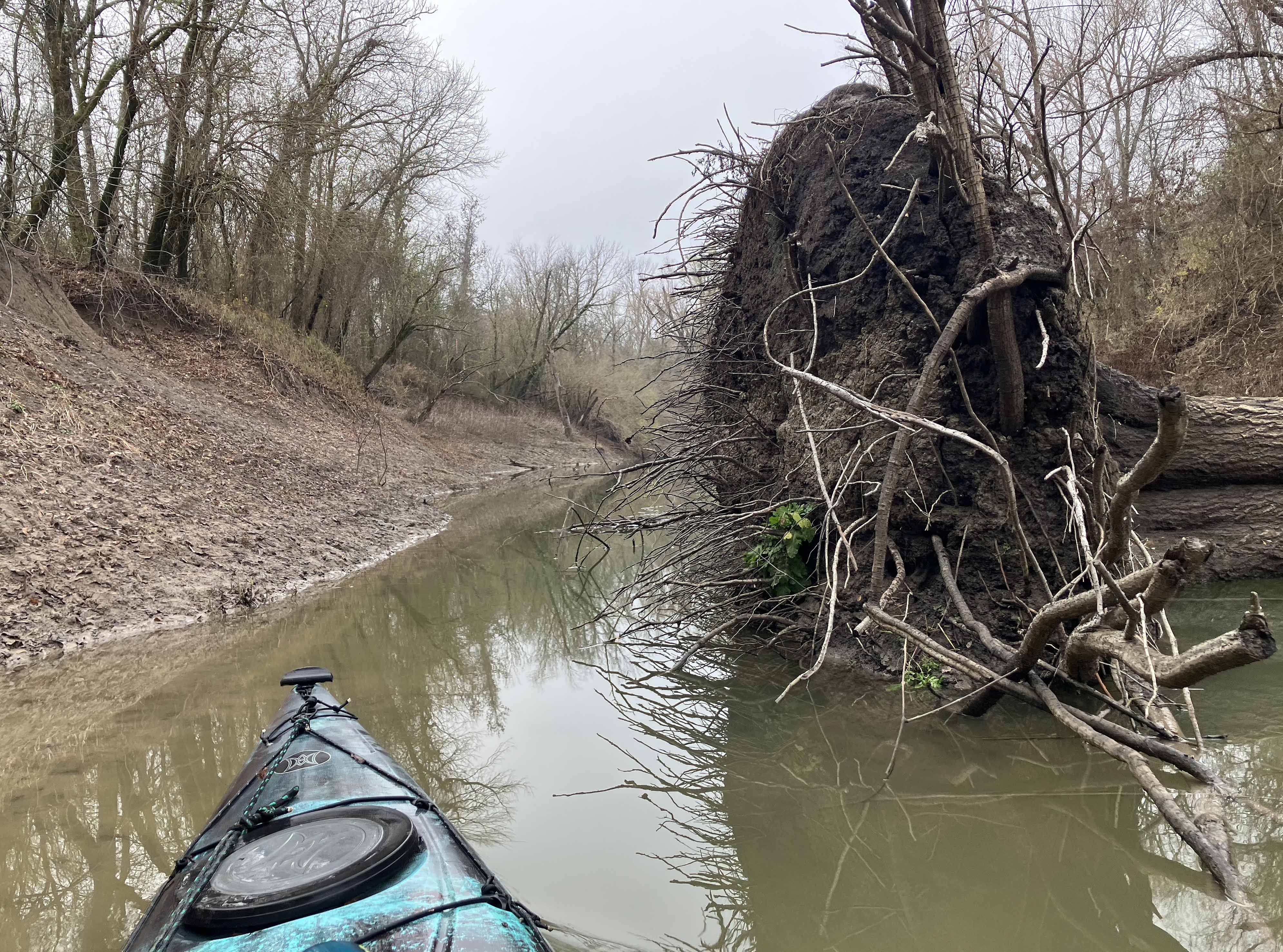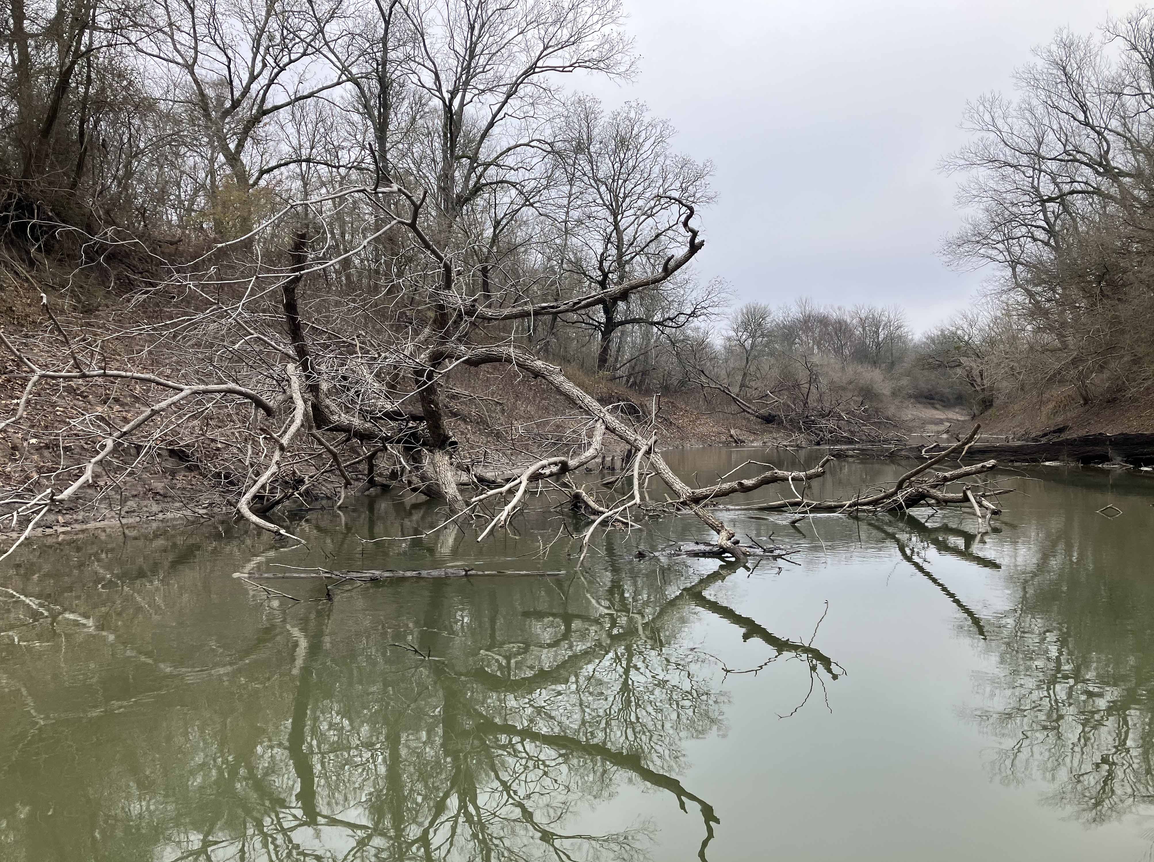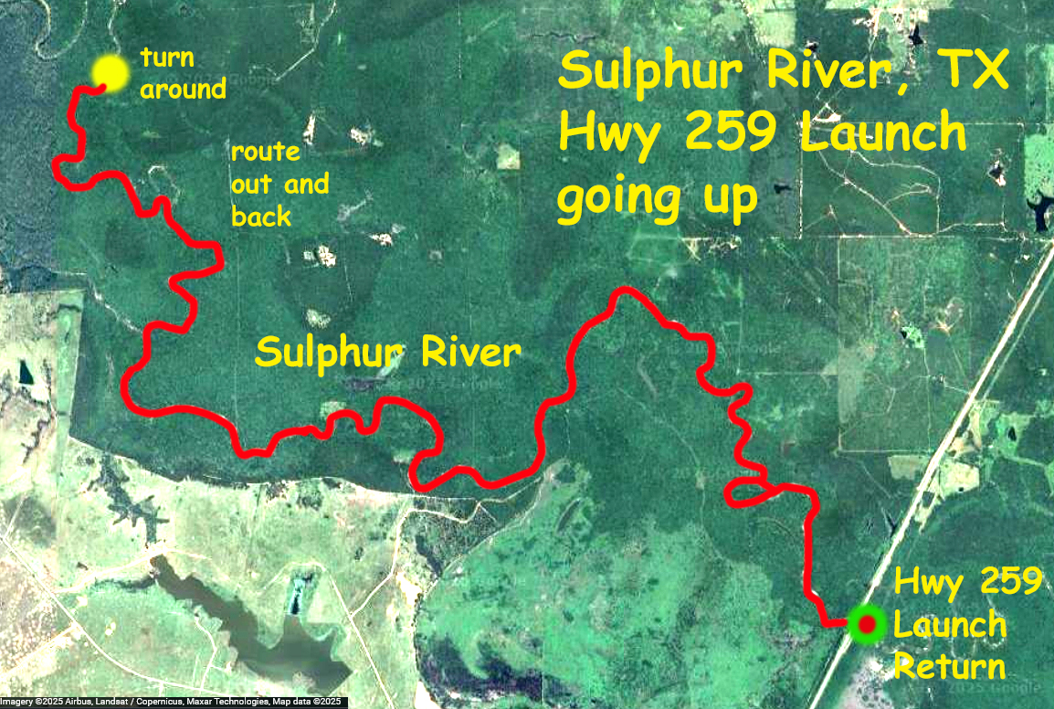 Kayak paddle trail route map on the Sulphur RIver, TX, starting at the Highway 259 Launch. This is a second trip from this launch, this time going upstream. The USGS flow rate of the Sulphur River at I-30 was about 25 cfs, much better than the earlier trip going downstream when the river was at 1 cfs and which was pretty rough log jam-wise. And it had recently flooded so maybe that cleared stuff out as well. The river was wide most places, mild current, easy to paddle, with only a few get out of the boat portages. It should be possible to paddle further upstream but I haven’t found good put-in spots. Saw three beavers and some deer. Winter can be a great time to paddle, stark, silent, crisp, the pictures show the feel of it. Three hours up to a turnaround point, two and a half back. Game warden was waiting, blocking the exit from ramp, verified I wasn’t hunting (there is a nearby White Oak Creek WMA that people camp/poach on), verified I had a life jacket, then told me some amusing stories, interesting fellow.