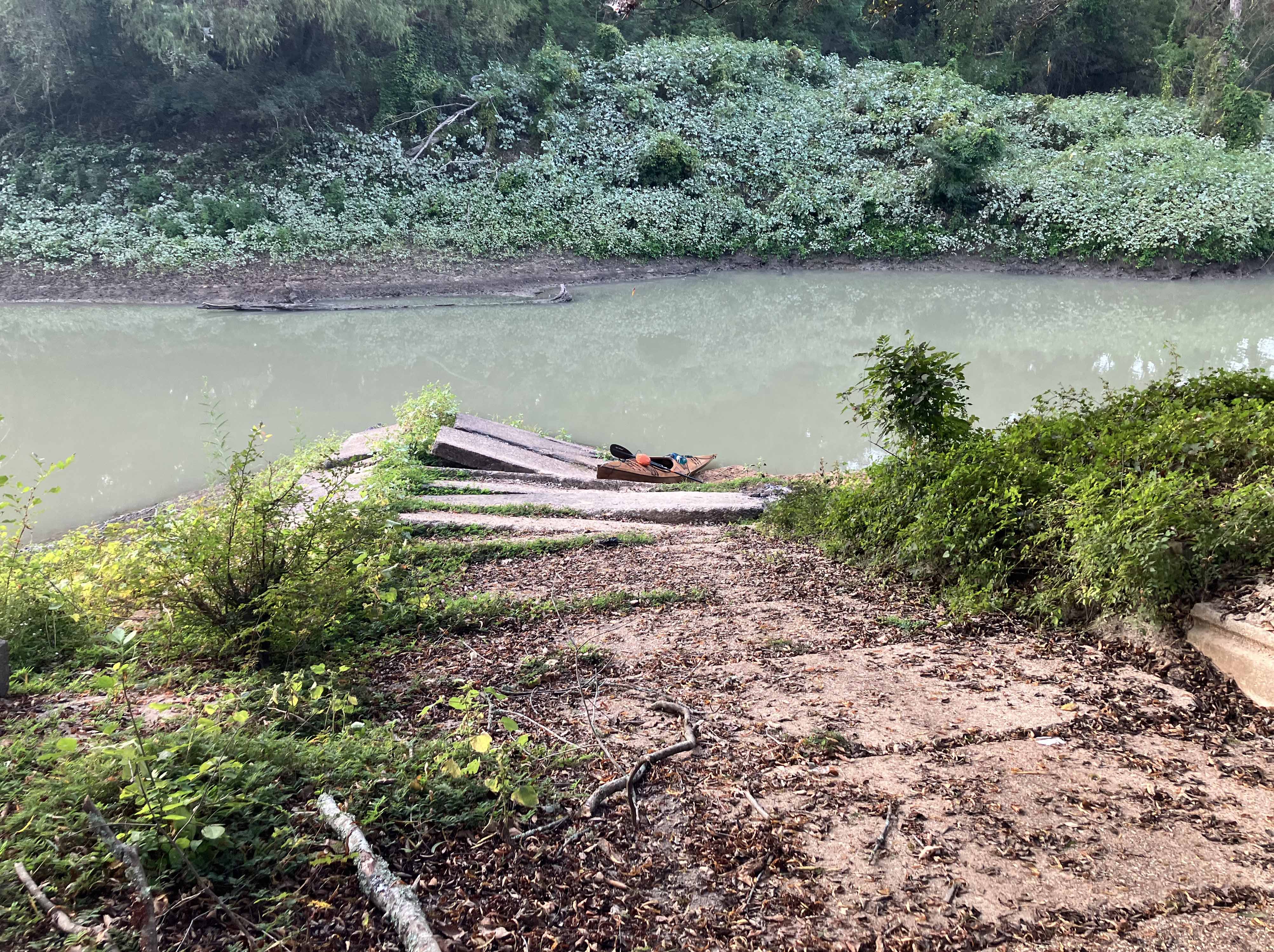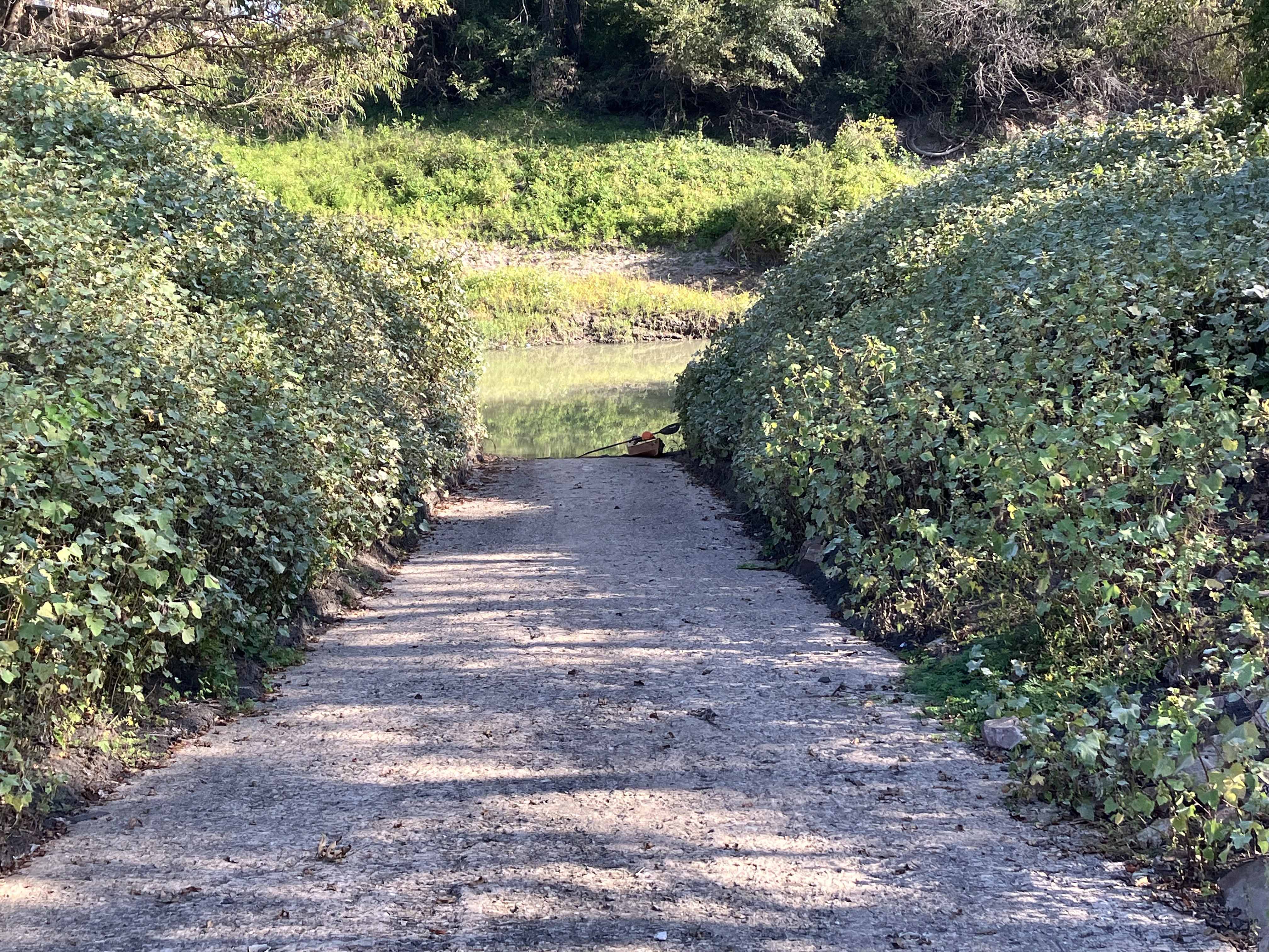 Above: The Highway 259 launch. The sides are lined with cockleburs, very sticky. Nobody here, after all what kind of idiot launches when the flow rate is only 1 cfs …. oh.