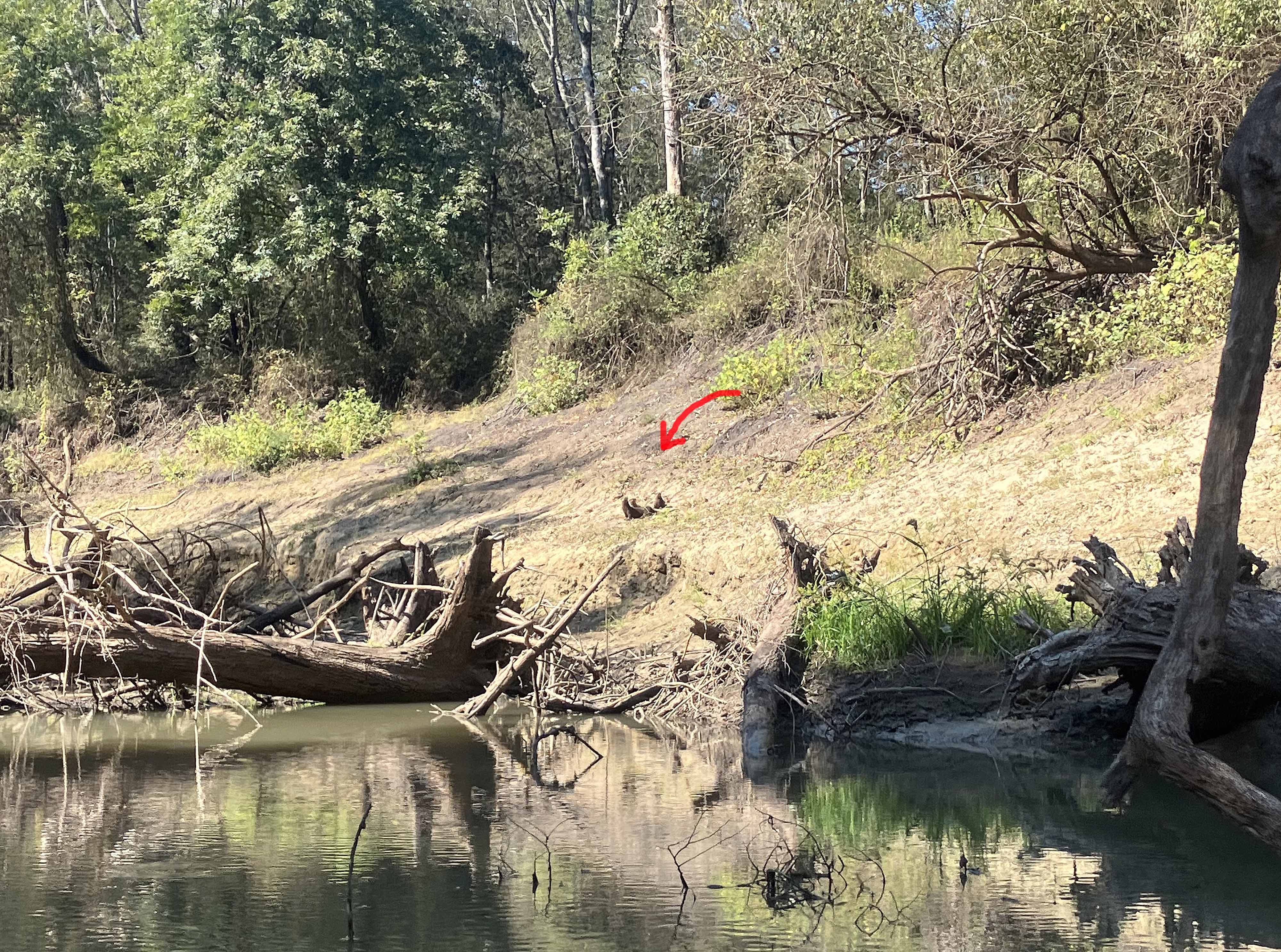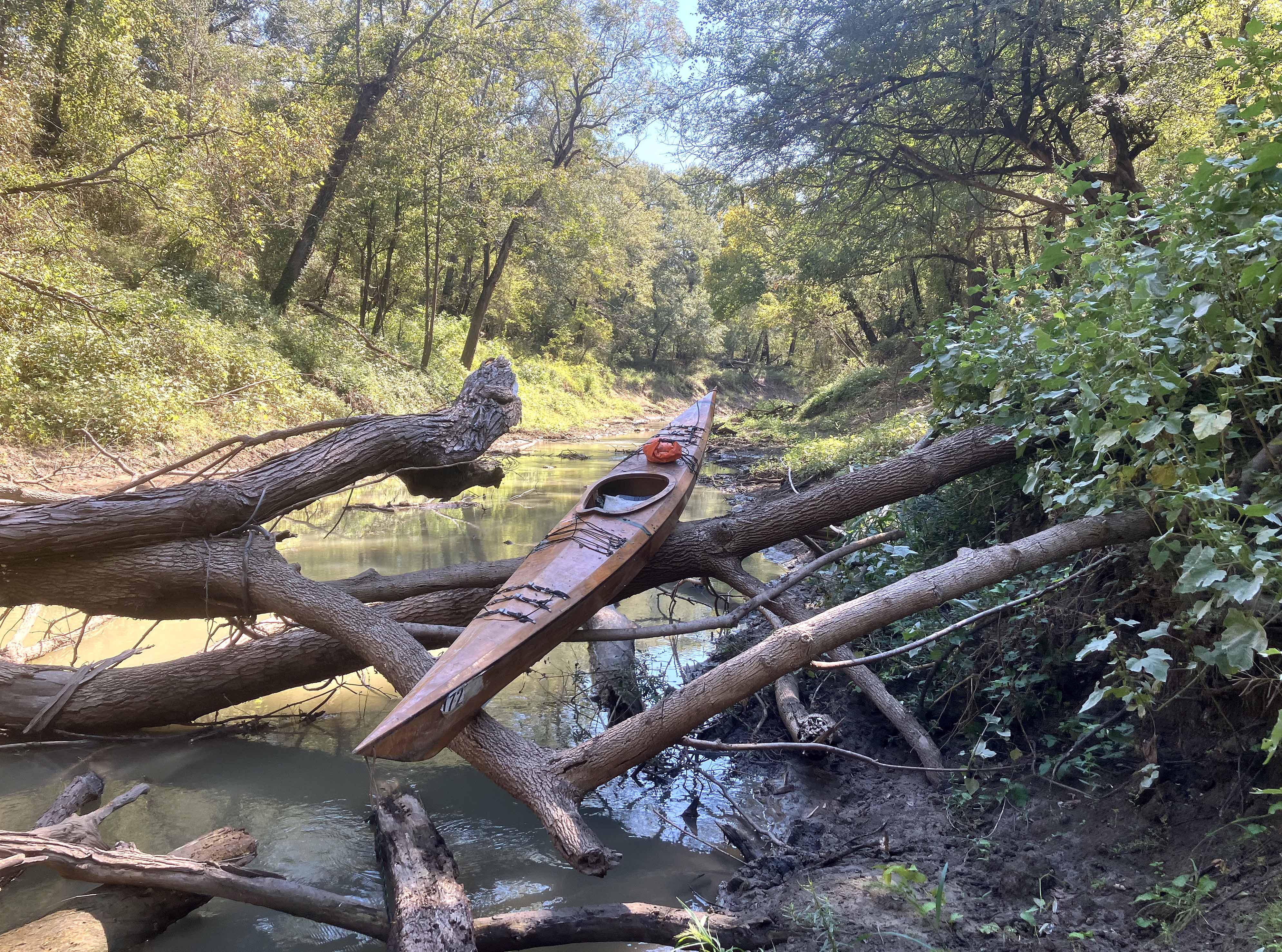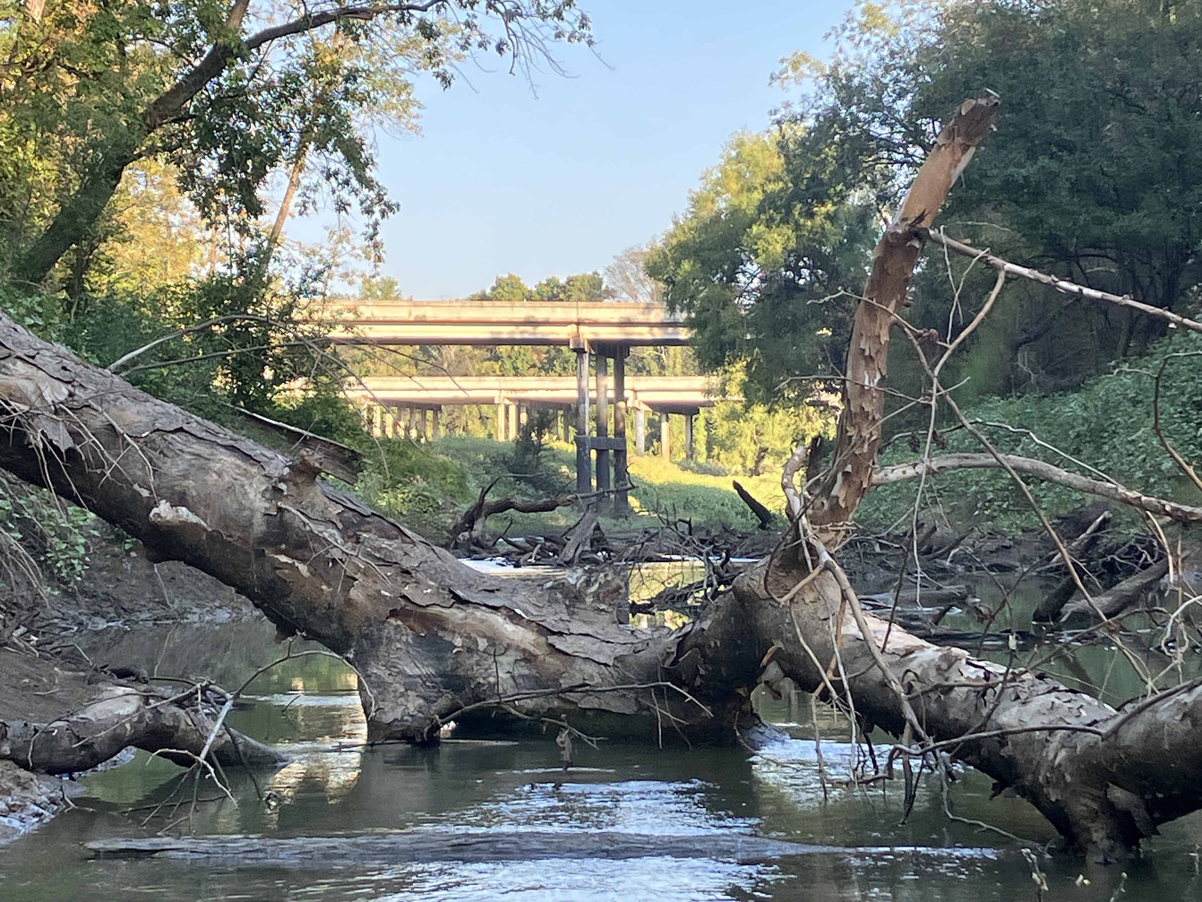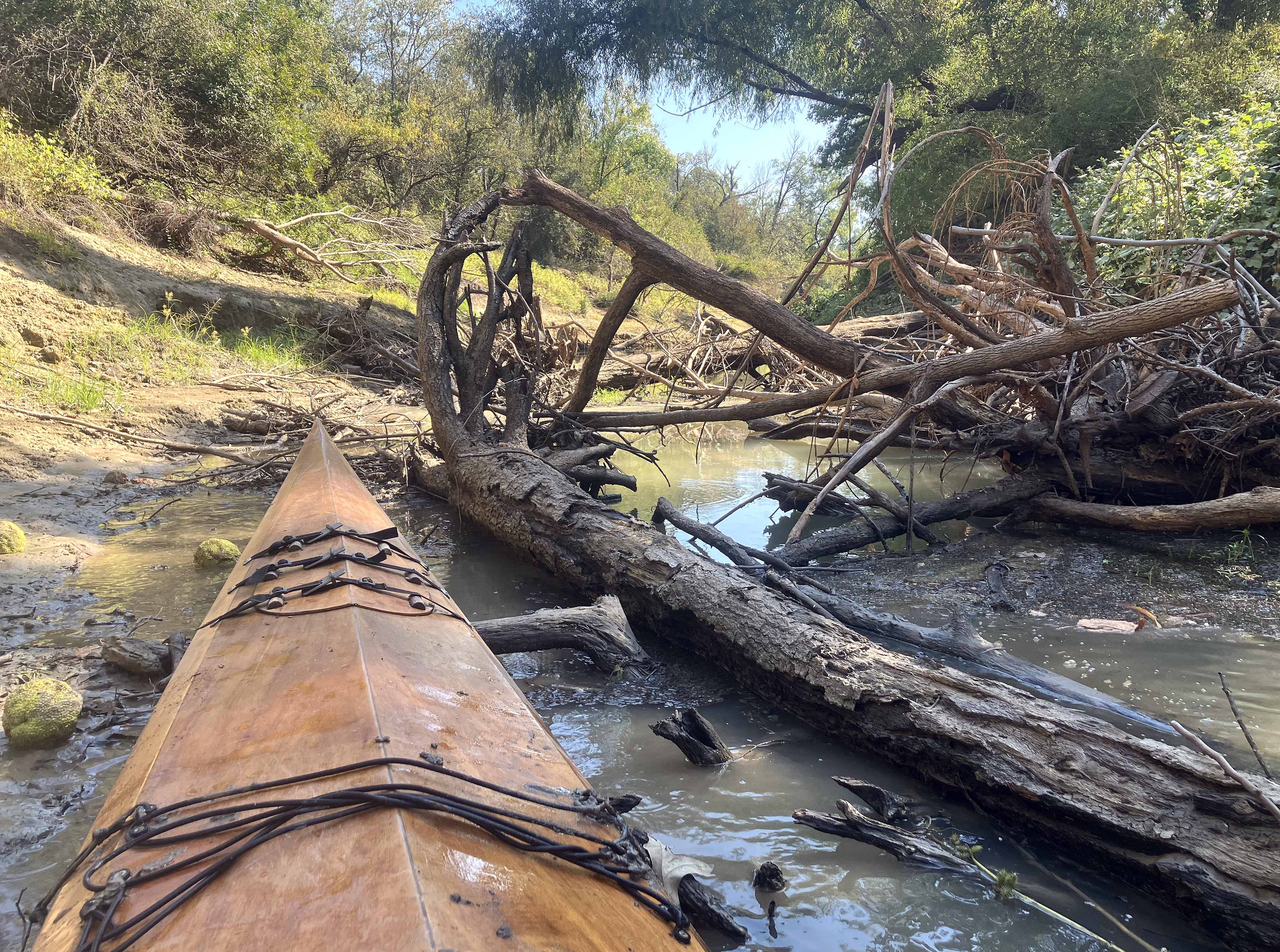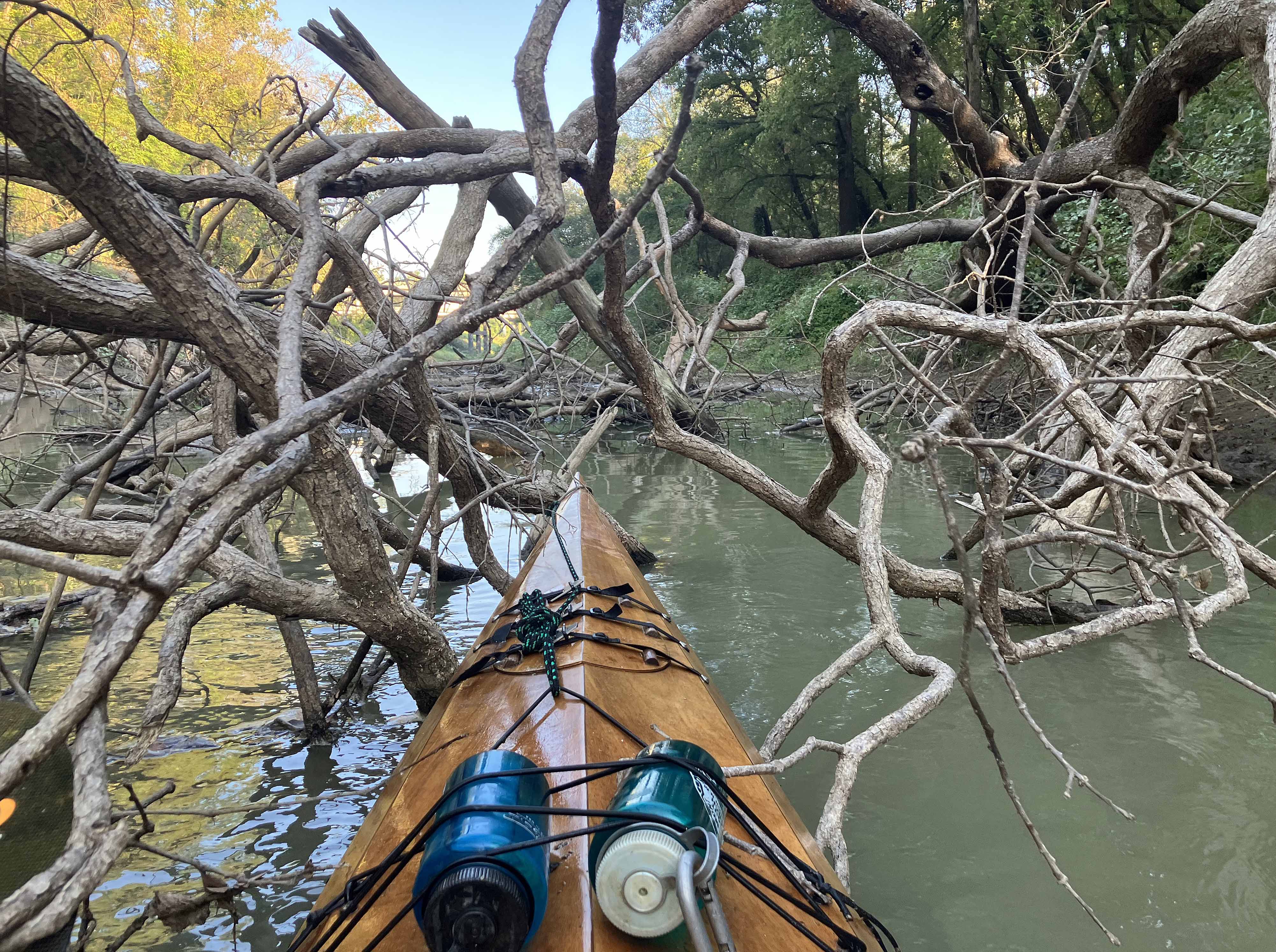 Out and back kayak paddle route trail map on the Sulphur River in the White Oak Creek WMA area, Texas. There are two launches near Interstate 30, the one to the east is in the WMA down a little side road off of 4507, the one to the west is along Highway 259. I first launched in the WMA and went up to the I-30 bridge but with all the log fall portages I was kind of sick of it. When I got back I decided I wasn’t kind of sick of it. So I drove over and launched a second time at Hwy 259 and paddled downstream over all the log fall portages to a point near I-30 where I decided I was kind of sick of it. The flow on the Sulphur River at the I-30 gage was less than 1 cfs, very shallow, a lot of log jams, and a lot of mud. These sections could probably be done more easily if the river was a foot or two higher but you get what you get. And there was lots to see, deer, fish, beavers, pigs, otters, so good workout and no complaints.