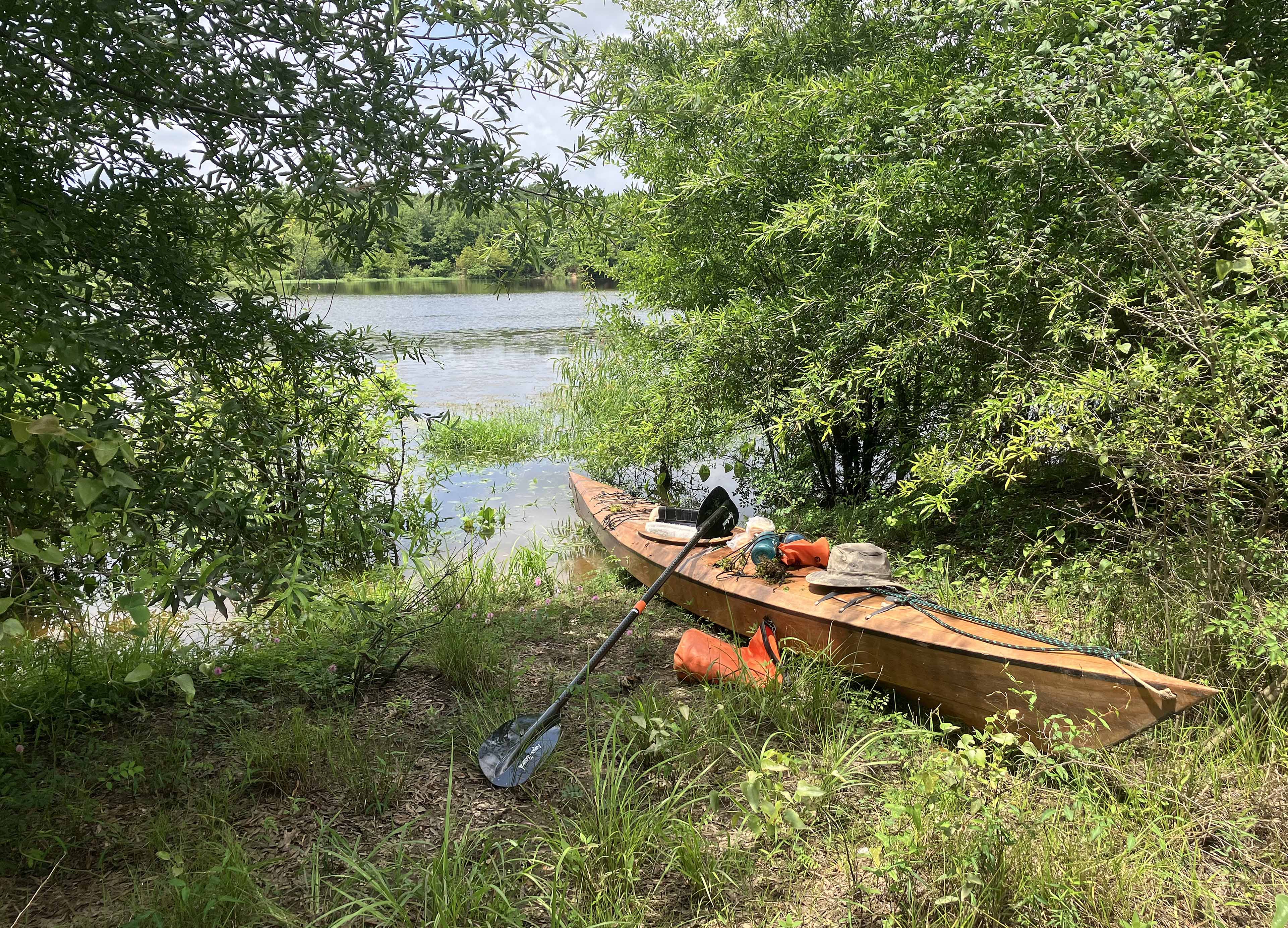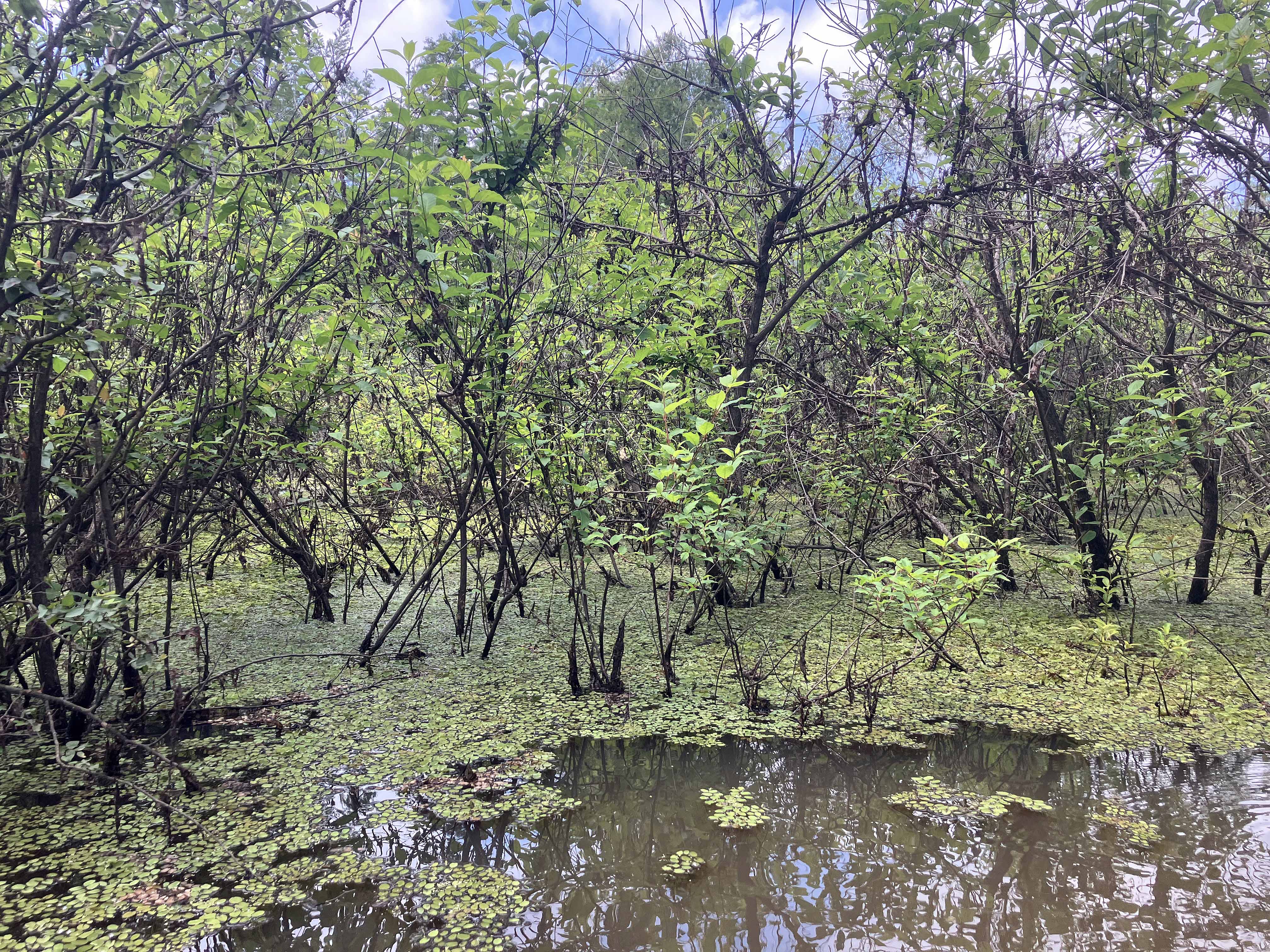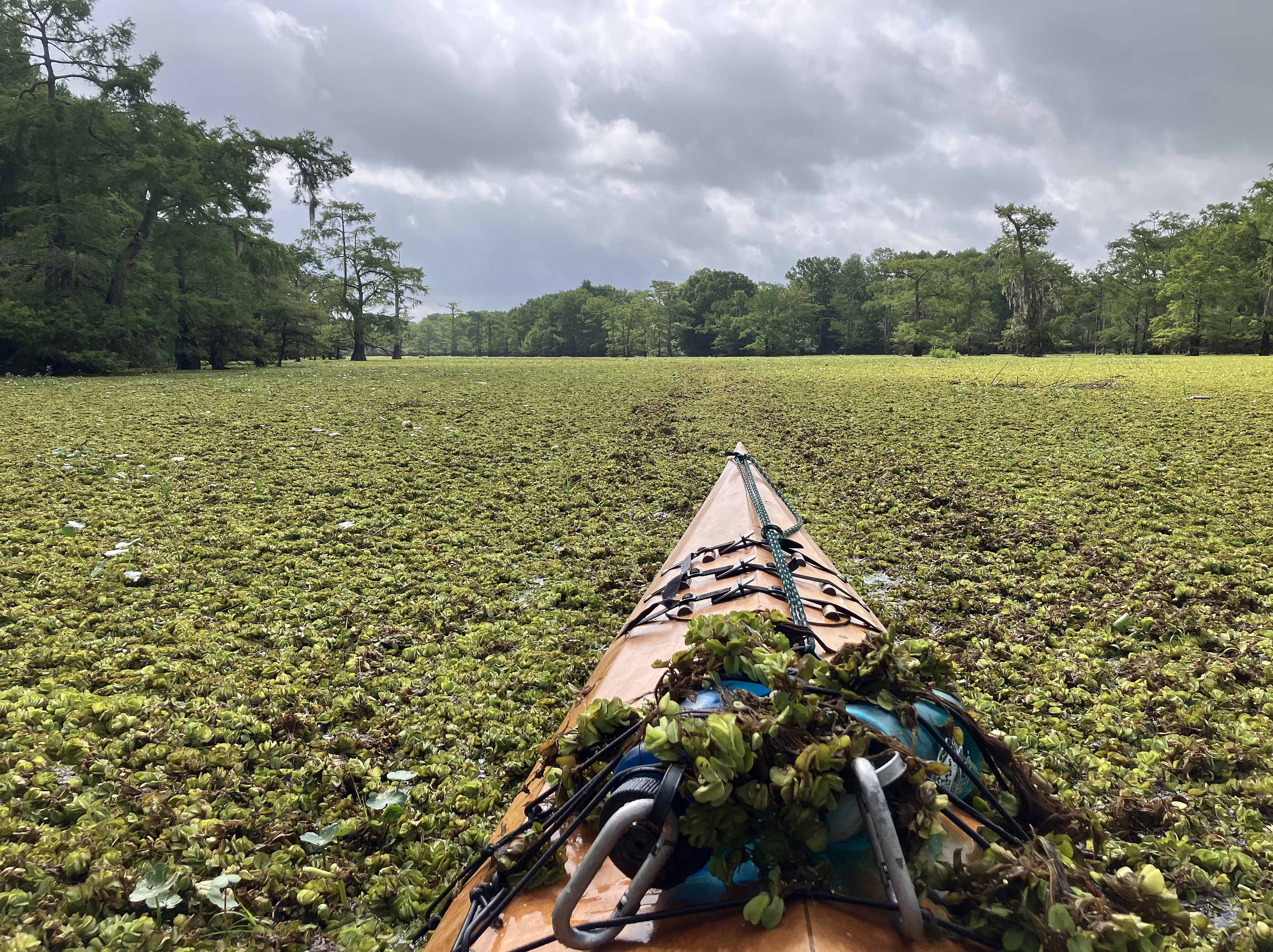 Above: It was so hard to get through the salvinia this far, but even then I couldn’t see open water ahead so…turnaround. It took about 70 paddle strokes to turn the boat 180 degrees to go back. The surface was so thick the egrets and other birds were walking on it. This stuff wrecks boating.