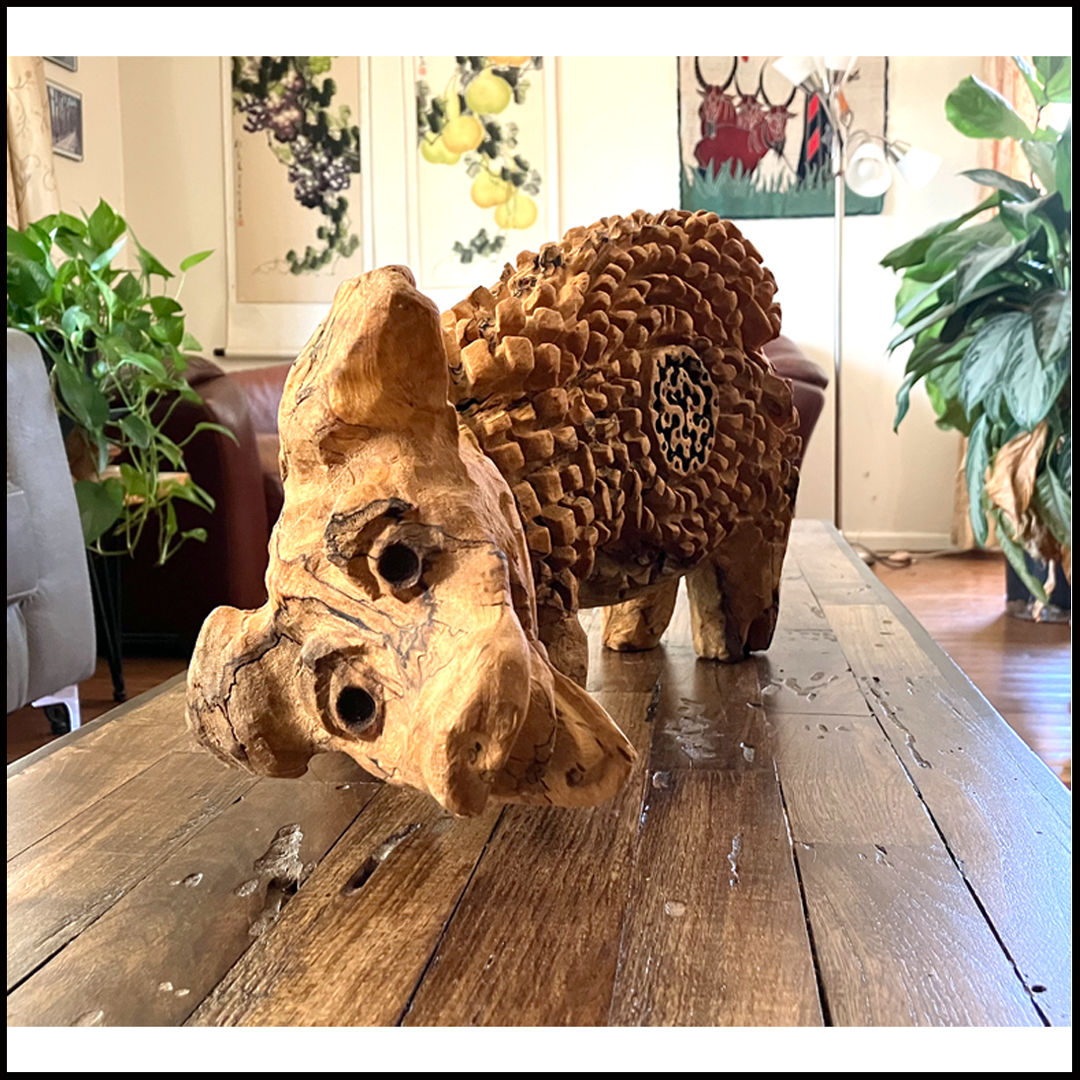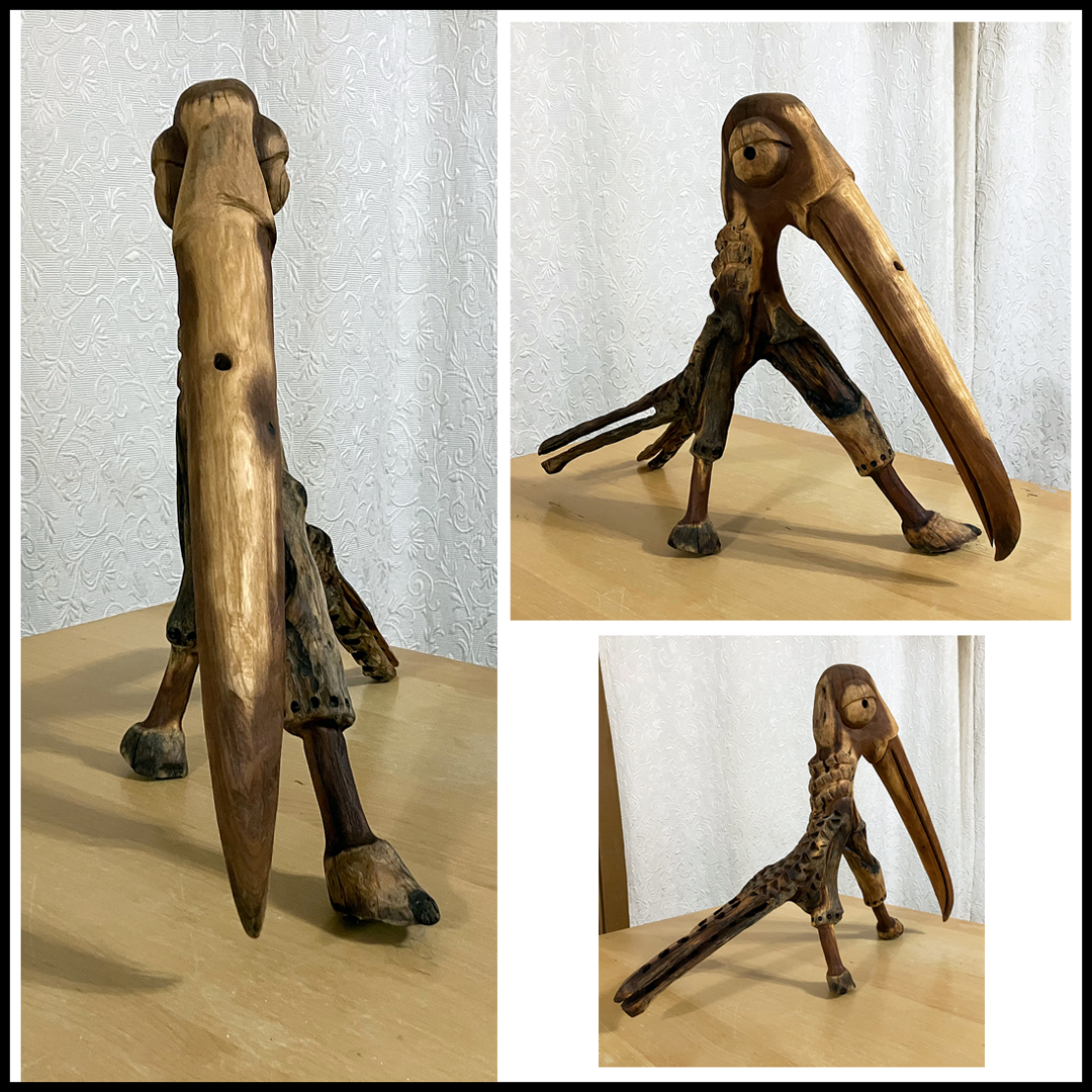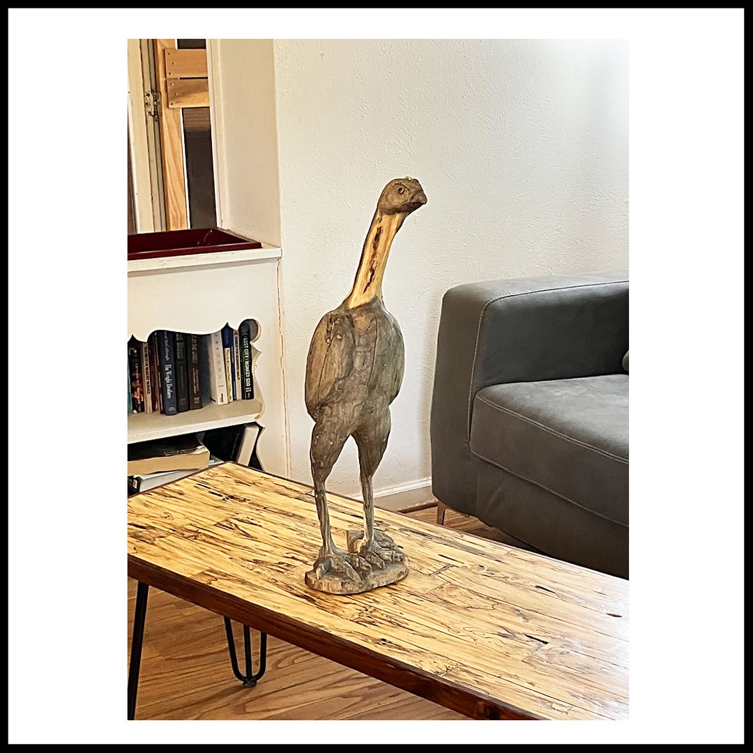 Above: Wooden bird sculpture with elongated beak, rustic finish, and Mona Lisa gaze. It watches but doesn’t speak.
