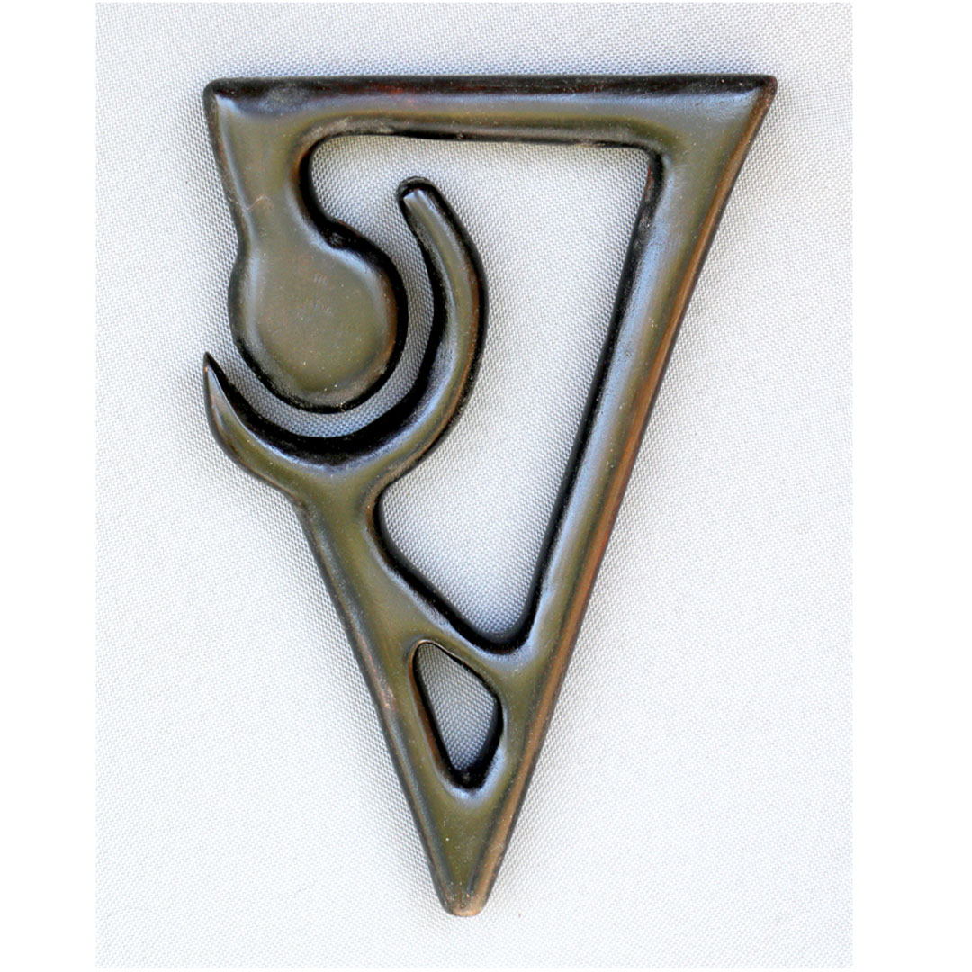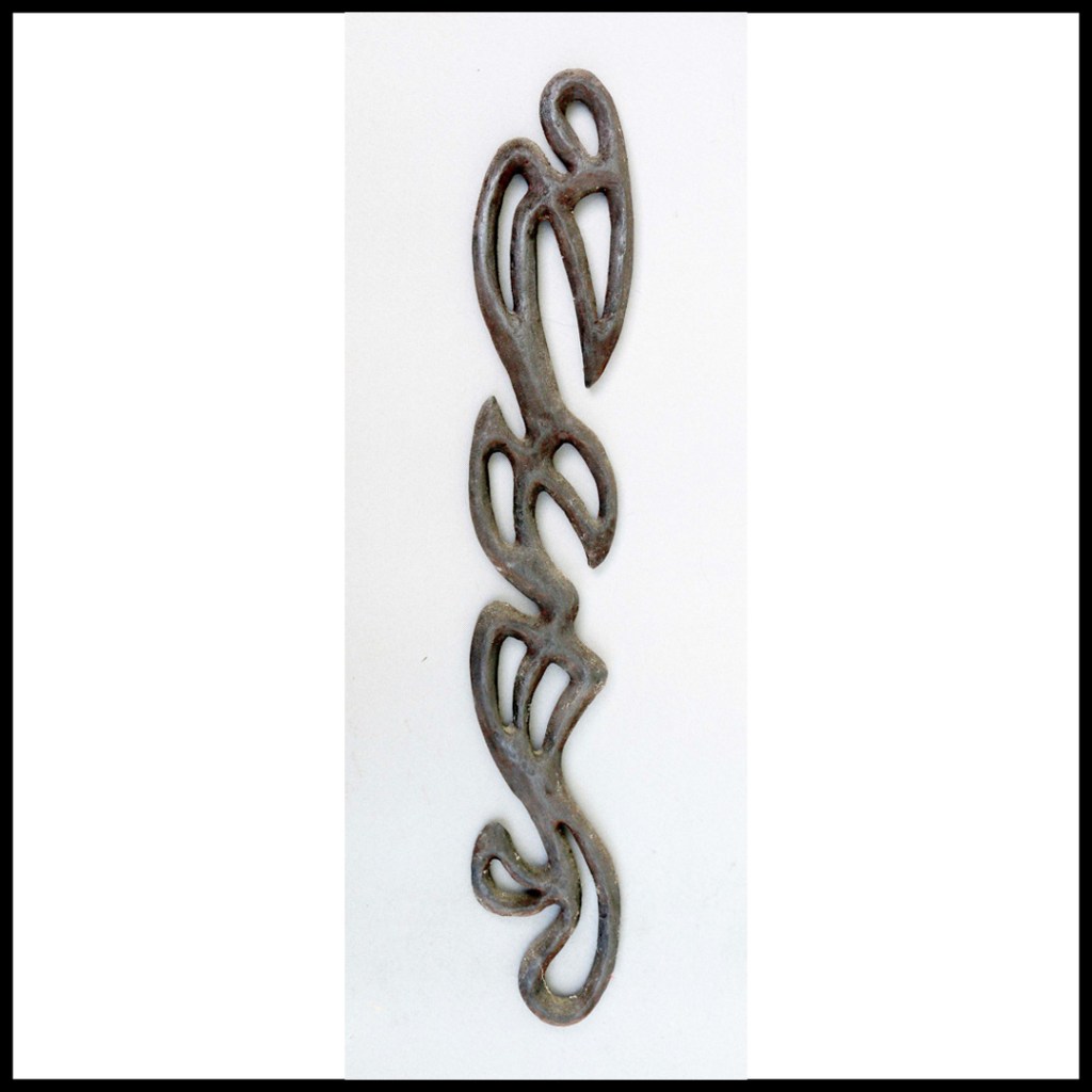 Above: This abstract wood carving features a triangular frame, perhaps a figure, that connects on its perimeter with an embracing loop.