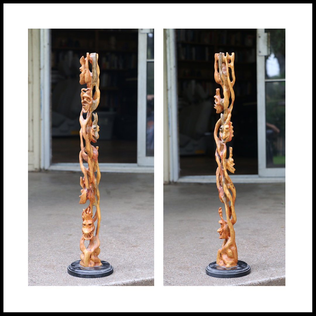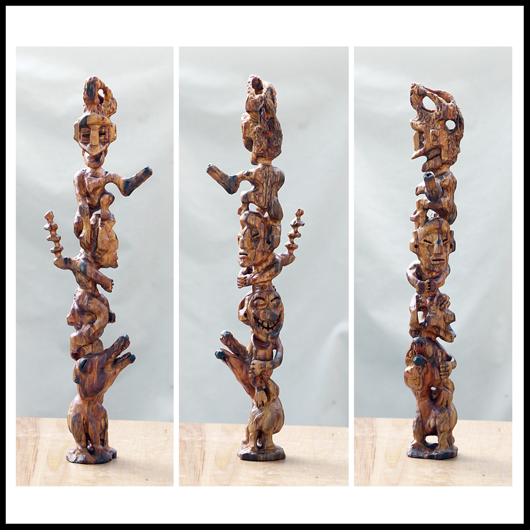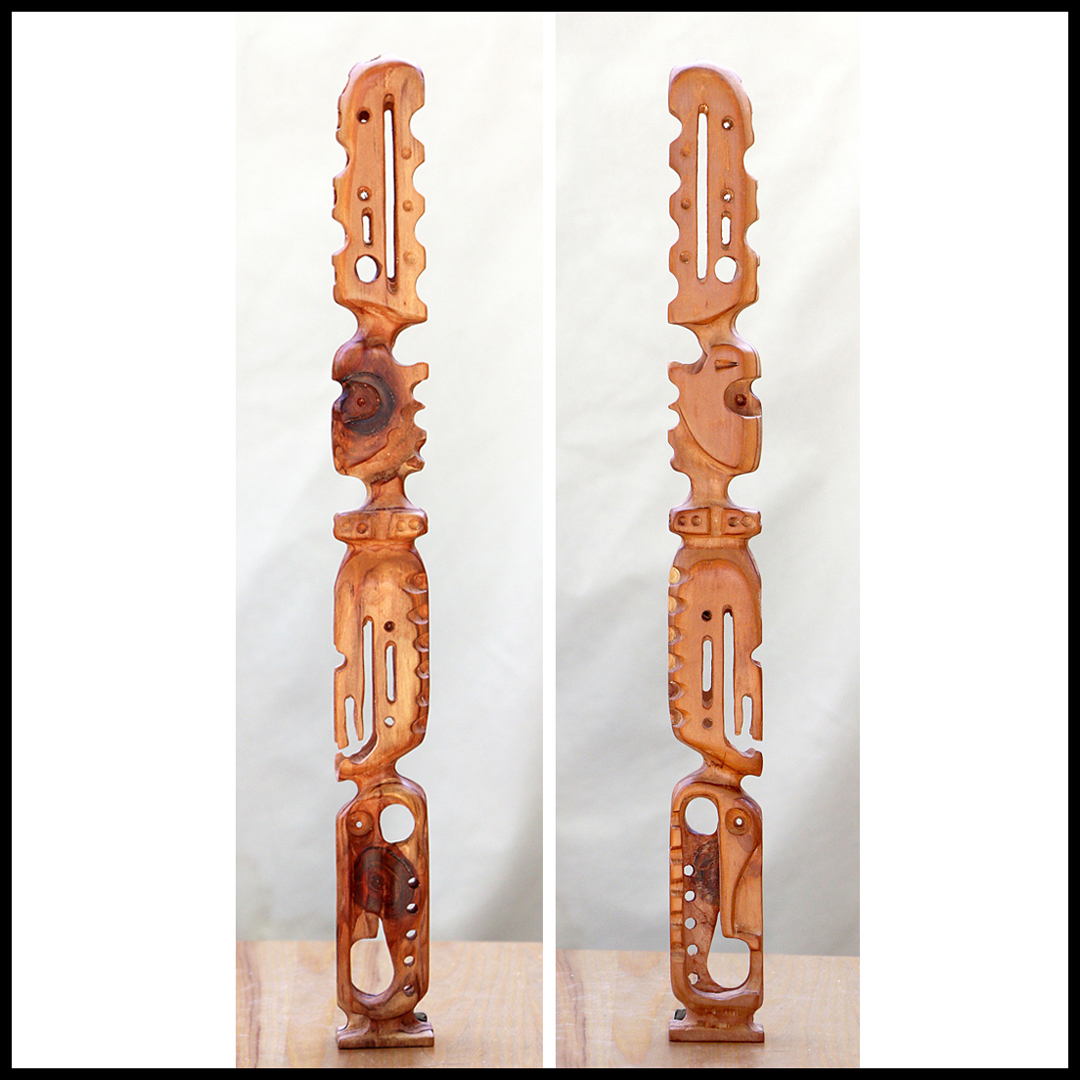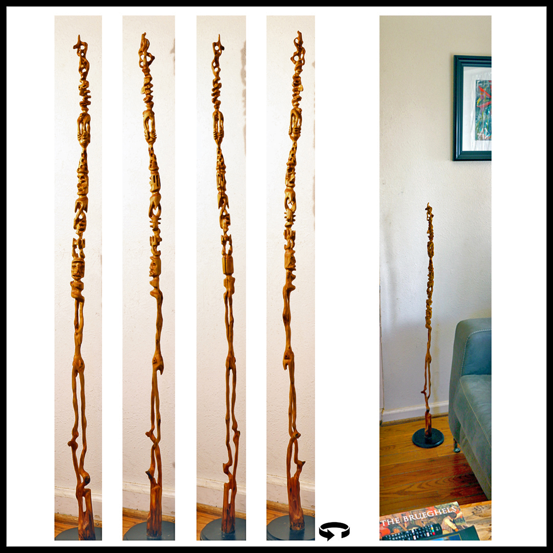 Above: Tall, narrow wood sculpture with stream of consciousness designs and motifs coming off the vertical axis. Non-repetitive and curious, it’s a vertical box of chocolates.