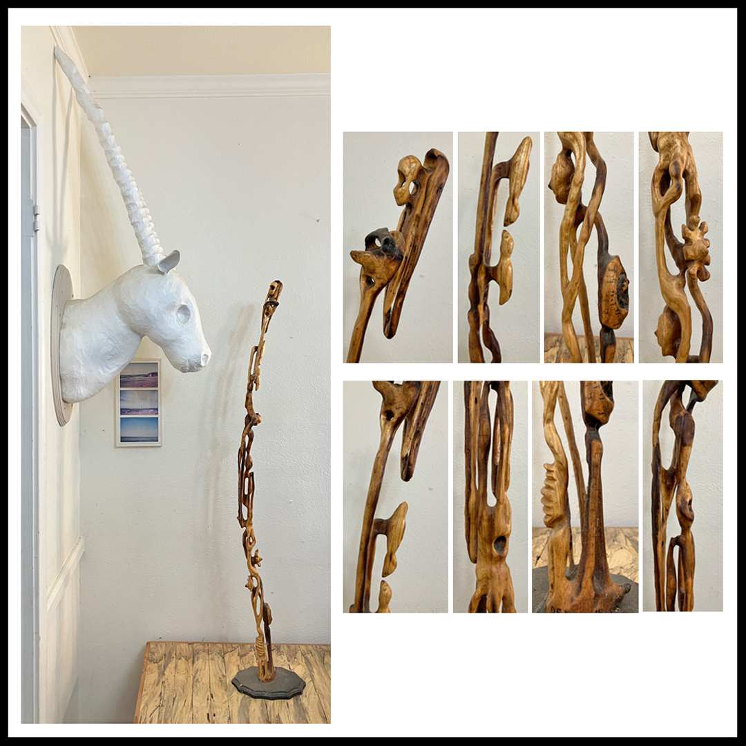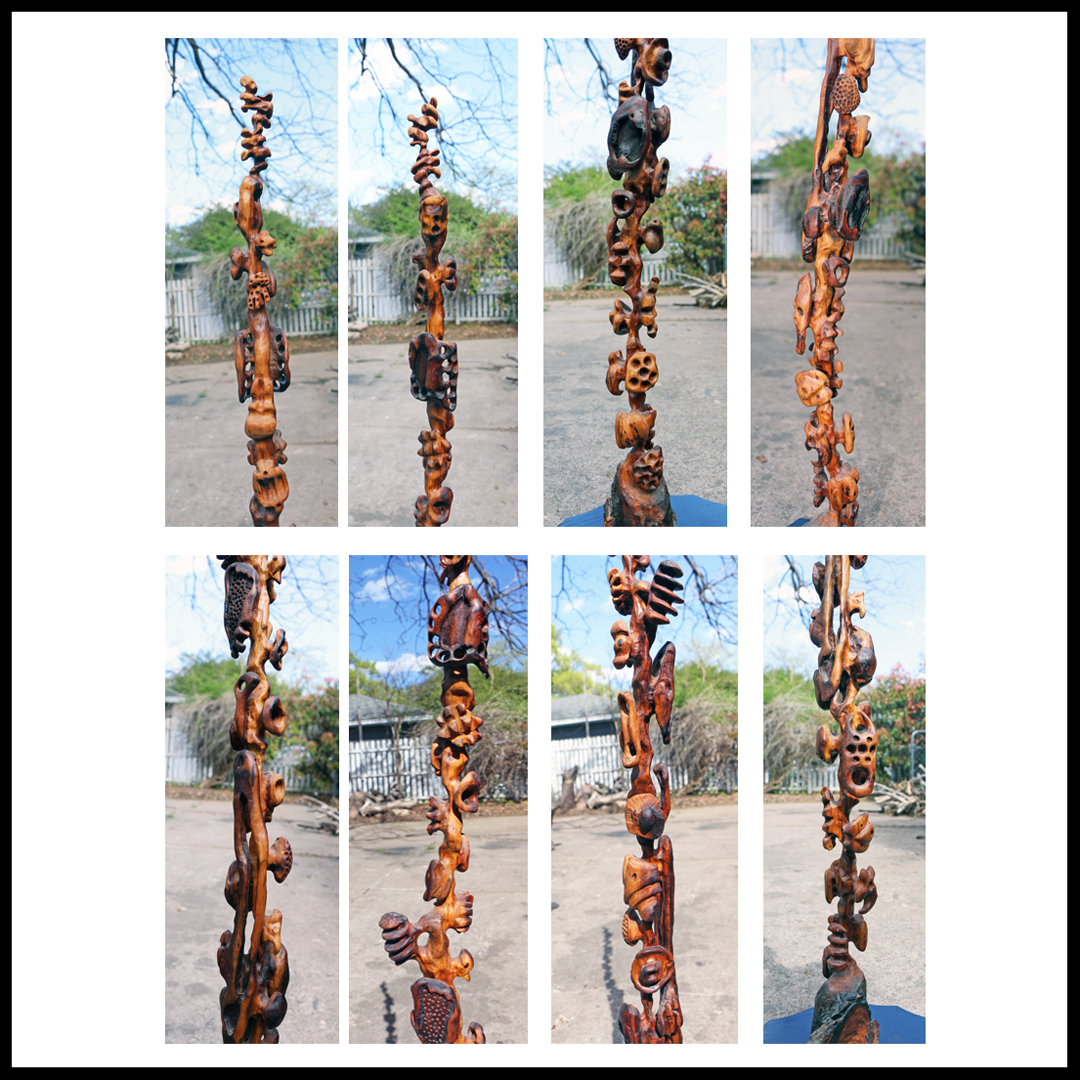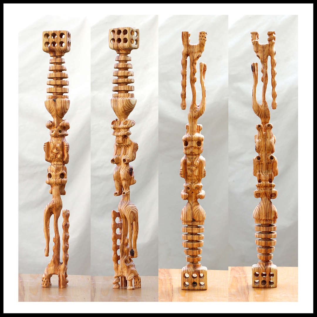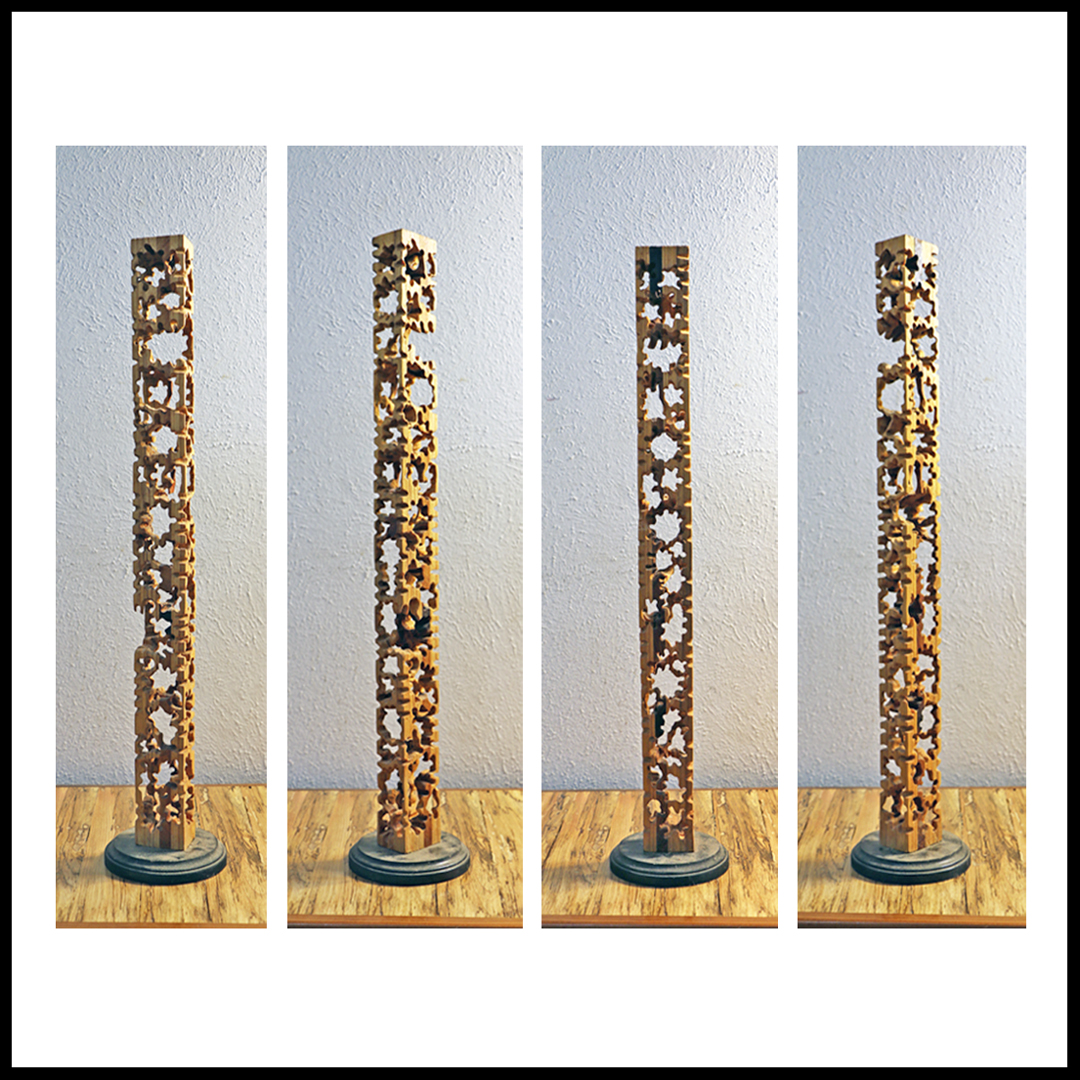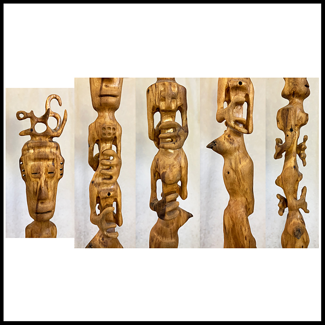 Above: Tall, narrow wood sculpture with stream of consciousness designs and motifs coming off the vertical axis. Non-repetitive and curious, it’s a vertical box of chocolates.