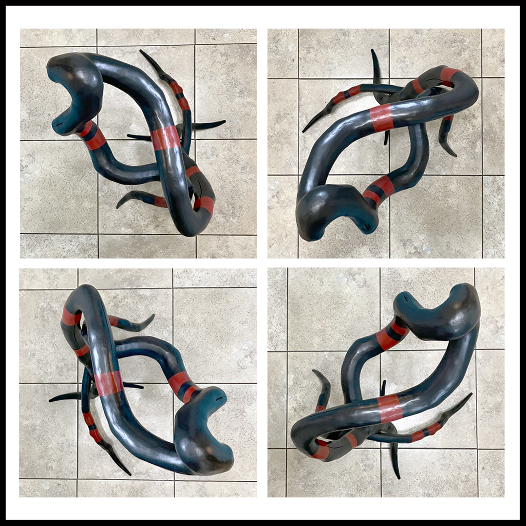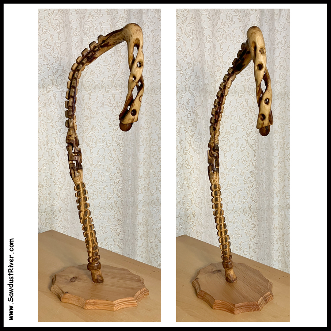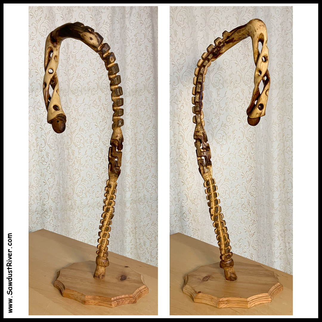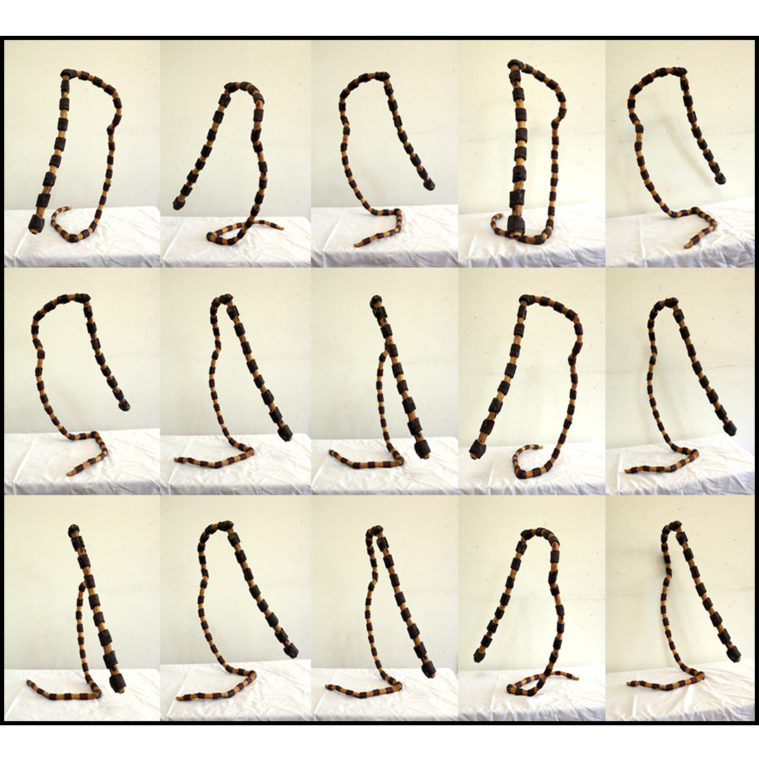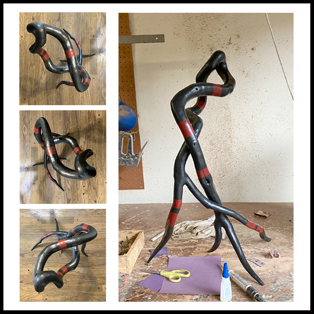 Above: 15 photos of a bent-wood serpentine sculpture, each at a slightly different angle. The carving is a single branch carved and stained with alternating dark and light patterns along its length, held up by its tail in impossible poses.