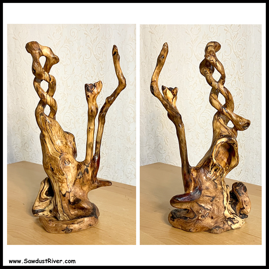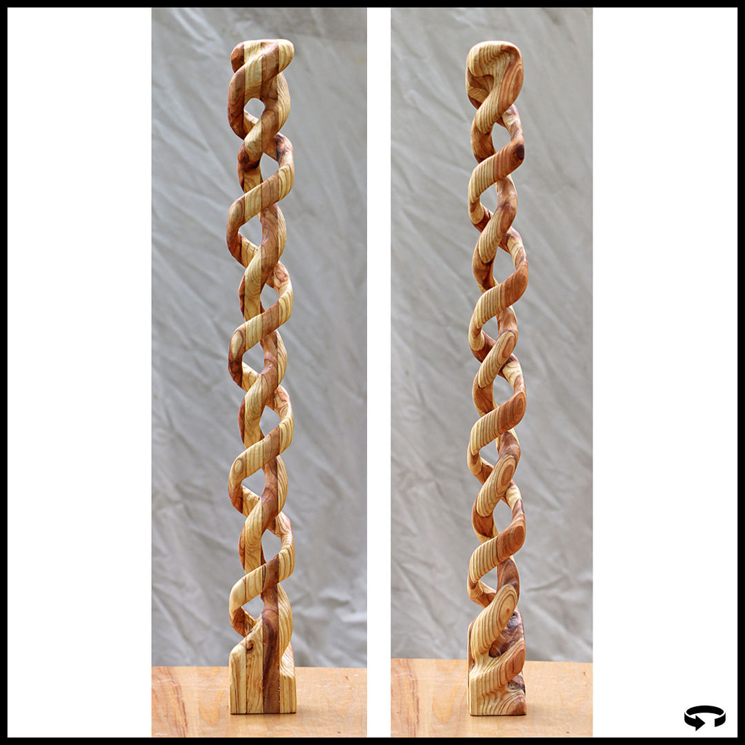 Above: Hand-carved sculpture of a right-handed spiral, carved from laminated cedar. Like a vine, the wood twists upward with perceptible unevenness.