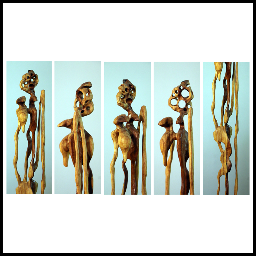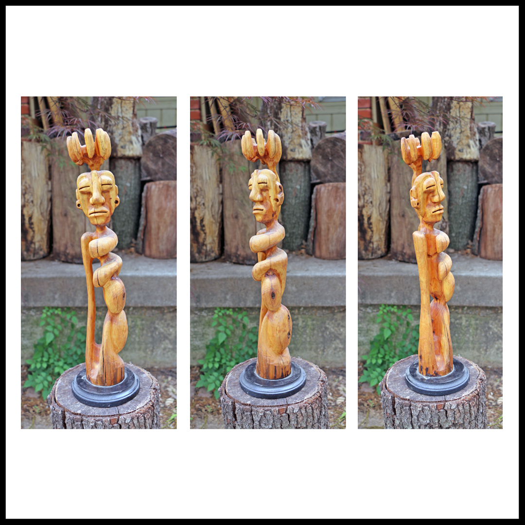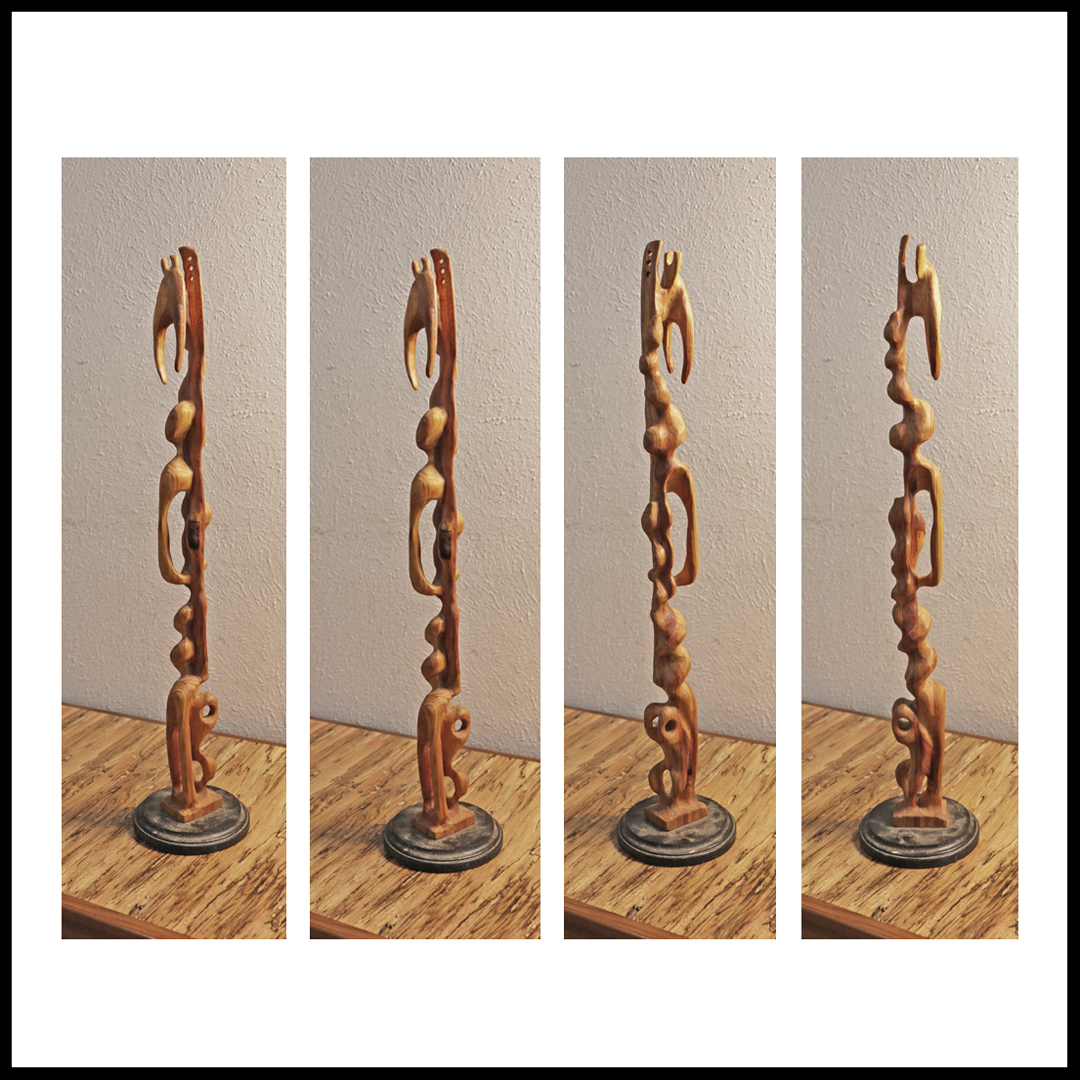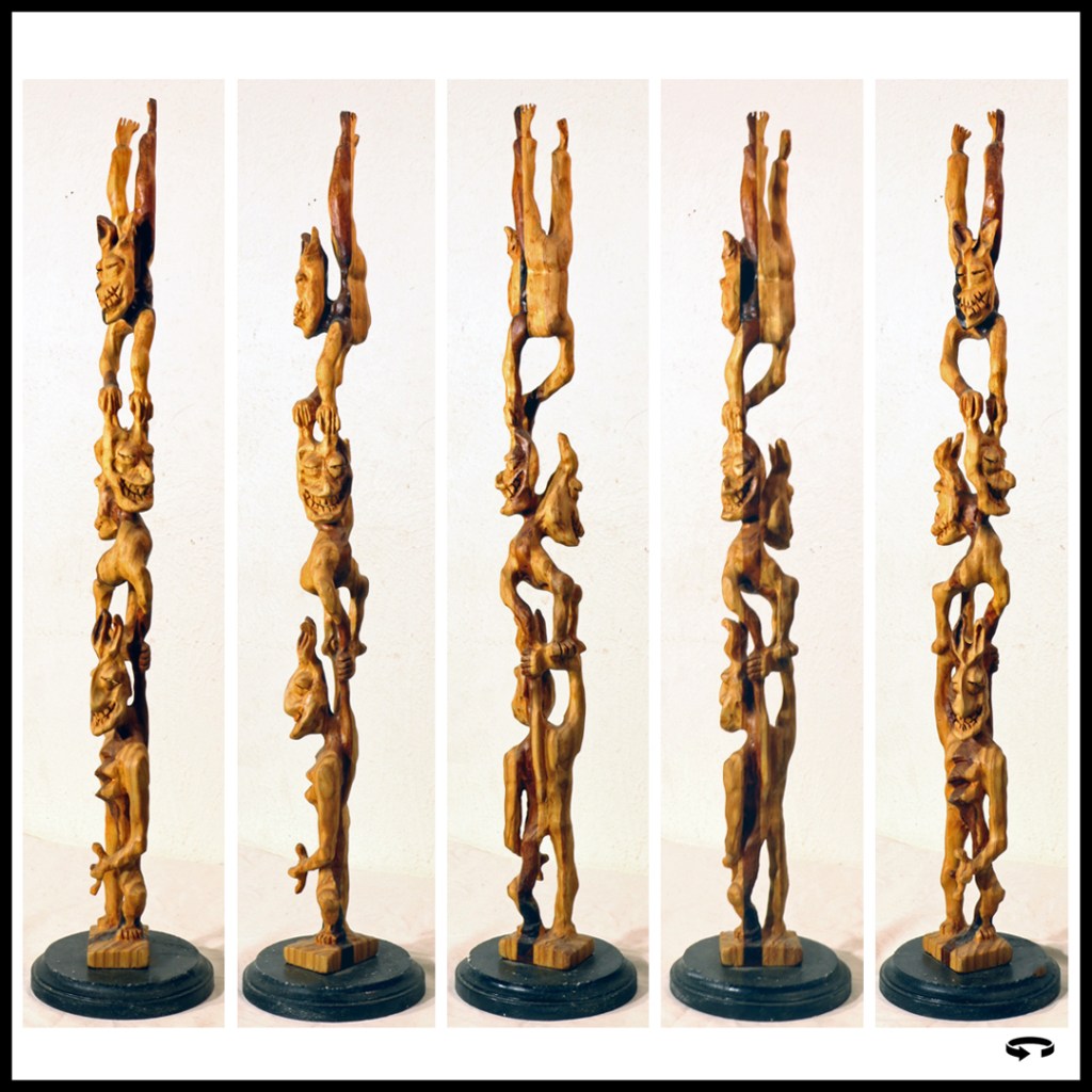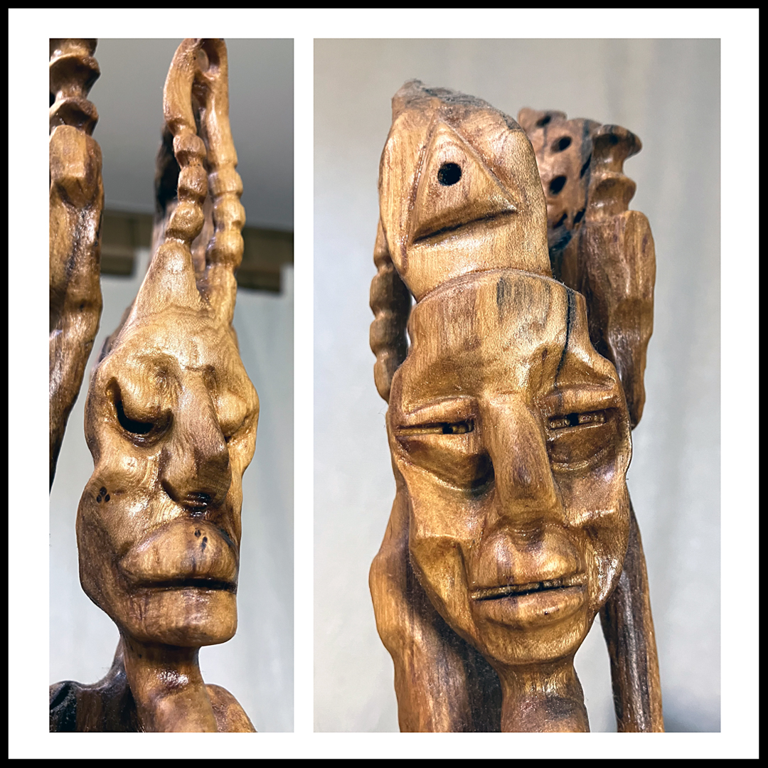 Above: This vertical wood sculpture contains three intertwined figures, ancient crowned kings perhaps, all grasping a central cord that binds them, unified in posture and tension.