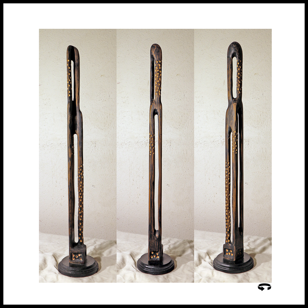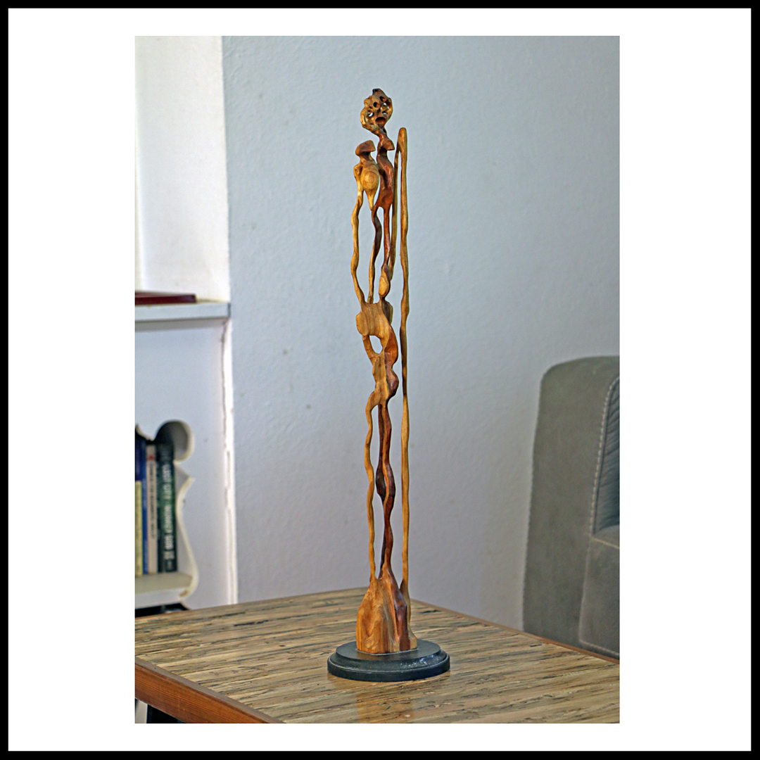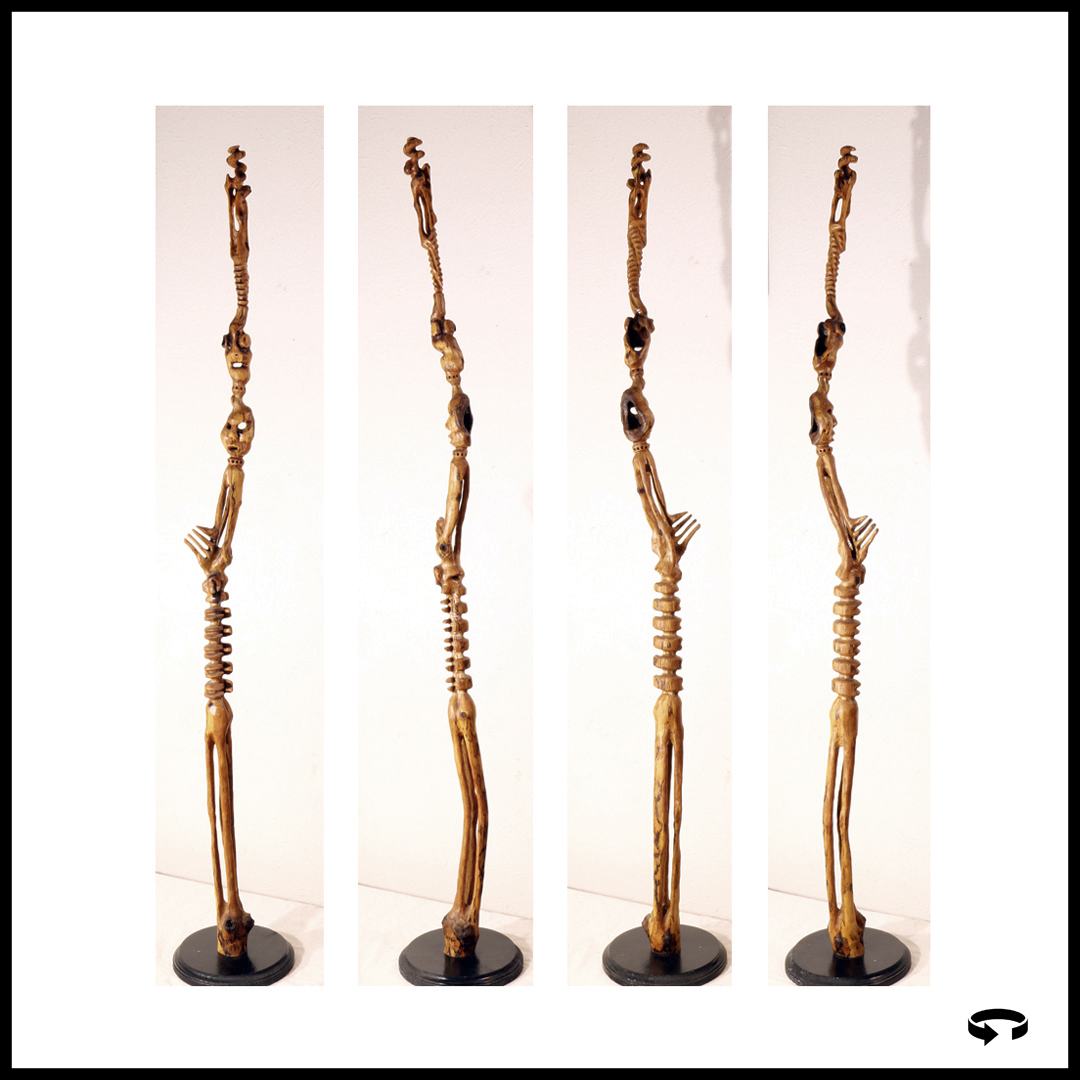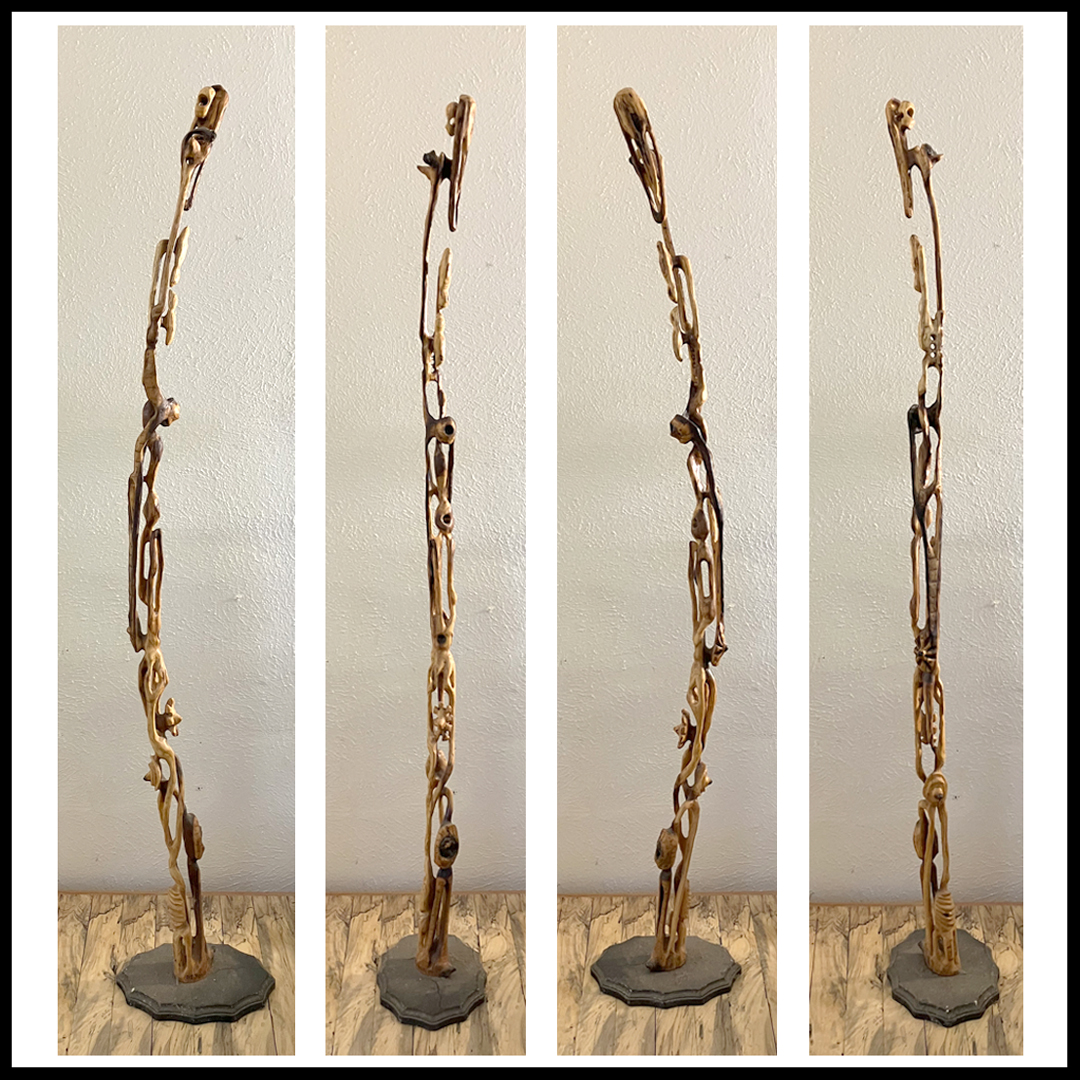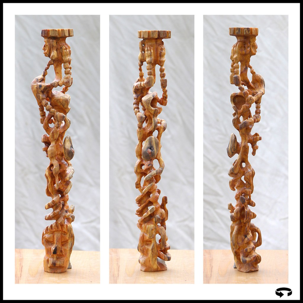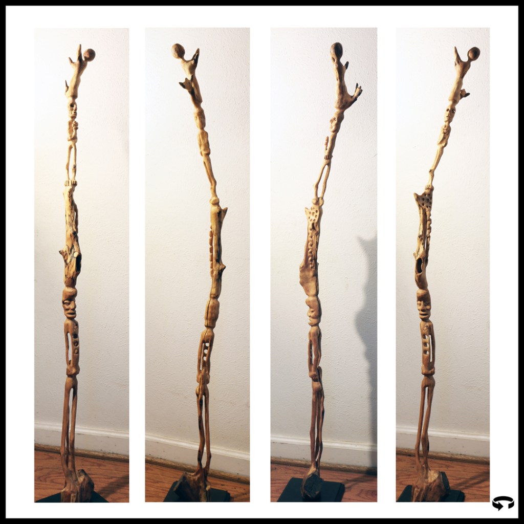 Above: This vertical wood sculpture contains three intertwined figures, ancient crowned kings perhaps, all grasping a central cord that binds them, unified in posture and tension.